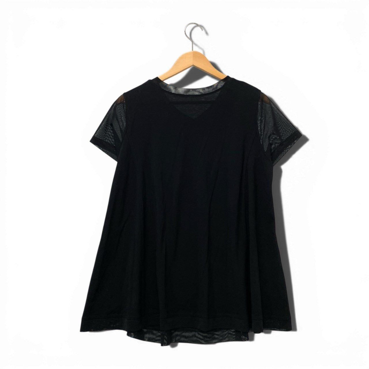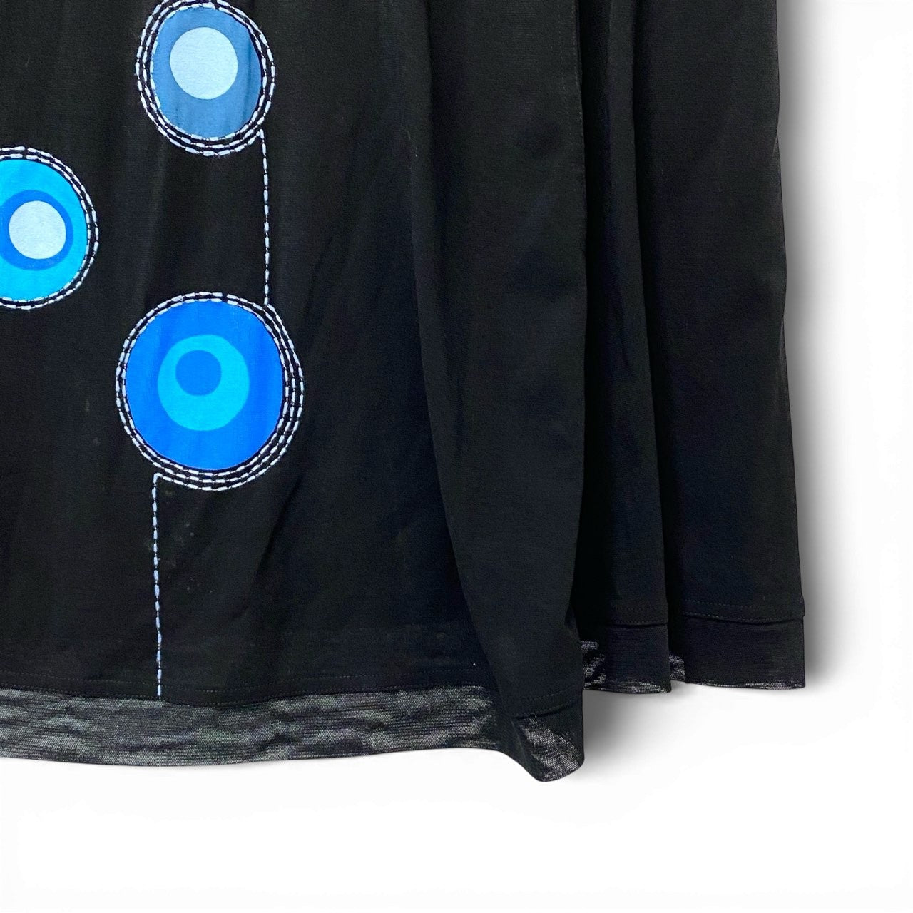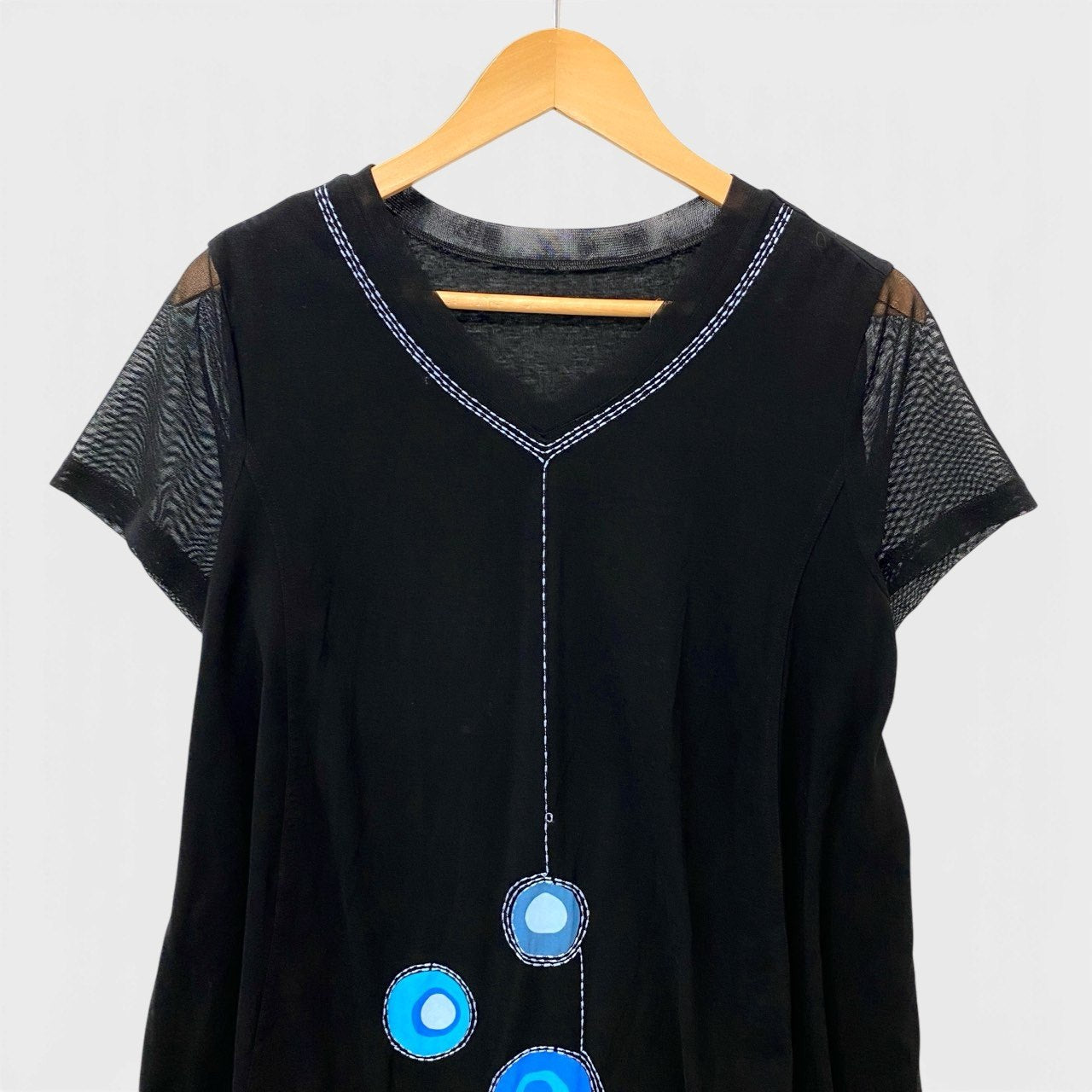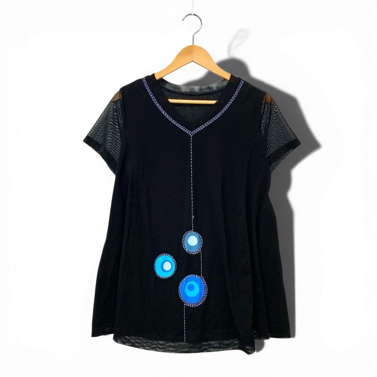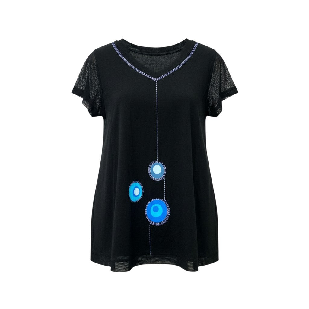 ブラックをベースに、ブルーグラデーションのサークルモチーフが映えるデザインです。 袖部分は透け感のあるメッシュ素材で、異素材切替がアクセントになっています。 Vネックにはホワイトステッチが施され、縦ラインを強調するスタイリッシュな印象。 さらりとした軽やかな素材感で、デイリーからお出かけまで活躍する一着です。