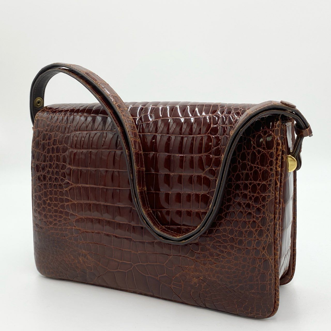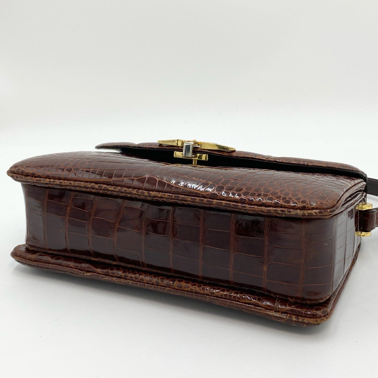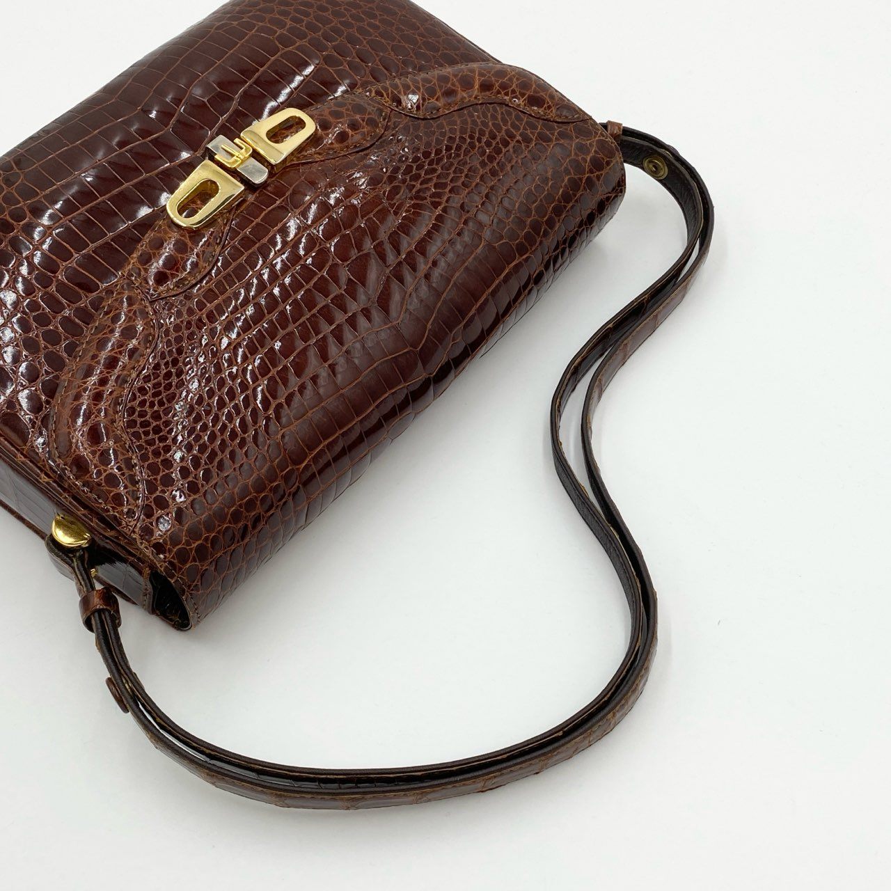 ブラウンのシャイニングクロコを使用した上質なワンショルダーバッグです。センター取りの美しい模様と光沢感が高級感を際立たせ、ゴールド金具の留め具がアクセントになっています。クラシカルでエレガントな雰囲気を演出し、パーティーや特別なシーンはもちろん、日常のコーディネートにも気品を添えます。時代を超えて長く愛用できるエキゾチックレザーの逸品です。