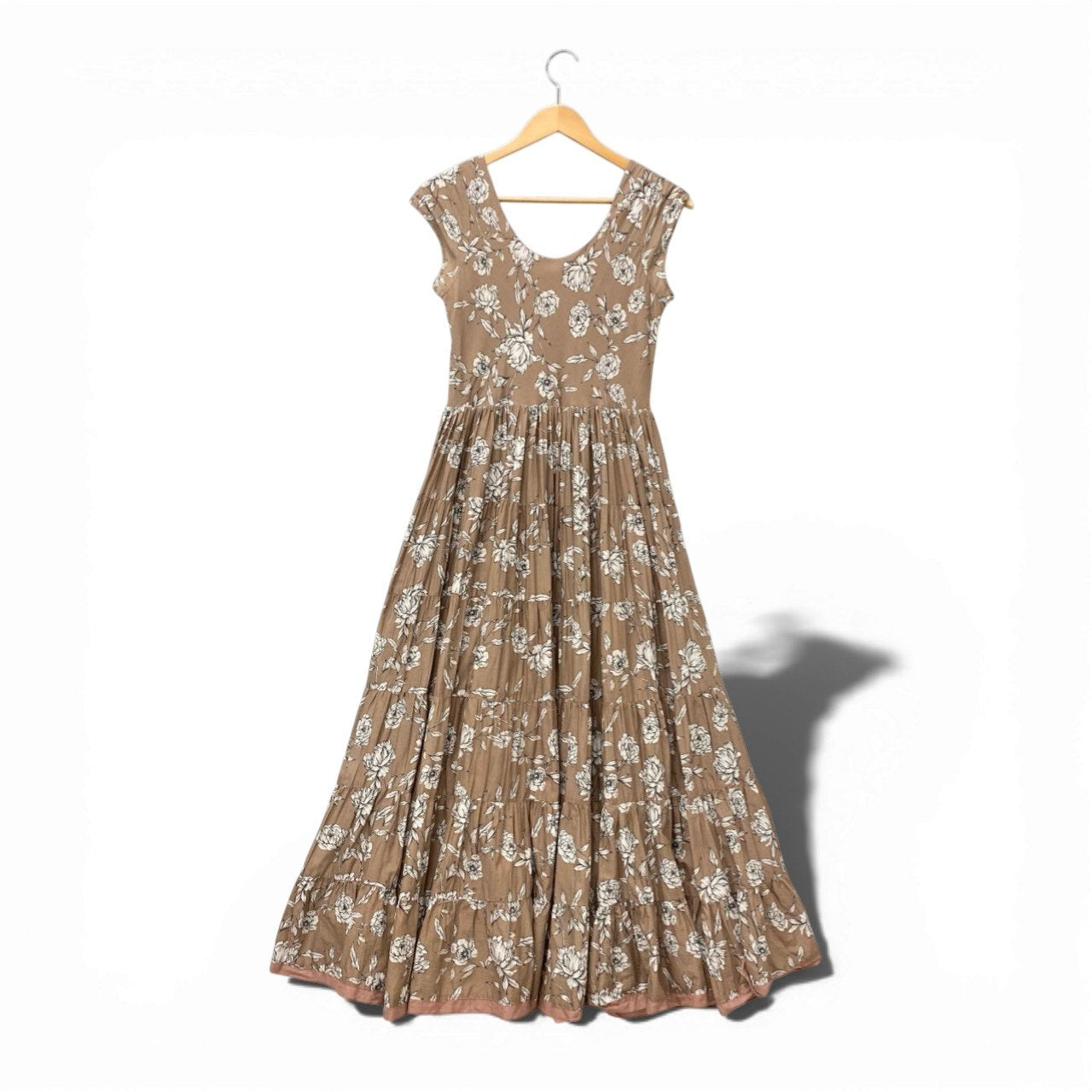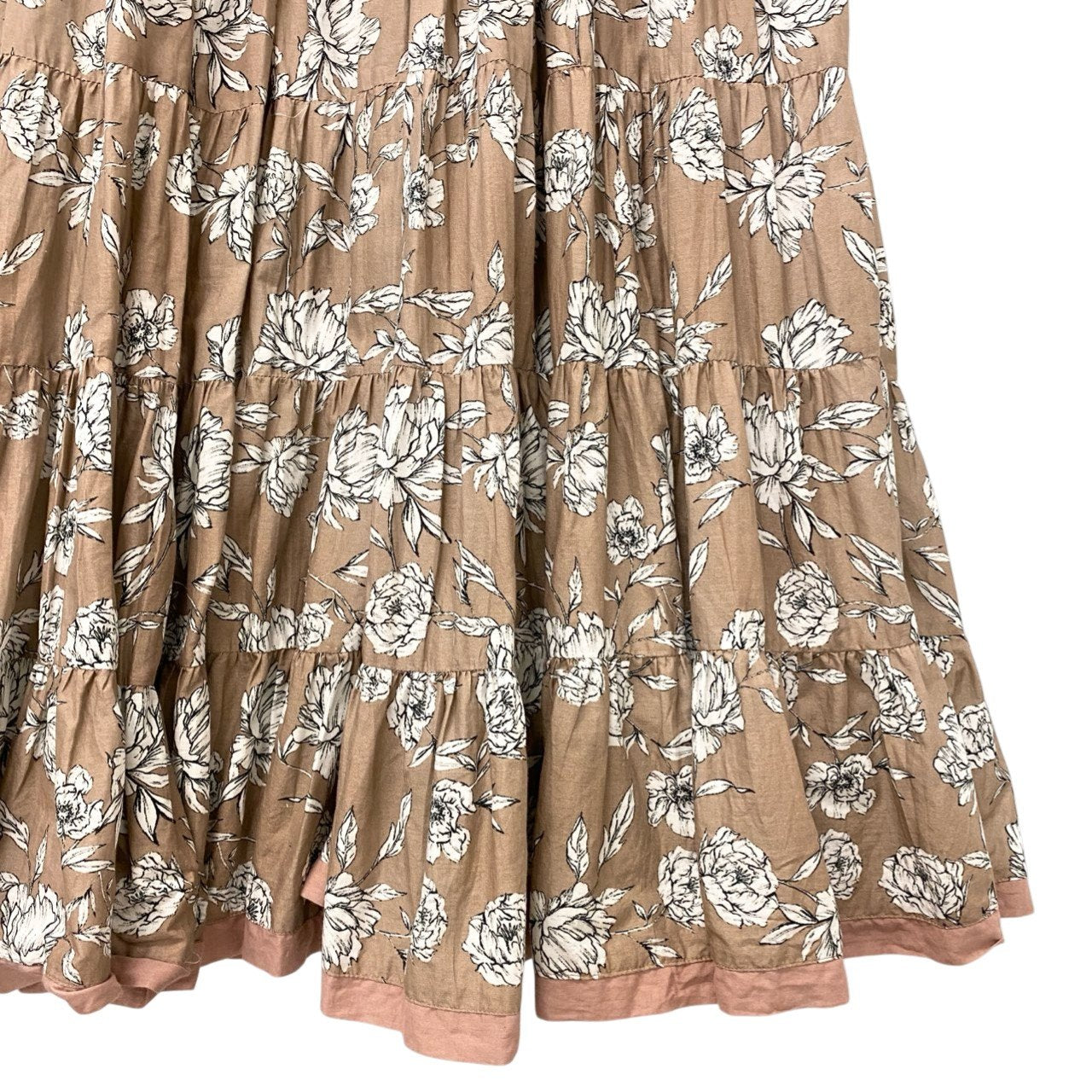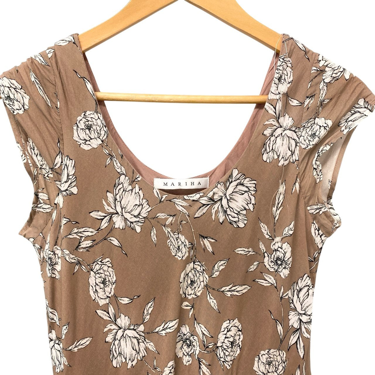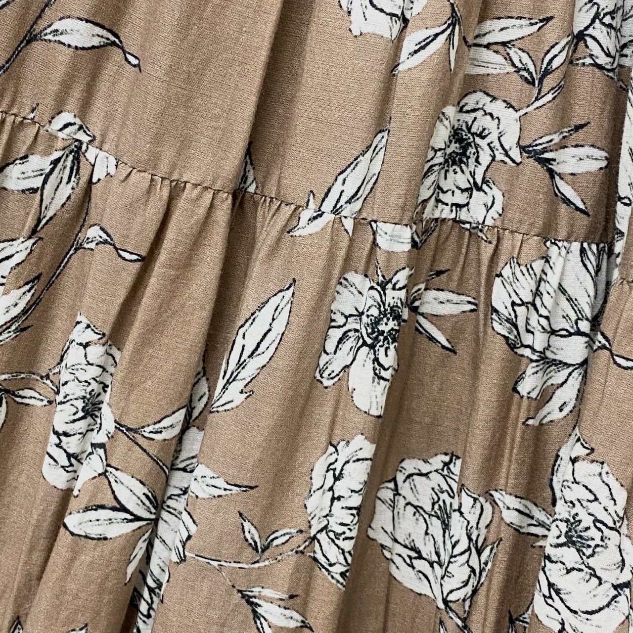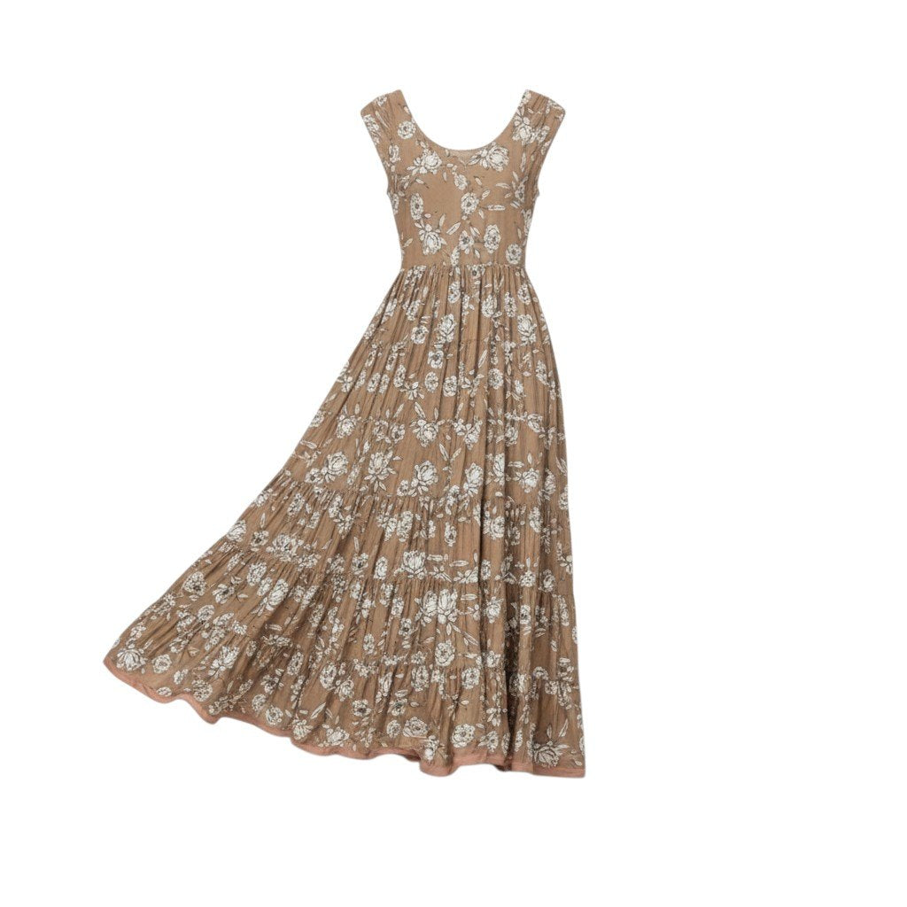 MARIHA のティアードデザインノースリーブワンピースです。カラーはスモーキーピンク〜ピンクベージュ系で、花柄プリントが優しくフェミニンな印象を演出します。素材は軽やかでナチュラルな風合いのマットなコットン生地で、ふんわりとしたティアードフレアシルエットが特徴です。リゾート感のあるデザインで、サンダルやカーディガンと合わせた夏のリラックススタイルにもおすすめの一着です。