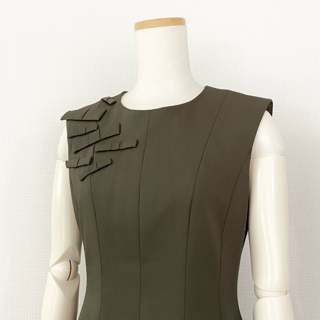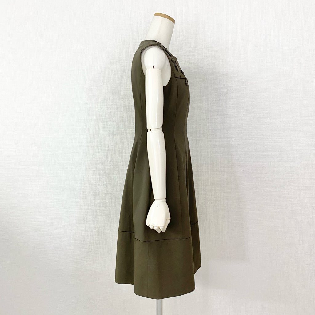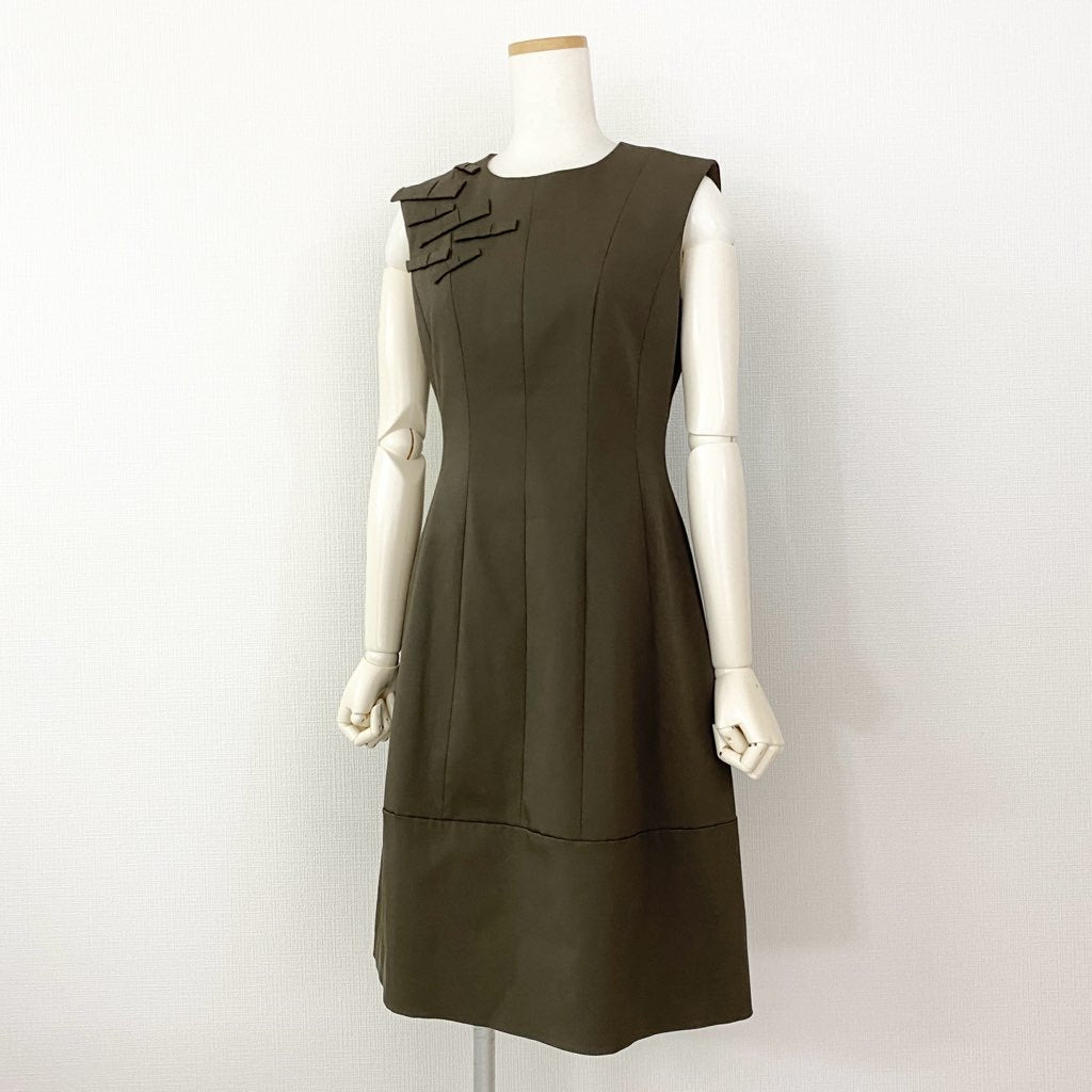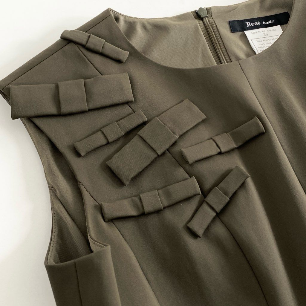 43f18 《美品》 日本製 Rene ルネ リボン装飾 ノースリーブワンピース ドレスワンピース 膝丈ワンピース 5636220 サイズ36 カーキ系 レディース