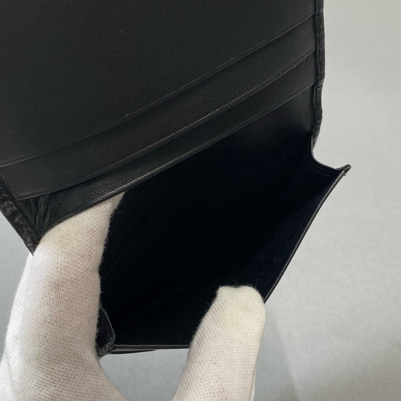 ブリオーニの高級カードケースで、希少なワニ革を使用した逸品です。写真からは深みのあるダークグリーンに近いブラックカラーが確認でき、光の加減で奥行きのある光沢を放ちます。ワニ革特有の立体的な鱗模様がラグジュアリーな存在感を演出。シンプルなデザインながら強い高級感が漂い、ビジネスシーンや大切な場面で格調高い印象を与えるアイテムです。
