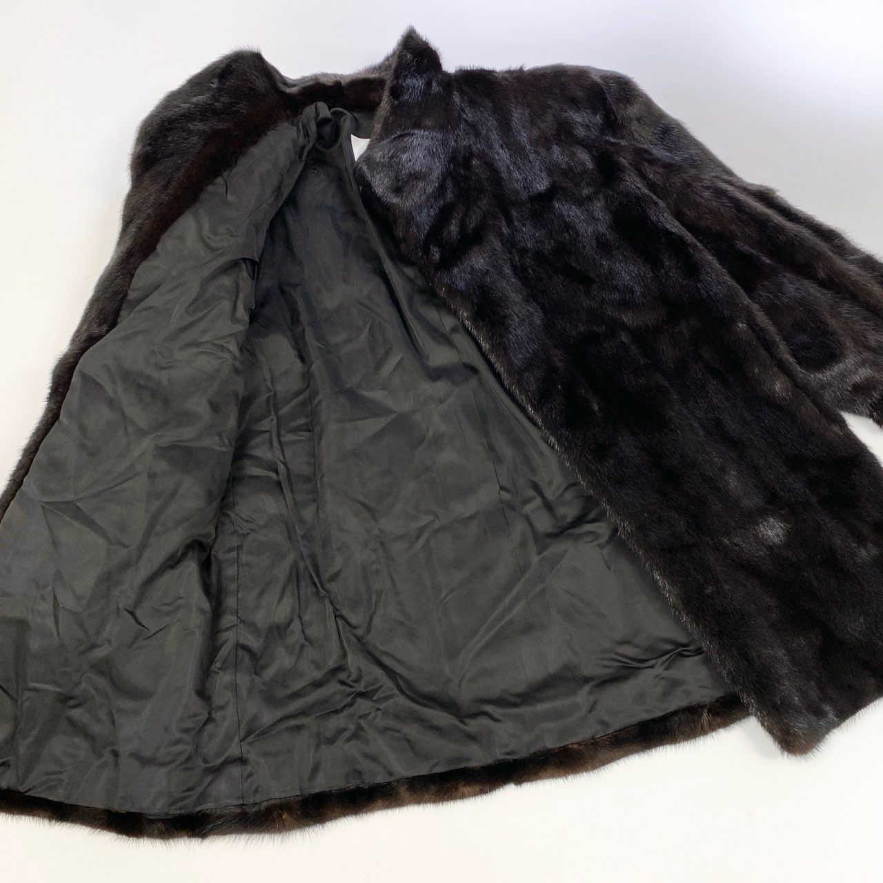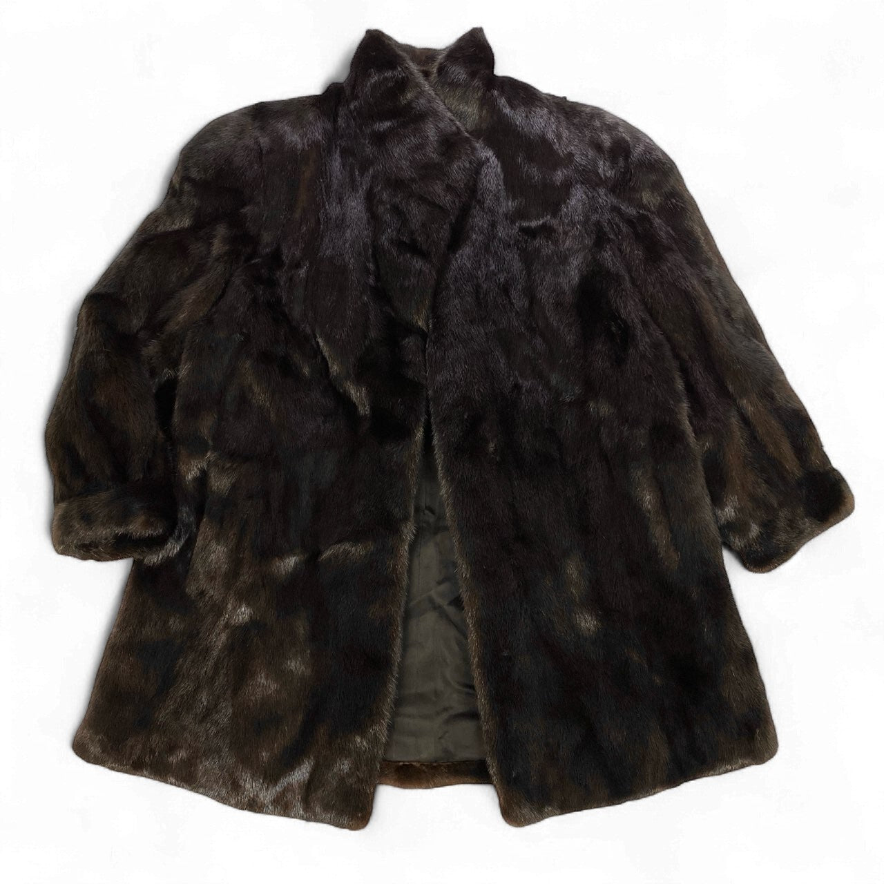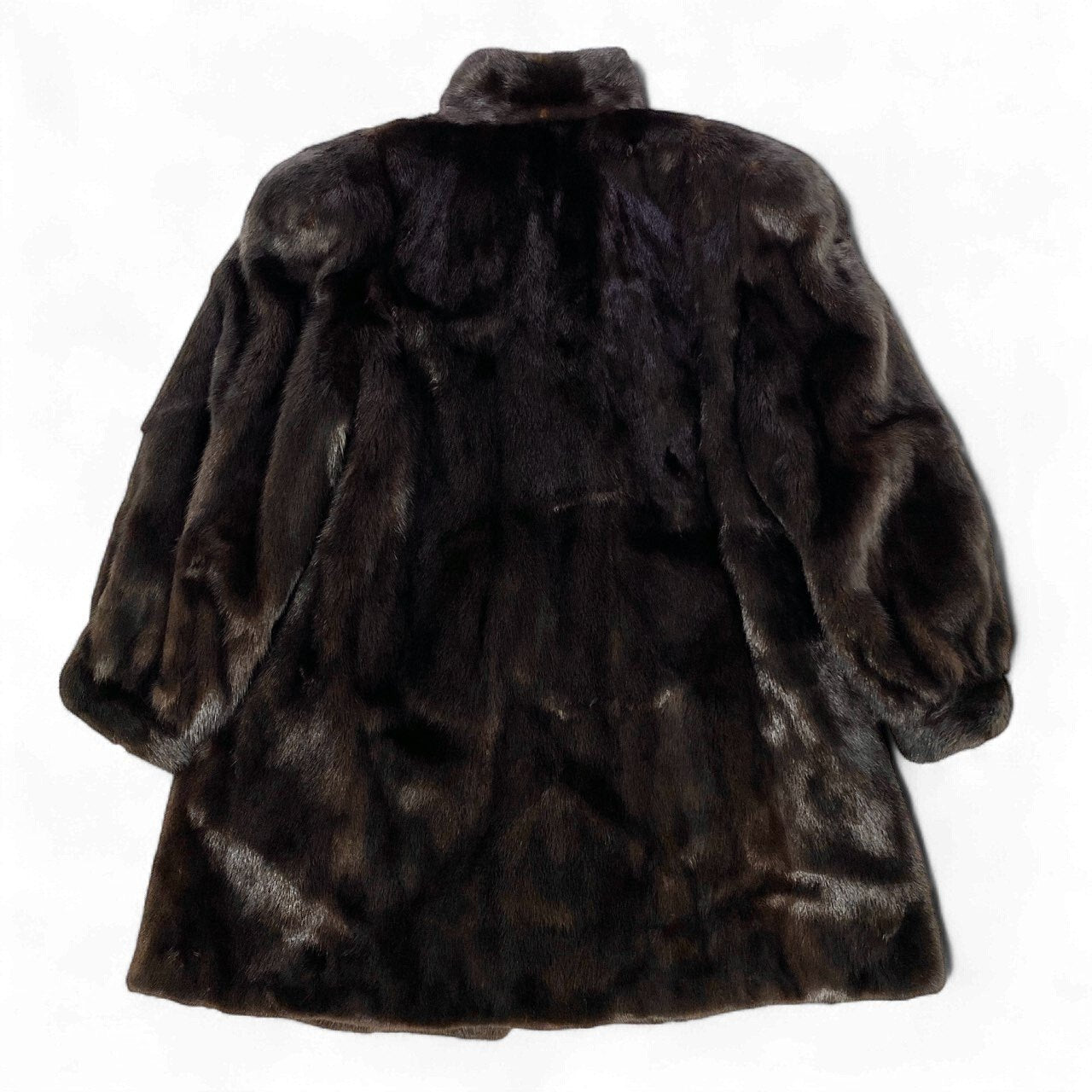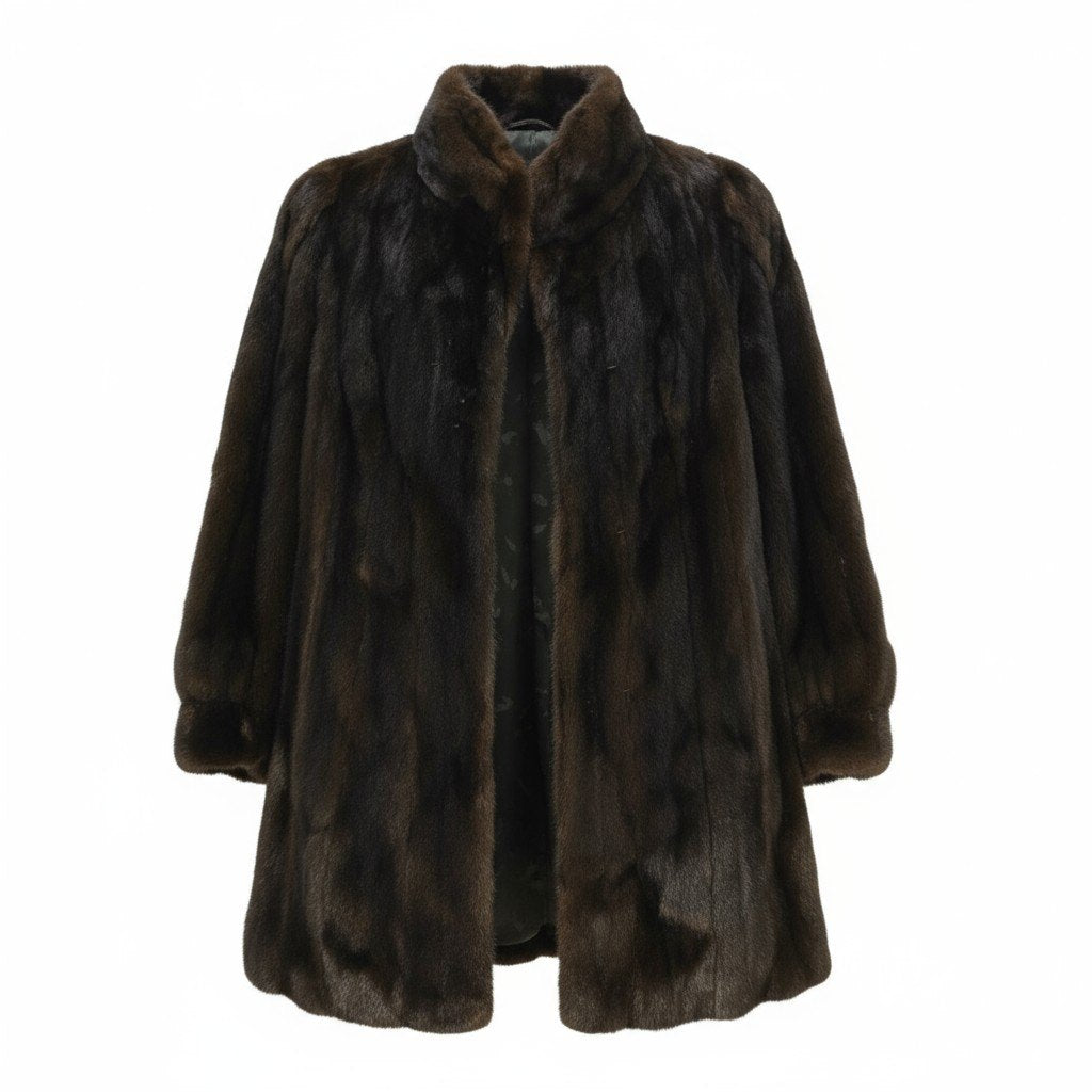 深みのあるダークブラウンのミンクファーが上品な艶を放つ、セミロング丈の毛皮コートです。毛並みは非常に滑らかで高級感があり、光の当たり方で美しい濃淡が浮かぶリッチな質感が魅力。シンプルなAラインシルエットで、ワンピースからパンツスタイルまで幅広く合わせやすいデザインです。軽量で暖かく、冬の特別なシーンはもちろん、普段の装いにも取り入れやすい一着。クラシックで長く愛用できる、上質なミンクコートをお探しの方におすすめです。