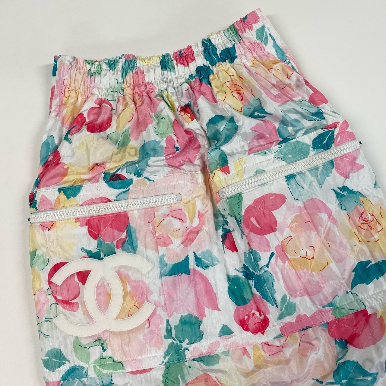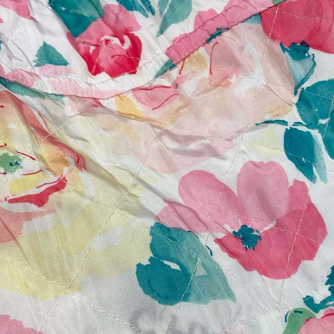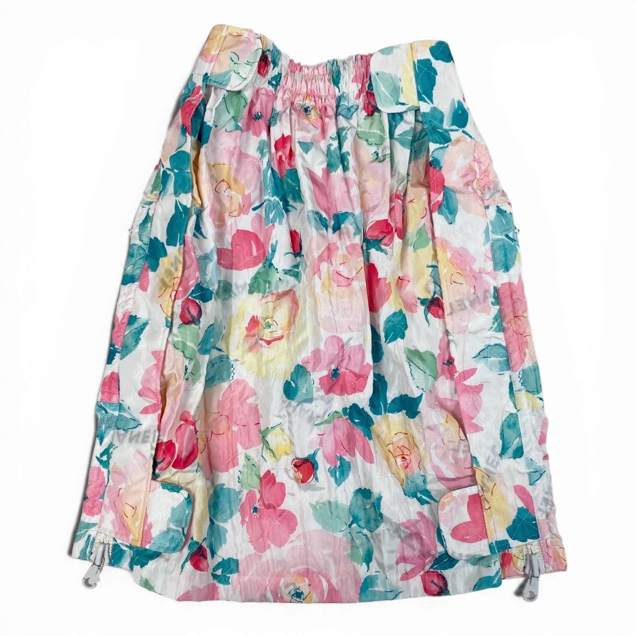 アイボリーホワイトをベースに、ピンク・ローズレッド・イエロー・ターコイズグリーンが映える華やかなフラワー柄デザイン。 光沢のある軽やかなナイロン素材で、シャカっとした質感が特徴です。 フロントには立体的なビッグココマーク、ジップポケットやサイドスリットがスポーティーなアクセントに。 1995年ヴィンテージらしいリゾートムード漂う一着で、Tシャツやタンクトップと合わせた夏スタイルにおすすめです。