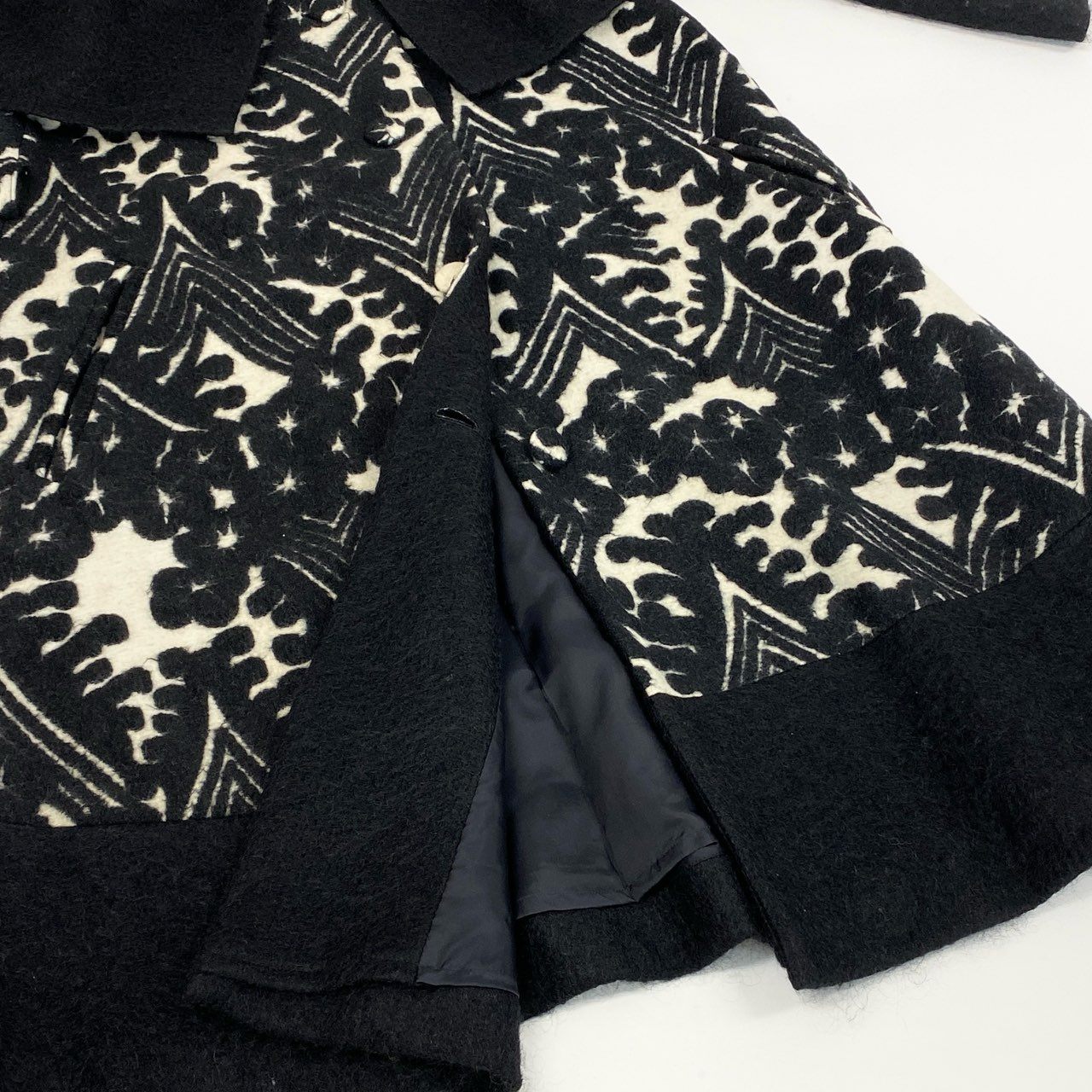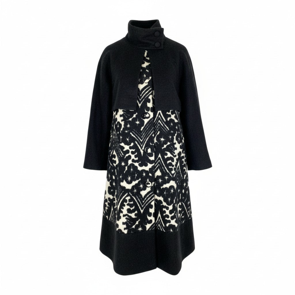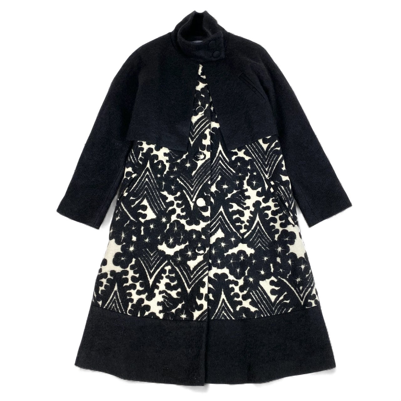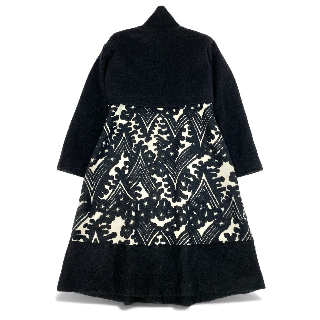 色は深いブラックを基調とし、フロントにはアイボリー×ブラックのアート柄ジャカードが印象的なドッキングデザインです。 上半身にはマットウール混のブラックジャケット風パーツを重ねた立体構造で、トクコらしい個性的かつエレガントな雰囲気を演出します。 ハイネックのくるみボタンディテールが上品で、防寒性も高められています。 裾に向かって広がるAラインシルエットで体型を拾いにくく、お出かけ・観劇・フォーマル寄りのシーンにもマッチする存在感のある一着です。