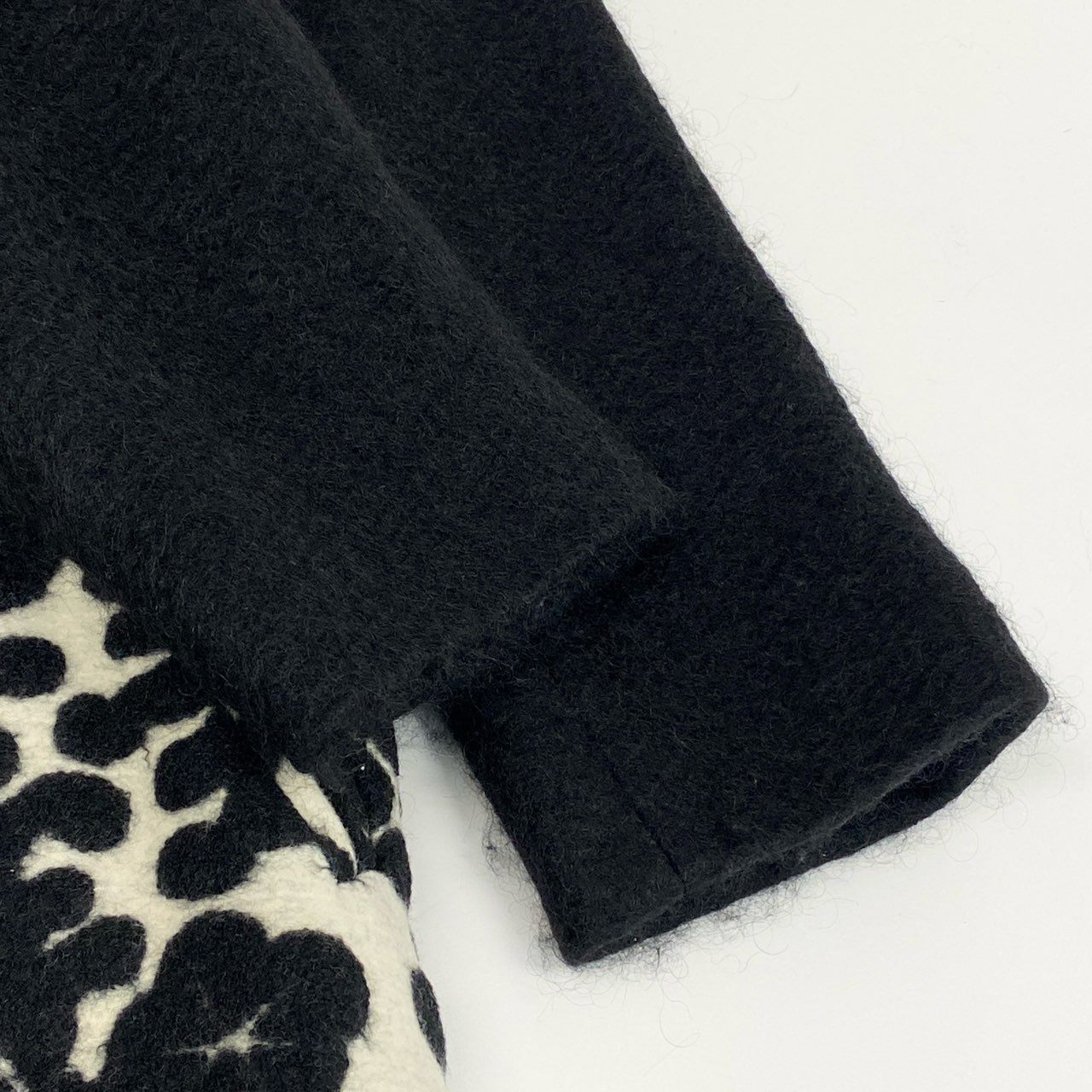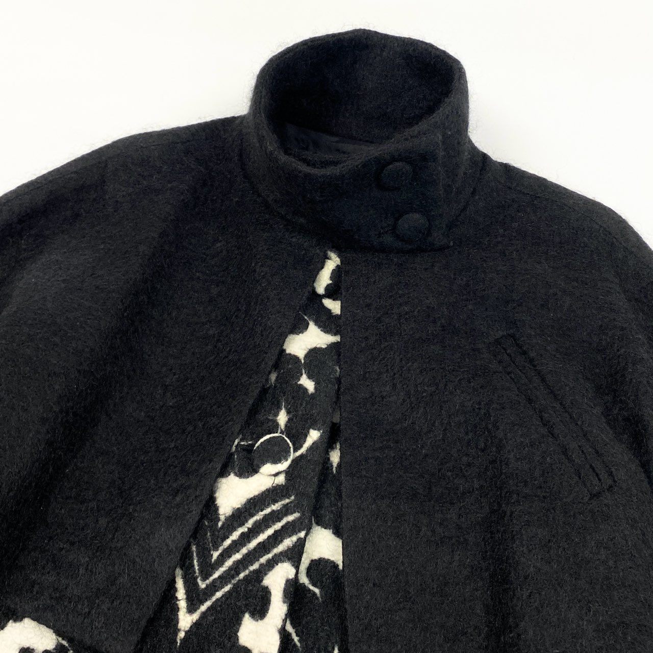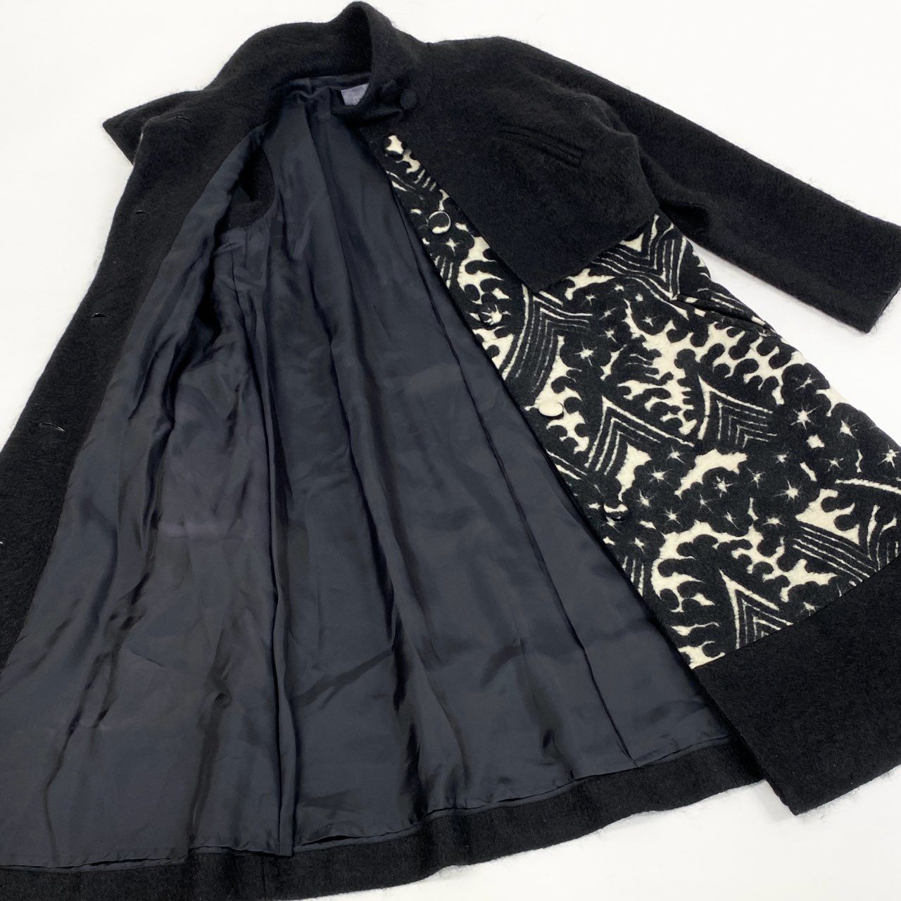色は深いブラックを基調とし、フロントにはアイボリー×ブラックのアート柄ジャカードが印象的なドッキングデザインです。 上半身にはマットウール混のブラックジャケット風パーツを重ねた立体構造で、トクコらしい個性的かつエレガントな雰囲気を演出します。 ハイネックのくるみボタンディテールが上品で、防寒性も高められています。 裾に向かって広がるAラインシルエットで体型を拾いにくく、お出かけ・観劇・フォーマル寄りのシーンにもマッチする存在感のある一着です。