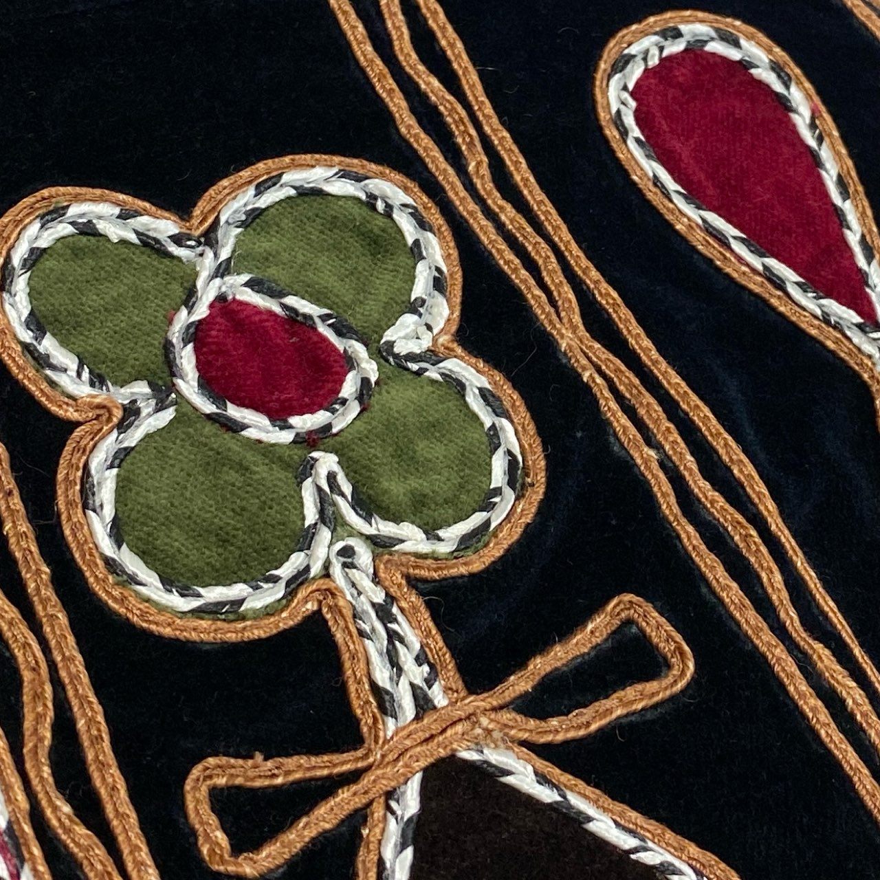 Christian Diorの刺繍ショートパンツです。ミッドナイトネイビーのベルベット素材に、レッド・オリーブグリーン・パープルの幾何学モチーフ刺繍が大胆に施されたラグジュアリーなデザイン。ゴールドトーンのコード刺繍が縁取られ、立体感と華やかさを演出しています。毛足のあるベルベット特有の上品な光沢が高級感を引き立て、コレクションピースのような存在感。シンプルなトップスと合わせるだけで主役級のスタイリングが完成する一着です。