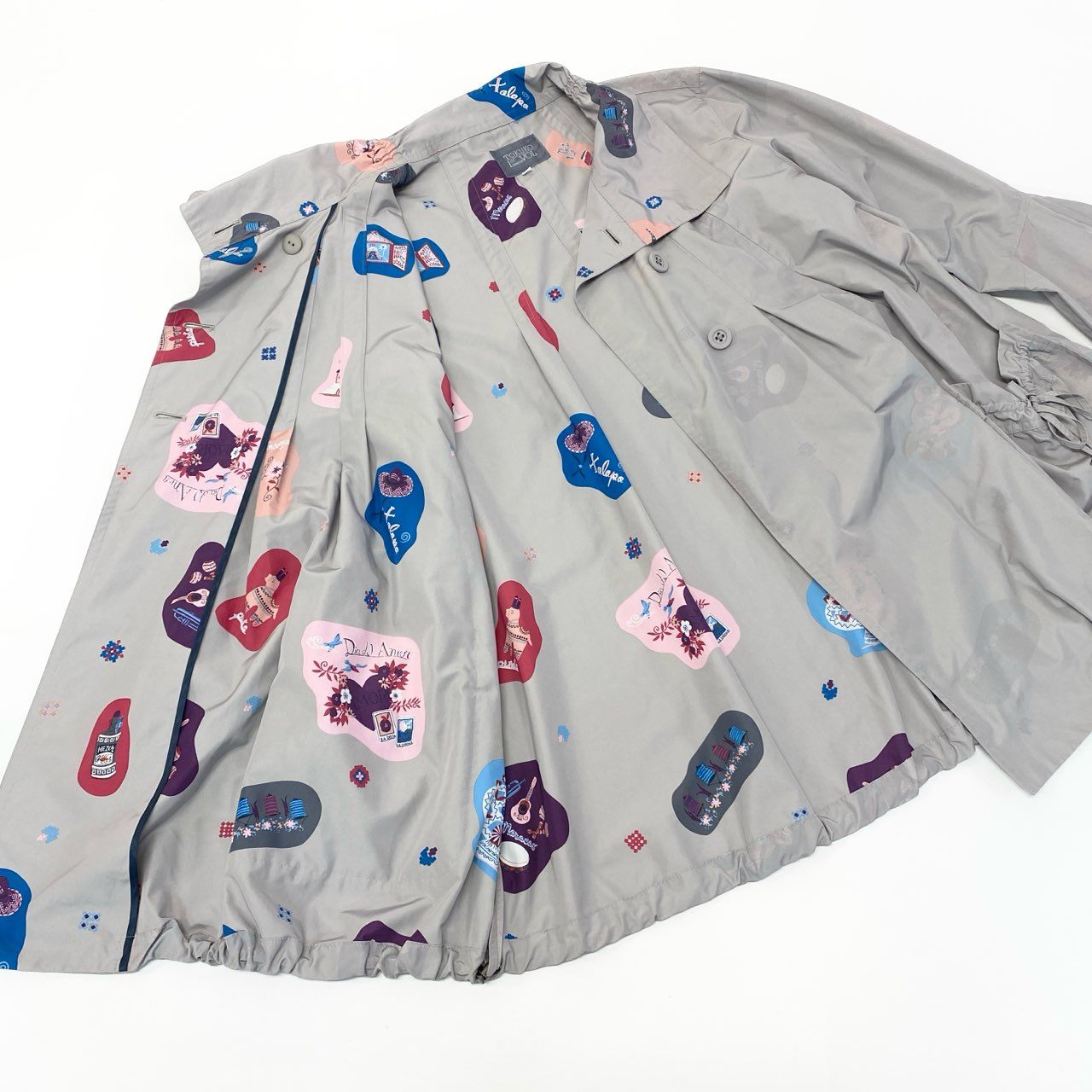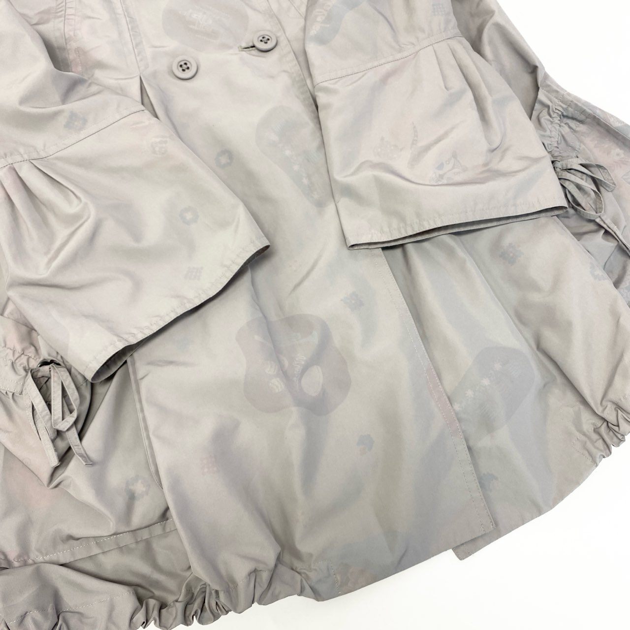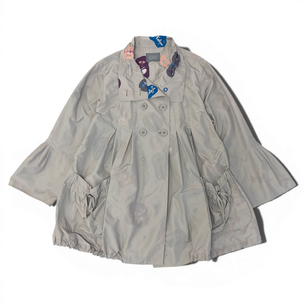 ややグレージュ寄りのライトベージュカラーが上品な印象の薄手コートです。全体にはブランドらしい総柄デザインがさりげなく入っており、シンプルながら個性を感じさせます。マットな質感のポリエステル素材で、軽やかに羽織れる一着です。Aラインシルエットとフレアスリーブ、ポケットのギャザーディテールが女性らしく、普段使いからお出かけ、旅行時の羽織としても活躍します。