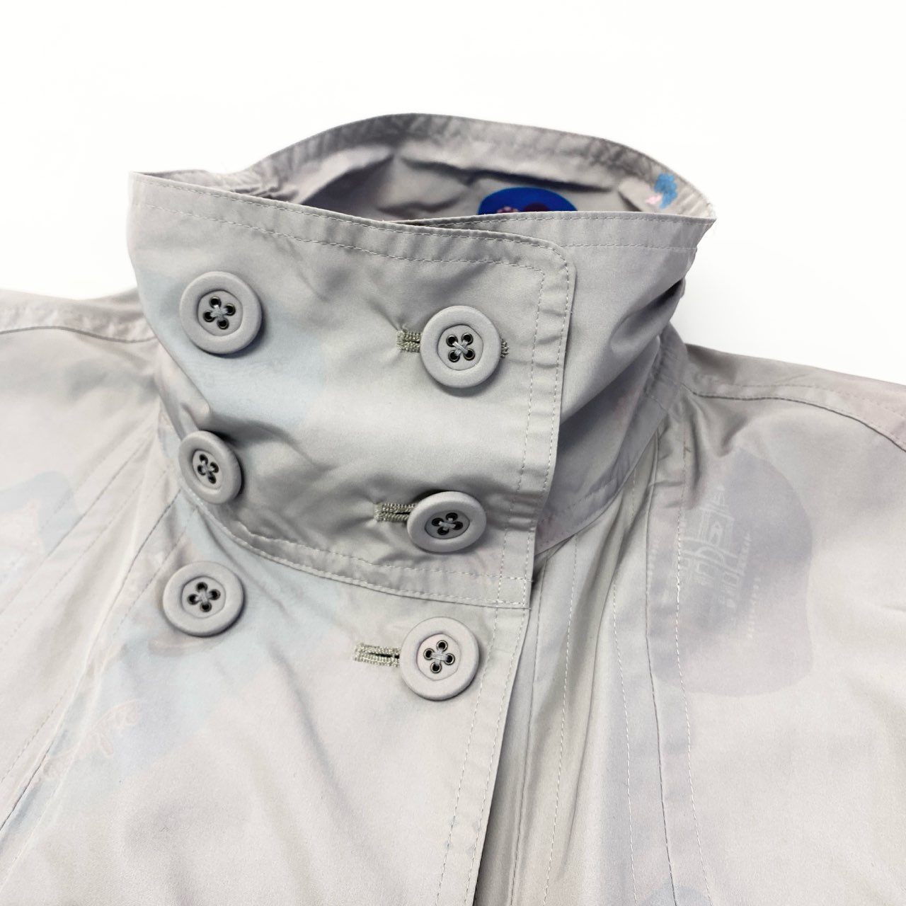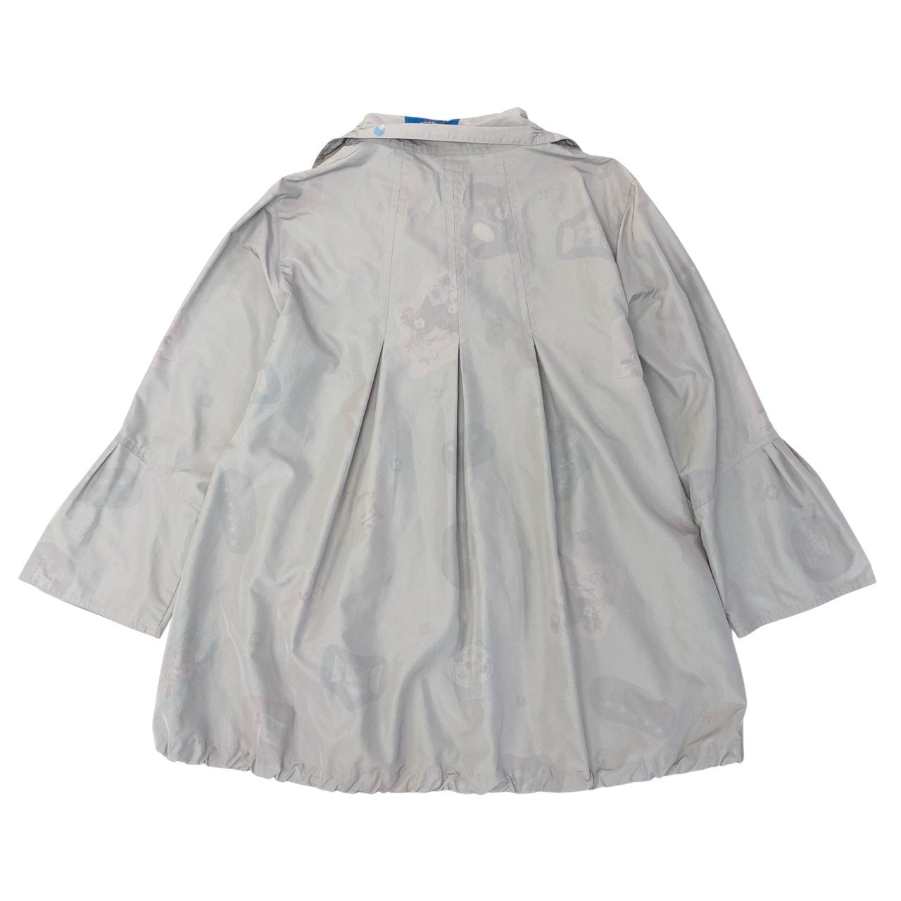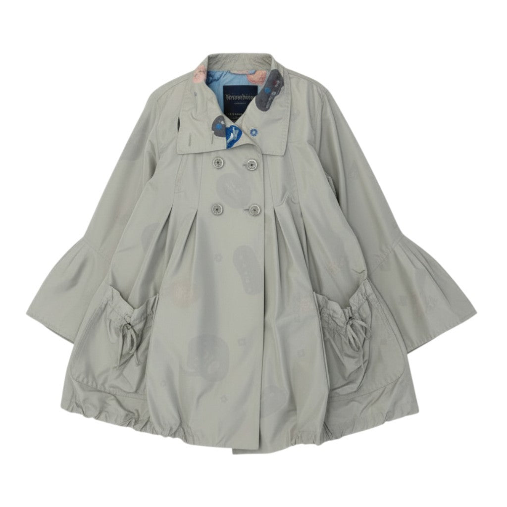 ややグレージュ寄りのライトベージュカラーが上品な印象の薄手コートです。全体にはブランドらしい総柄デザインがさりげなく入っており、シンプルながら個性を感じさせます。マットな質感のポリエステル素材で、軽やかに羽織れる一着です。Aラインシルエットとフレアスリーブ、ポケットのギャザーディテールが女性らしく、普段使いからお出かけ、旅行時の羽織としても活躍します。