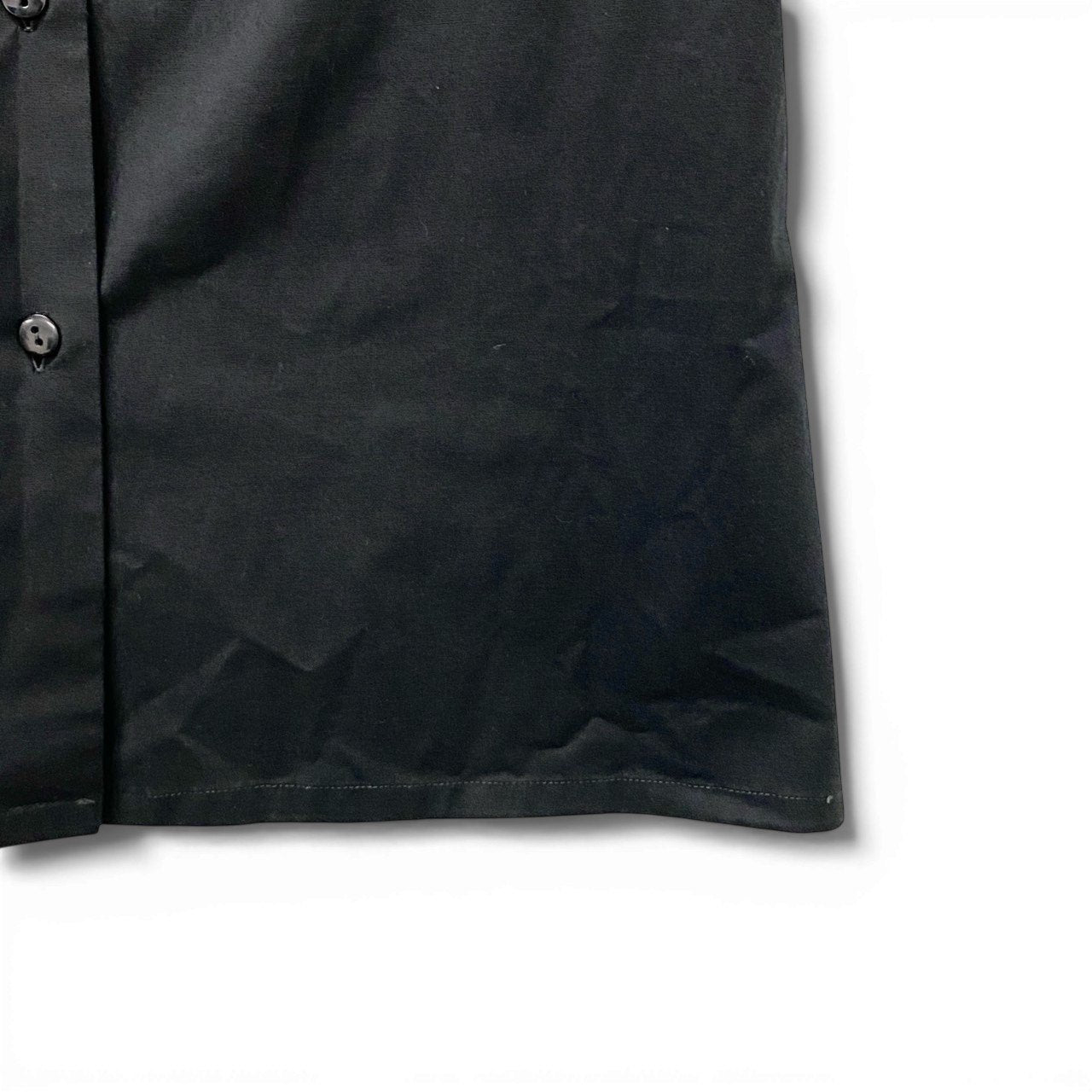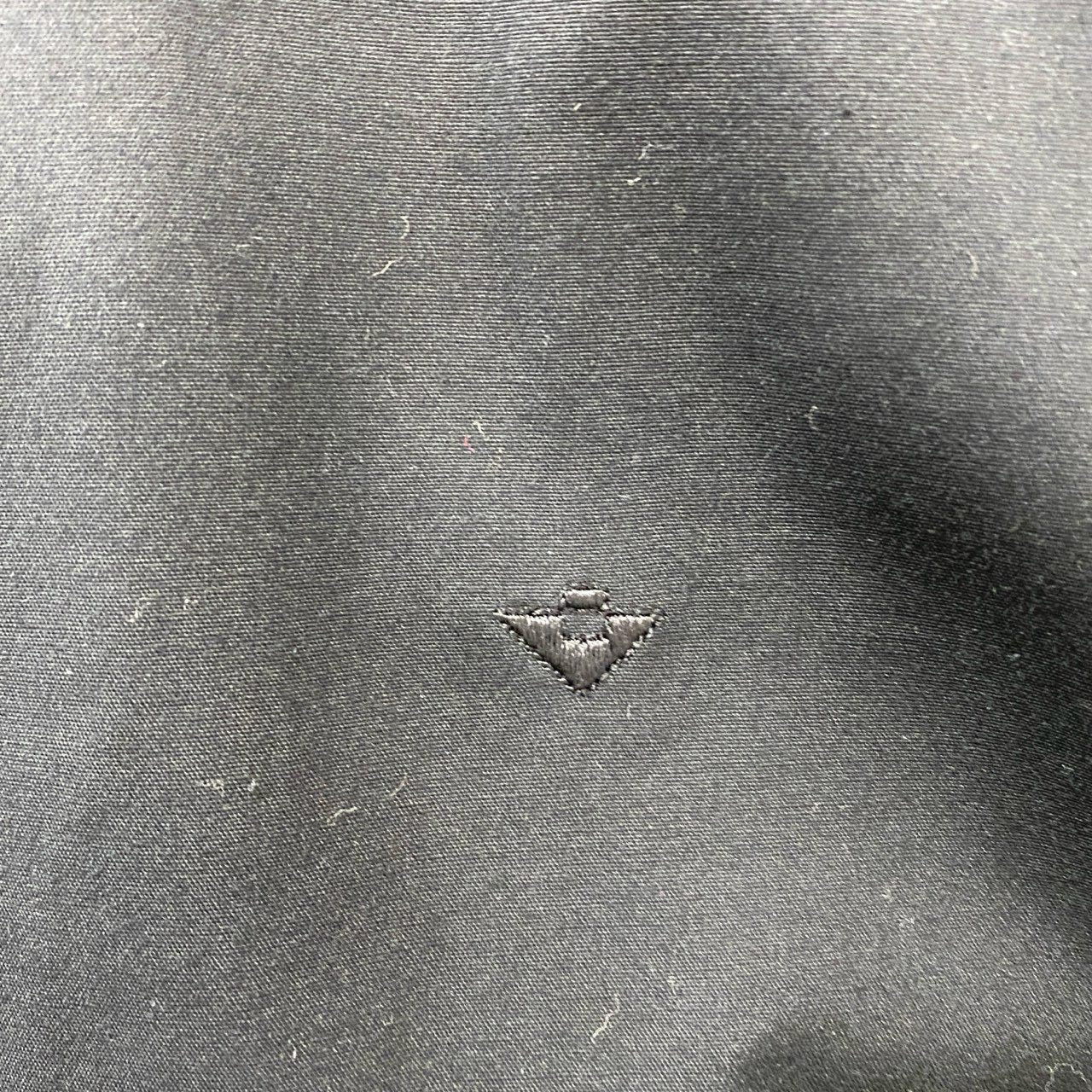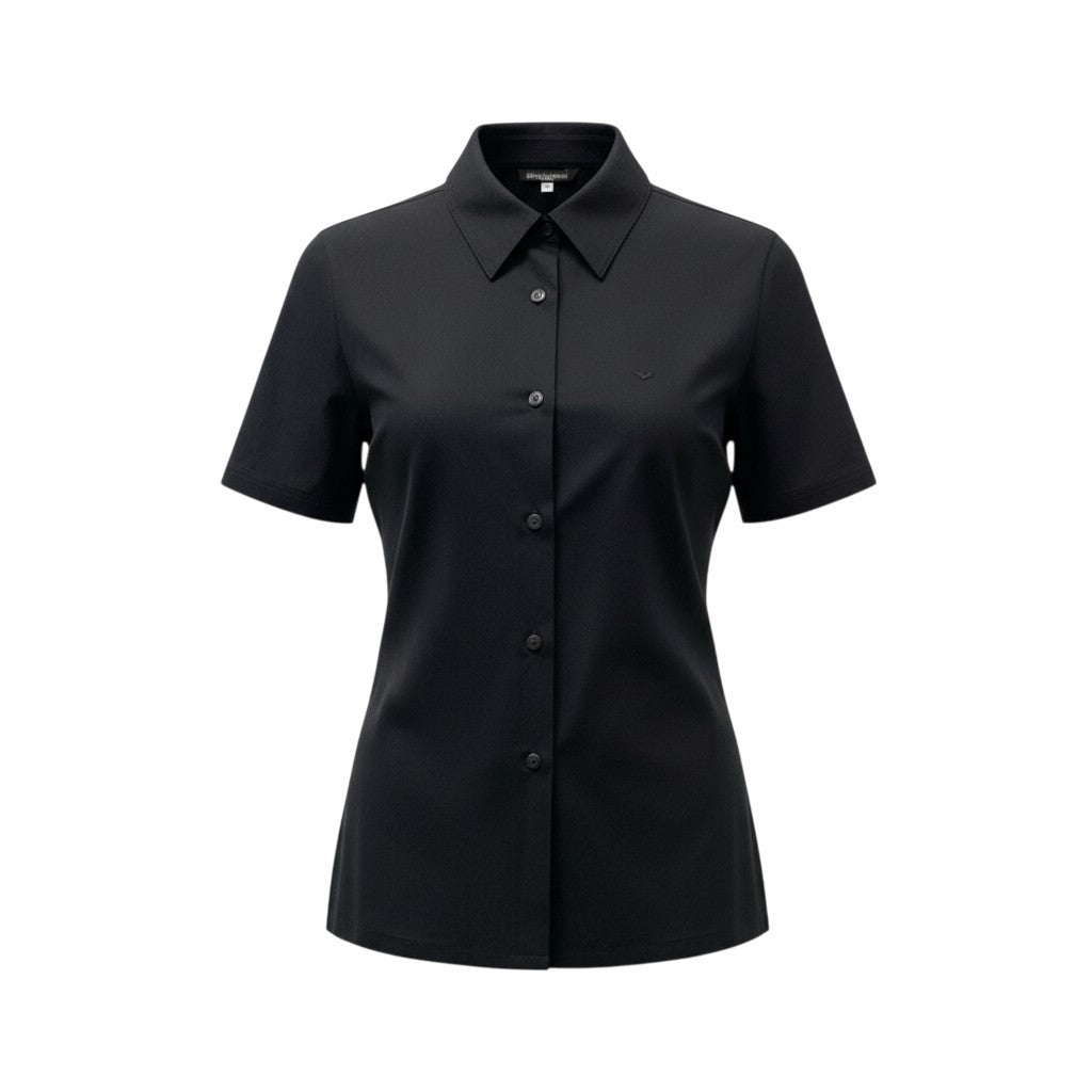 ブラックのマットなコットン素材を使用した、ミニマルな半袖シャツブラウスです。無地デザインに同色系のロゴ刺繍を胸元へさりげなくあしらい、控えめながら品のあるアクセントに仕上げています。程よくハリのある生地感がきちんと感を演出し、ビジネスシーンにも対応可能な一着です。パンツやタイトスカートと合わせて、洗練されたモードスタイルを楽しめます。
