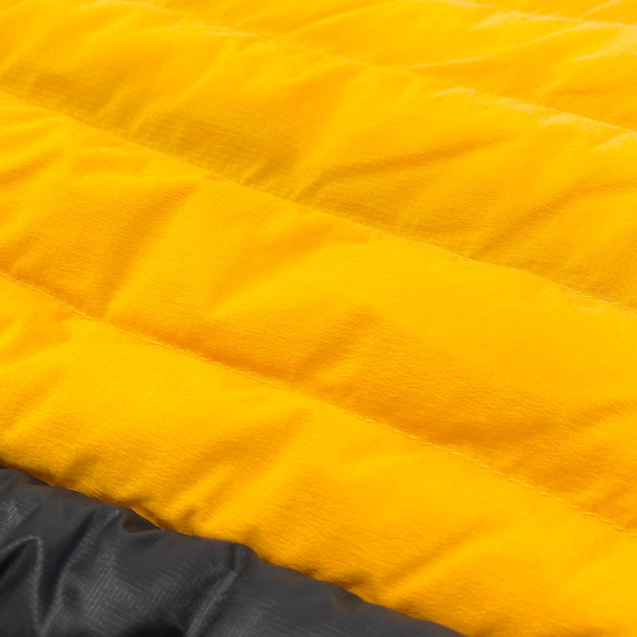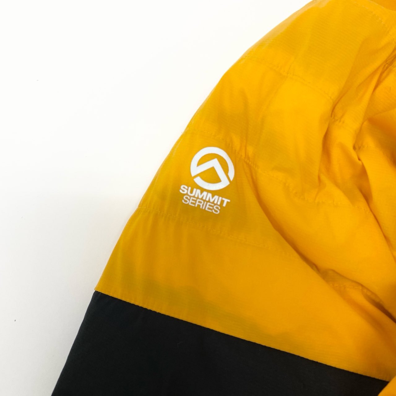 サミットゴールドとブラックの切替配色が印象的なダウンジャケットで、胸元にはブランドロゴ刺繍が入ったスポーティーなデザインです。光沢感のある軽量ナイロン素材にダウンを封入した構造で、保温性と軽量性を兼ね備えています。フード付きのスポーティーなシルエットでアウトドアや登山、タウンユースまで幅広く活躍します。存在感のあるカラーリングでコーディネートの主役になる一着です。