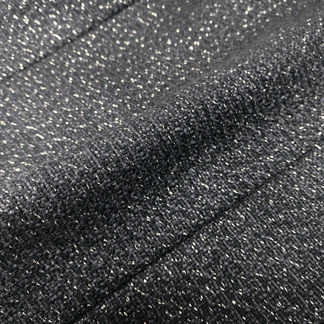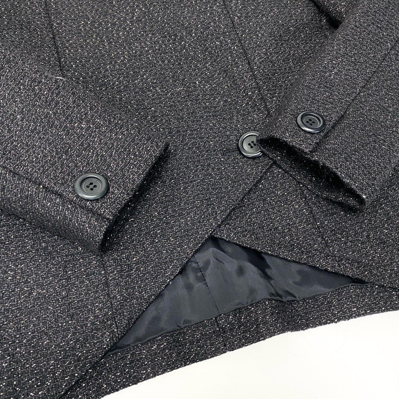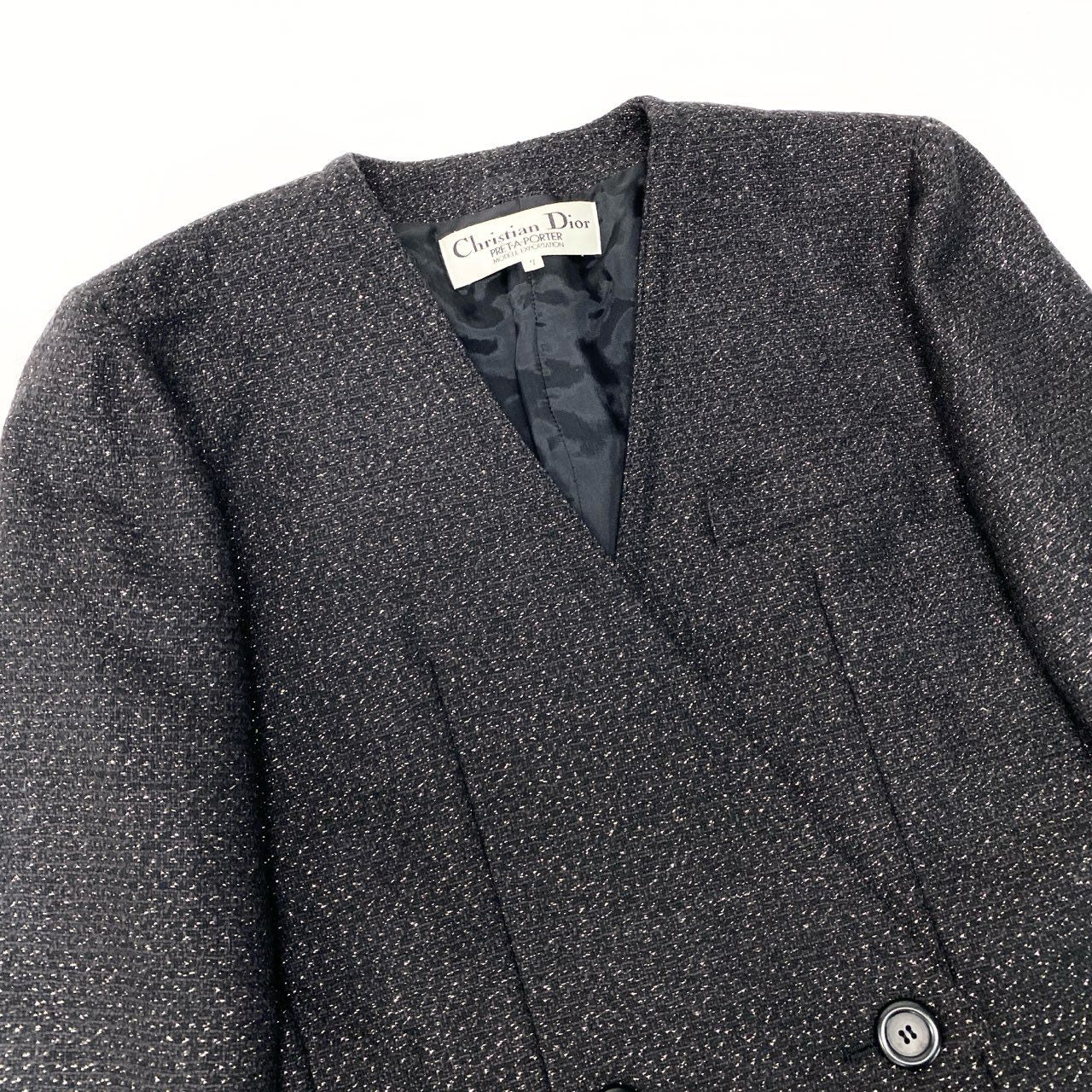 ブラックを基調としたラメ入りツイード生地が上品な輝きを放つChristian Diorのツイードジャケットです。ノーカラーのダブルブレストデザインがクラシックで洗練された雰囲気を演出します。ウール100%のしっかりとしたツイード素材で、立体感のある高級感が魅力です。ワンピースやスカートと合わせたエレガントなスタイルから、パンツスタイルまで幅広いコーディネートに活躍する一着です。