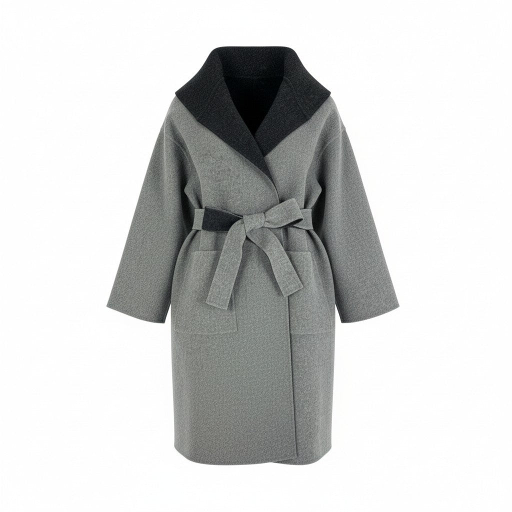 チャコールグレー×ライトグレーの落ち着いた2トーン配色が上品な、bamfordのウールロングコートです。マットな質感のウール生地を使用し、裏表で着られるリバーシブル仕様が特徴で、1着で大きく雰囲気を変えられます。フード付きの立体的なシルエットに加え、大きめのパッチポケットと共布ベルトがアクセント。ゆったりしたオーバーサイズ設計のため、厚手ニットとも合わせやすく真冬のアウターとして活躍します。上品なカジュアルスタイルから通勤まで幅広く使える一着です。