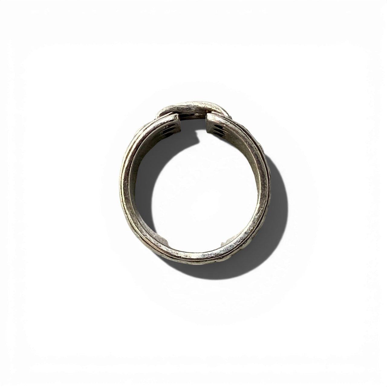 シルバー925素材を使用した、エルメスのヴィンテージ メキシコリングです。重厚感のあるシルバーカラーに、チェーンモチーフを思わせる立体的なデザインが特徴的です。マット寄りのシルバーの風合いと、随所に施されたメタルディテールがヴィンテージらしい味わいを演出します。シンプルな装いのアクセントとしてはもちろん、モードやユニセックスなコーディネートにも相性の良い一本です。