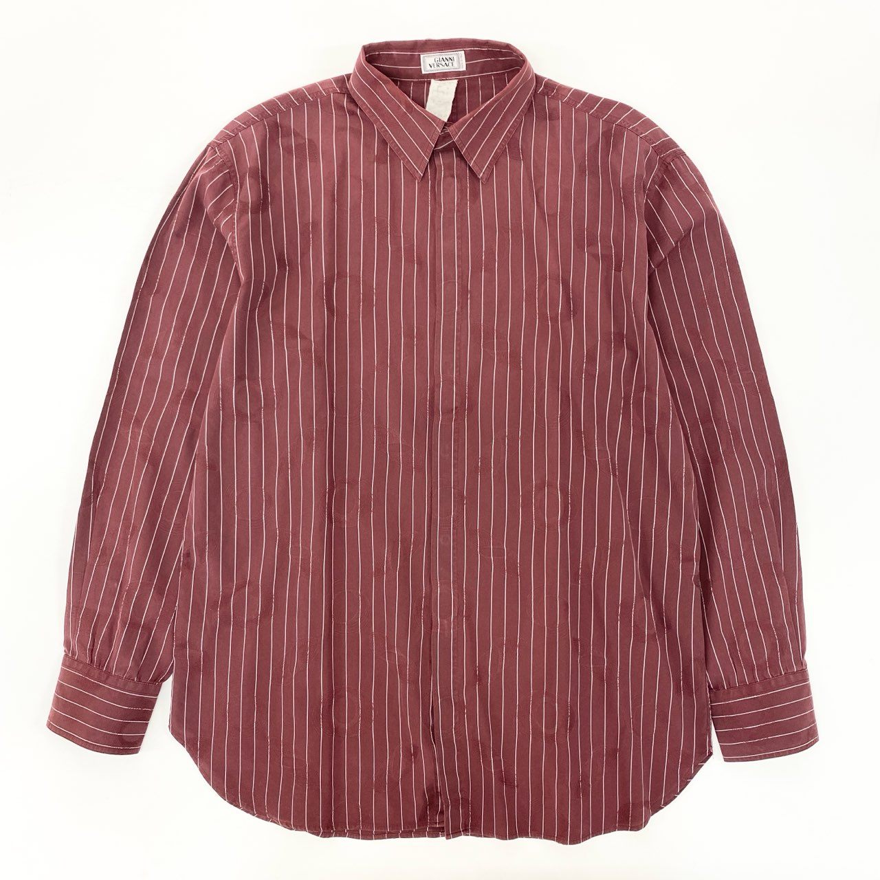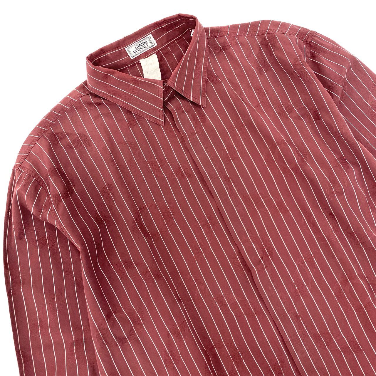 35j22 GIANNI VERSACE ジャンニヴェルサーチ 長袖シャツ ストライプ 透かし総柄模様 サイズ50 ボルドー コットン メンズ イタリア製u02t