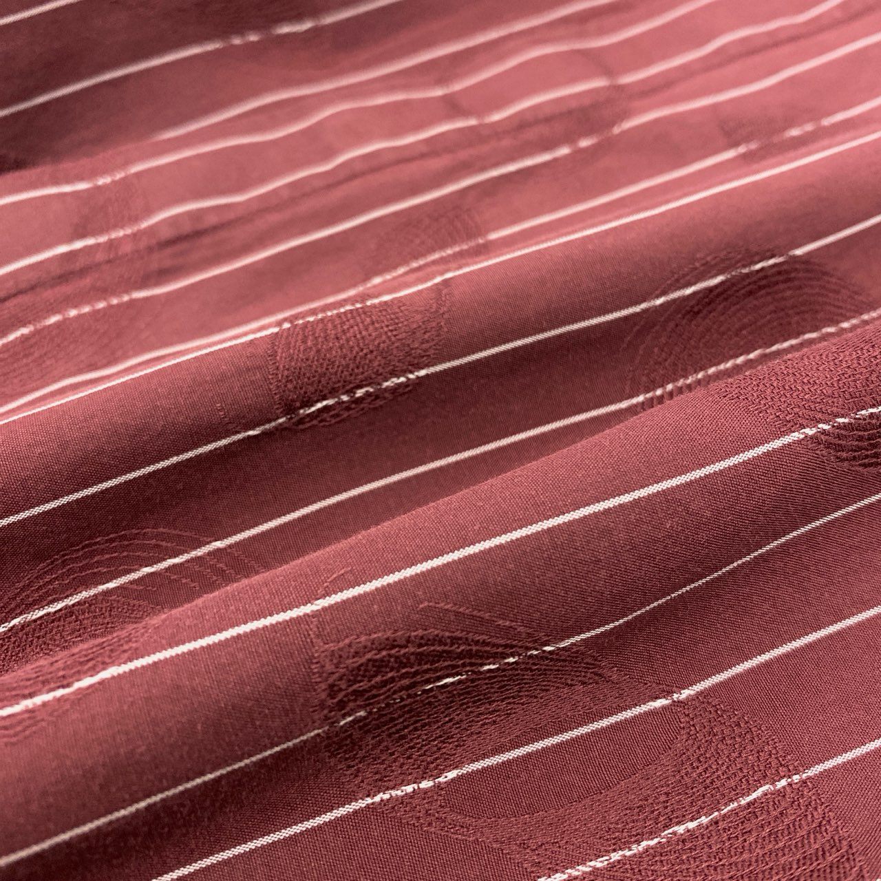 深みのあるボルドーにホワイトのストライプ柄が映える、ジャンニ・ヴェルサーチの長袖シャツ。生地には光沢を抑えたマットコットンを使用し、よく見ると透かし模様のジャカード織りが施された上品なデザイン。クラシックな襟と洗練されたシルエットが特徴で、ジャケットインにも最適。上質な素材感が際立つ、エレガントな一着です。