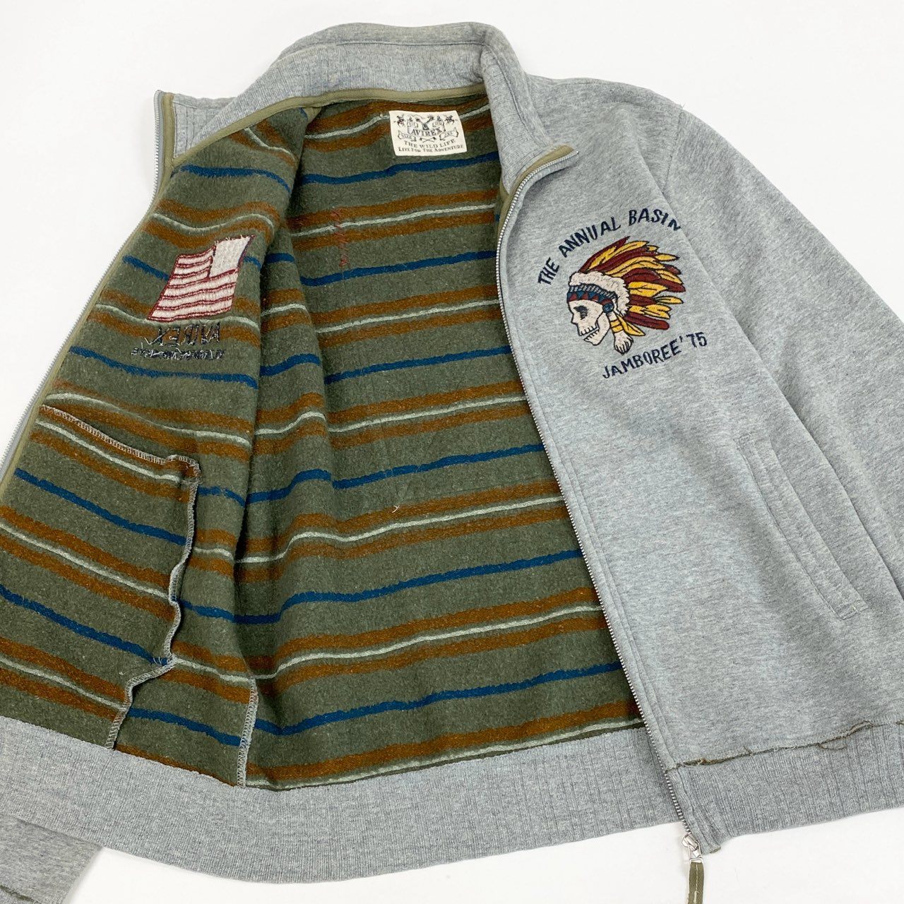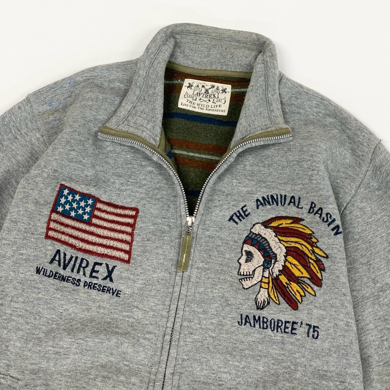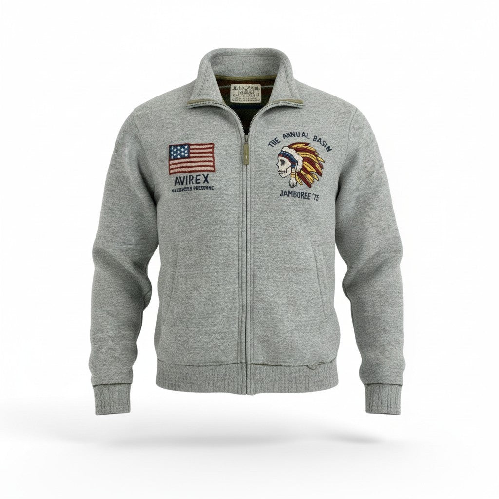 AVIREXの裏起毛スタンドジップアップジャケットで、杢調ライトグレーの落ち着いたカラーが特徴です。 表地は柔らかくマットなスウェット素材で、内側は裏起毛仕上げとなっており保温性を確保。 フロントには星条旗モチーフ刺繍とネイティブアメリカン柄刺繍が施され、ブランドらしいミリタリー×アメカジテイストを演出します。 スタンドカラーとフルジップ仕様で着脱しやすく、タウンユース、休日の外出、リラックスシーンまで幅広く活躍する一着です。
