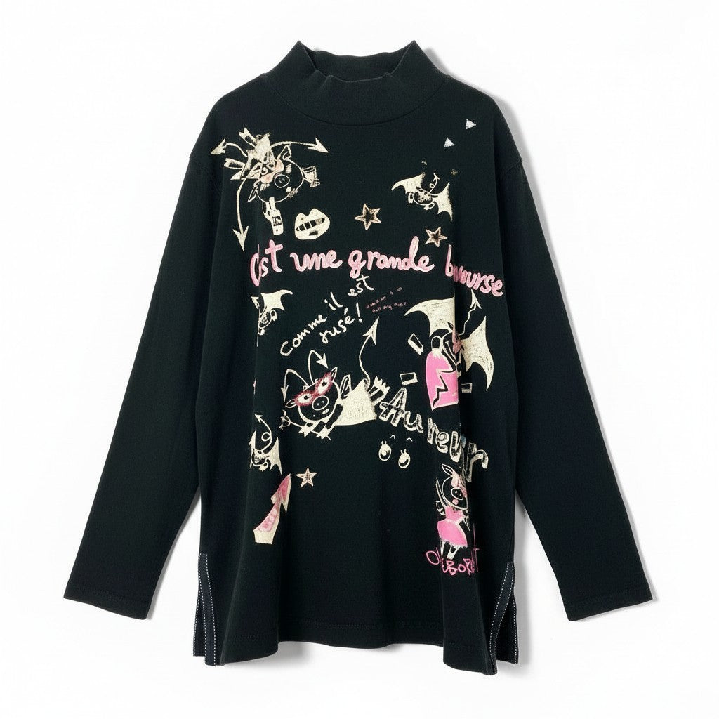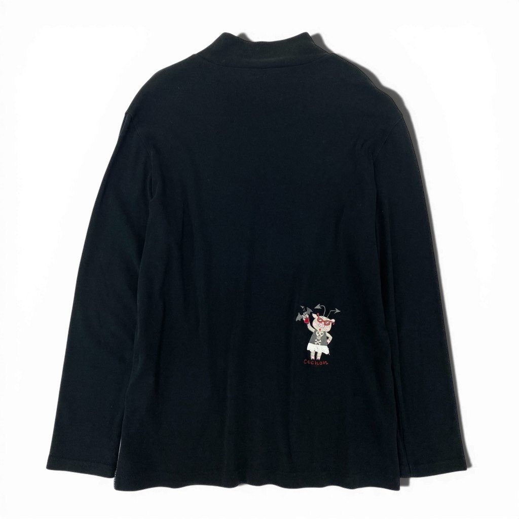 6a9 OLLEBOREBLA オレボレブラ チュニックカットソー ロングスリーブ モックネック ブタさん ビーズ装飾 レディース ブラックo07t