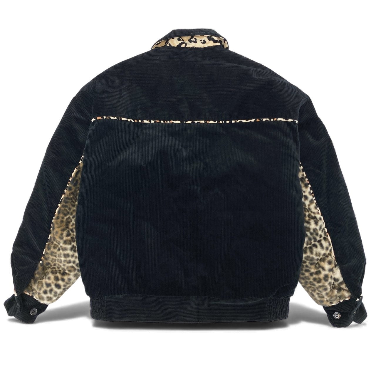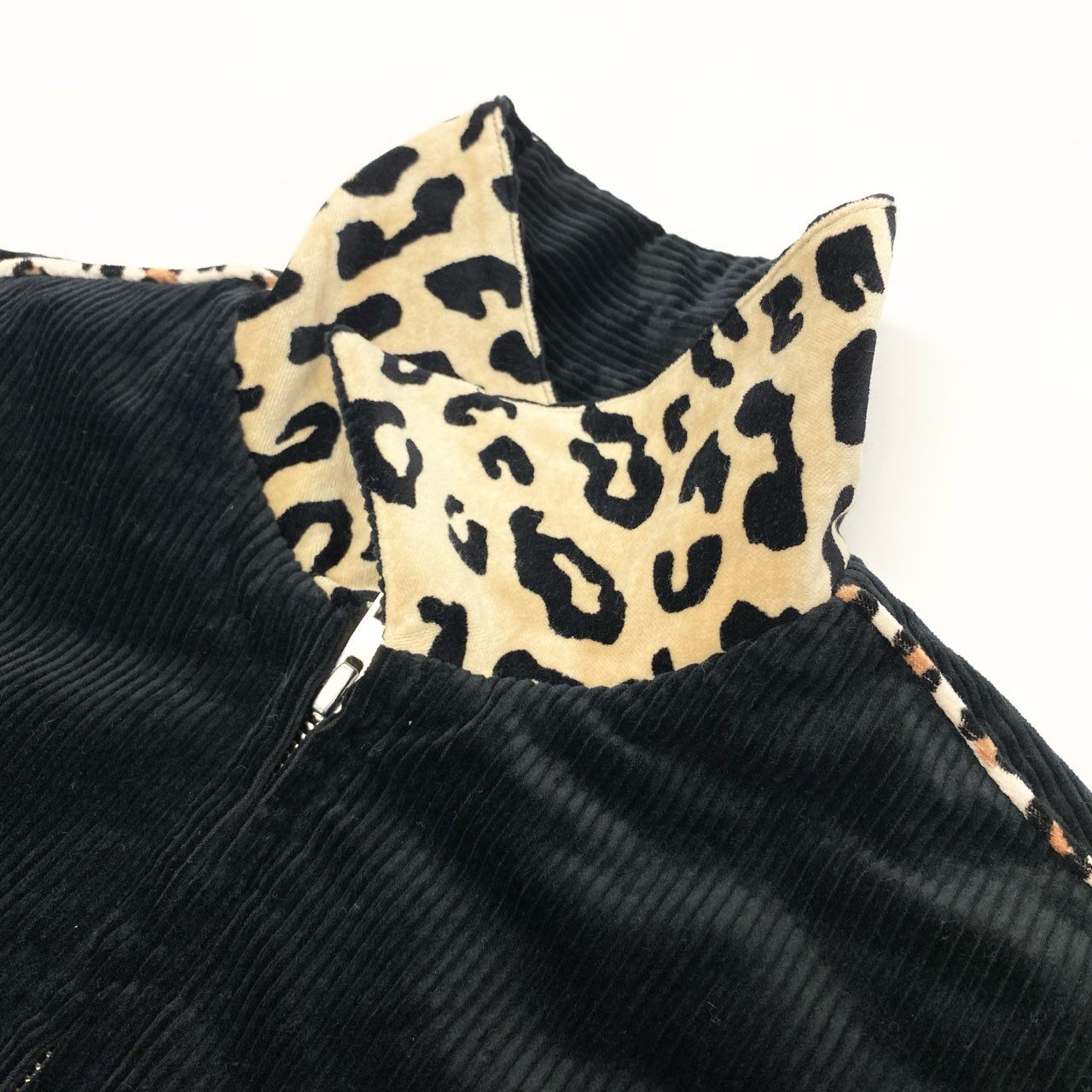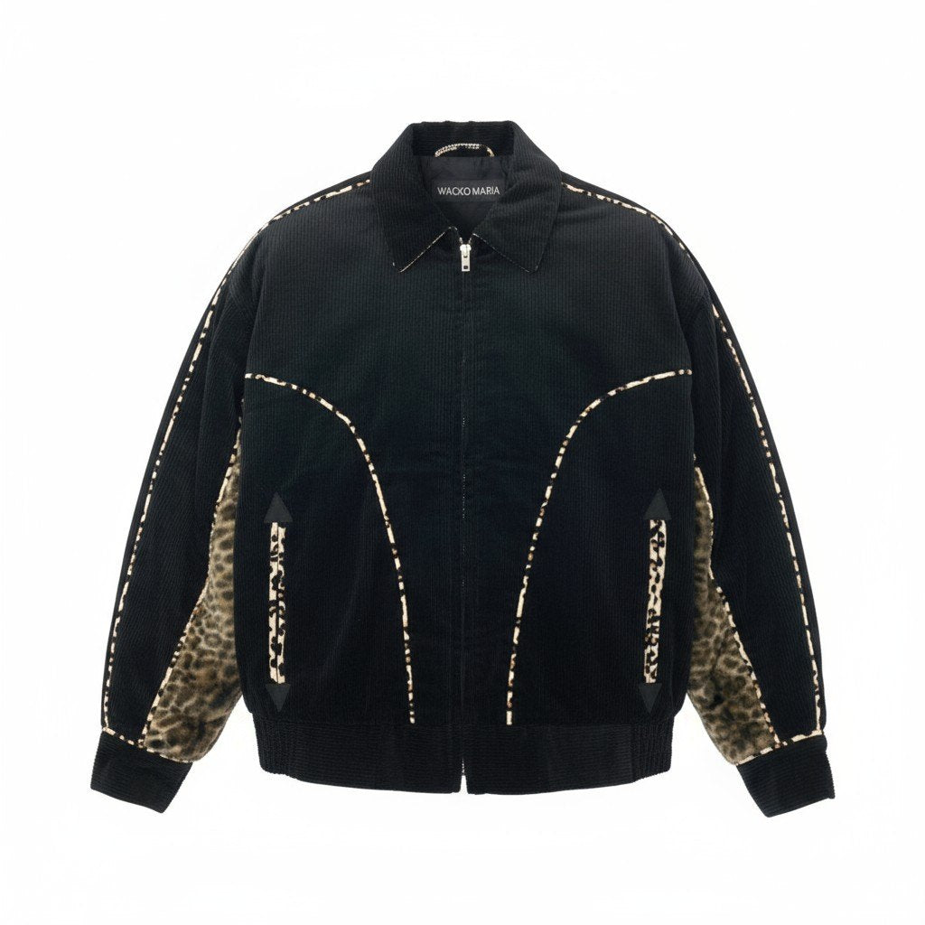 WACKO MARIA(ワコマリア)24AW「CORDUROY WESTERN JACKET」。カラーはブラックをベースに、袖とライン部分にアニマル柄の切り替えが施された、アイコニックな存在感を放つ一着です。素材はやや光沢感のあるコーデュロイで、重たすぎず柔らかい質感。シルエットはワコマリアらしいゆとりのあるワイドシルエットで、ストリート・ロカビリー・モード系にもはまります。1枚で主役級のインパクトをもたらすデザインジャケットです。