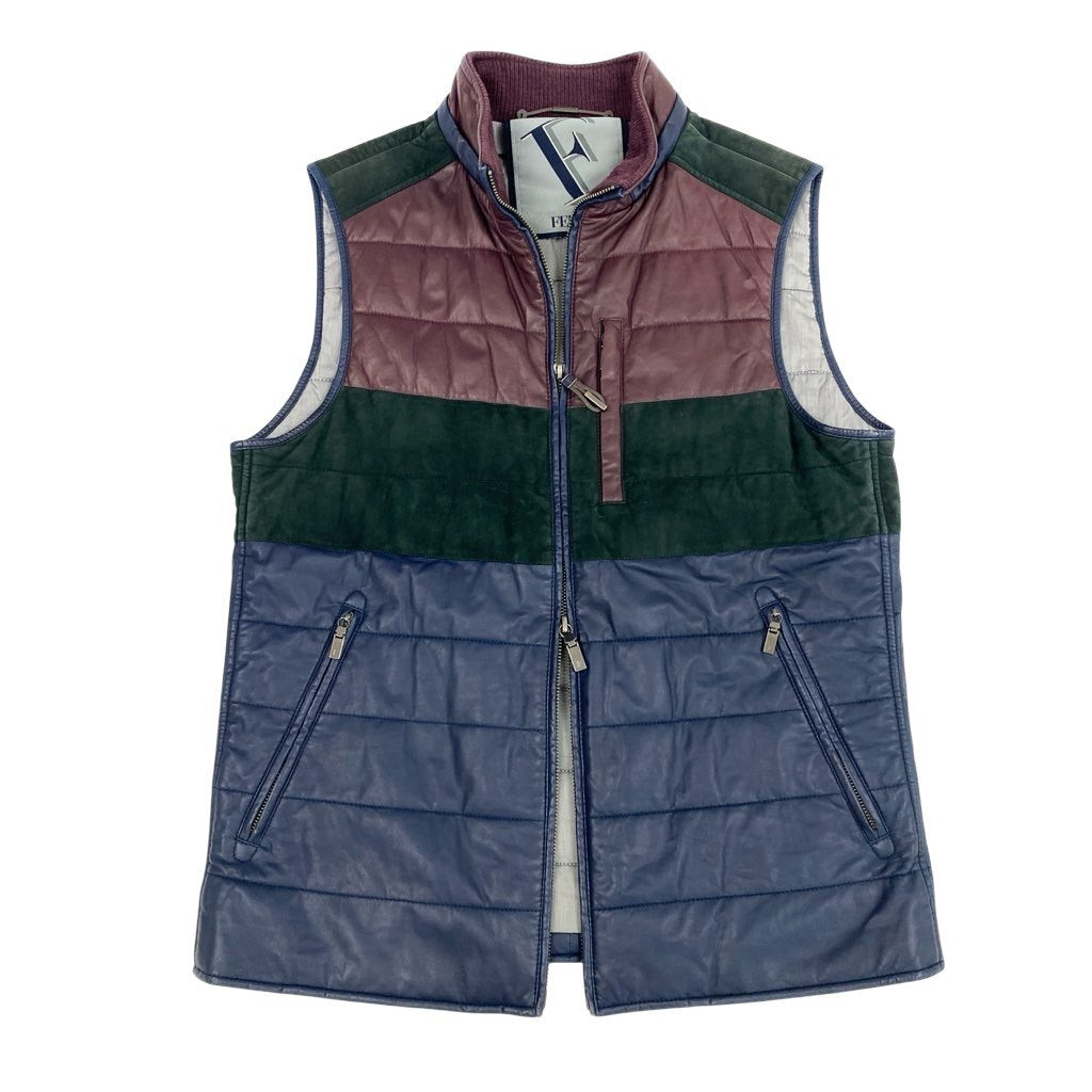 GIANFRANCO FERREのレザーベストで、ネイビー×ダークグリーン×ボルドーの配色切替が印象的な一着です。素材はマットで起毛感のあるスウェードに、キルティング調のステッチを施した立体的な表情が特徴。ダブルジップ仕様とスタンドカラーで、レイヤード時のシルエット調整がしやすく実用性も高いです。シャツやニットの上に重ねるだけでコーディネートにアクセントを加え、カジュアルからきれいめまで幅広く活躍します。