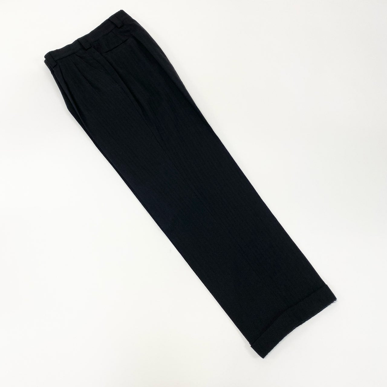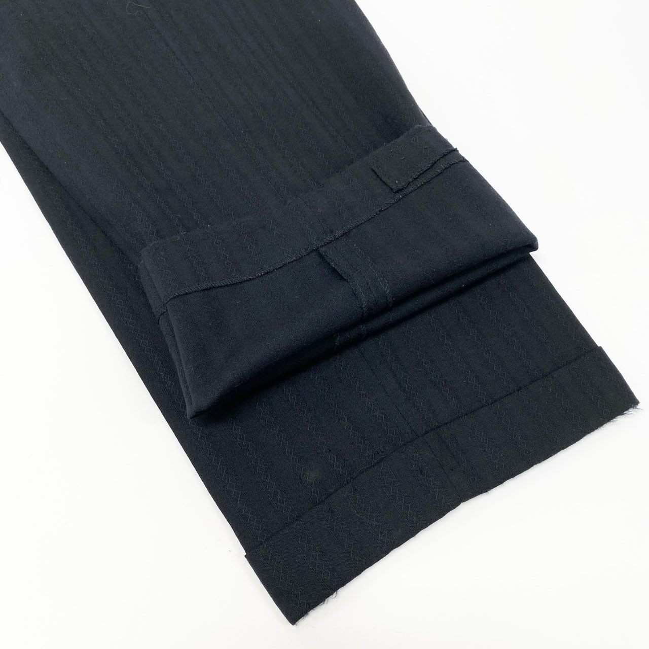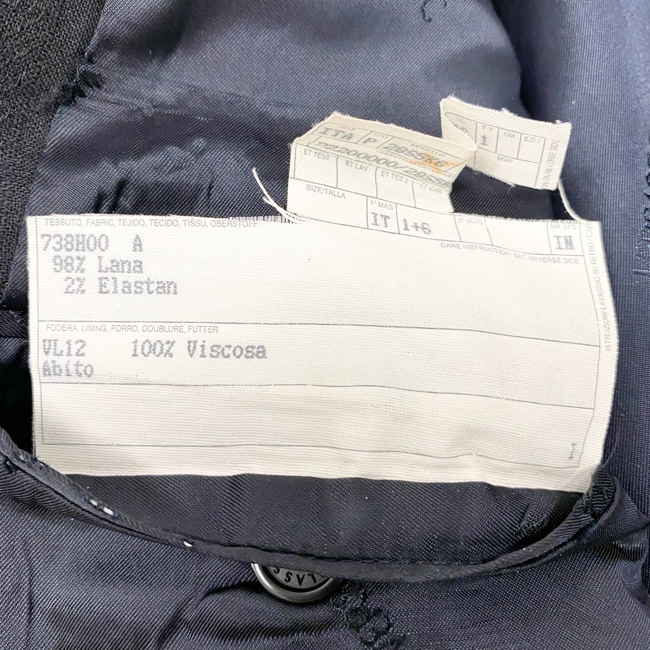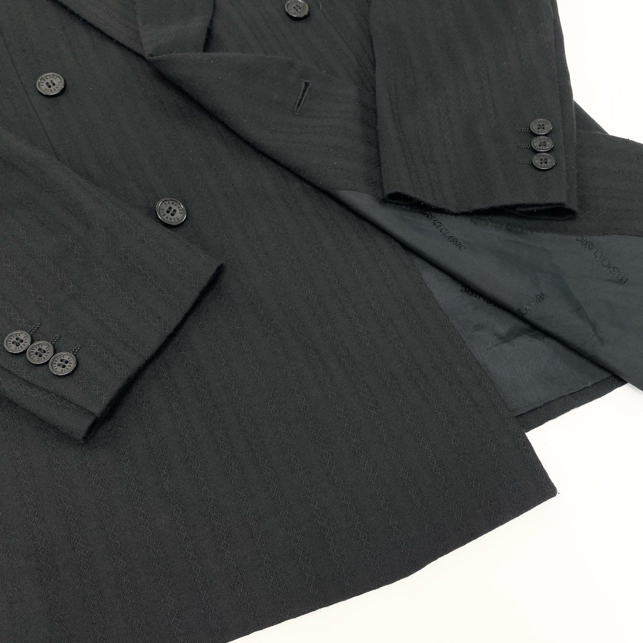 ヴェルサーチ クラシックのダブルブレストセットアップで、重厚感のあるブラックにさりげなく入った織柄(総柄)ストライプが上品な印象を与える一着です。 マットな質感のウール生地により、シーンを選ばず着用しやすいクラシックな佇まいが魅力です。 ダブルの力強いラペルラインと、スタイリッシュに落ちるシルエットが大人の存在感を演出します。 ビジネスはもちろん、式典やフォーマルな場面でも映える高級感あるセットアップです。 ヴェルサーチらしい洗練された雰囲気を楽しめる一着をお探しの方におすすめです。