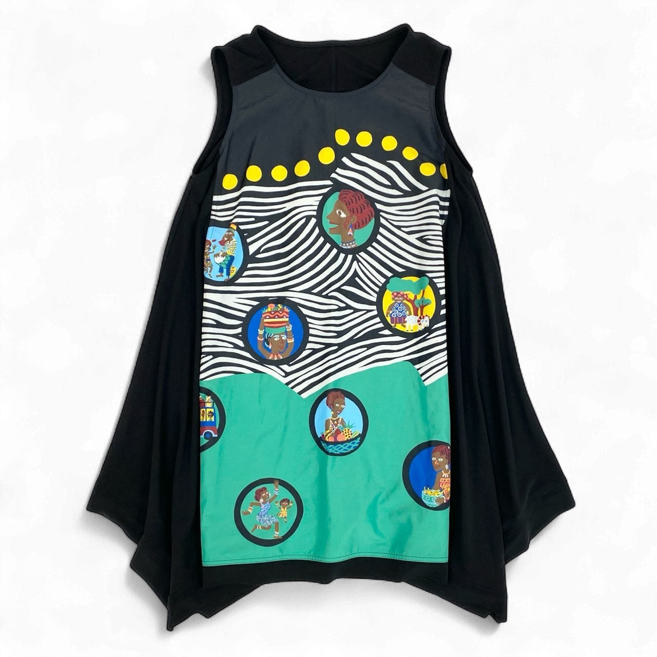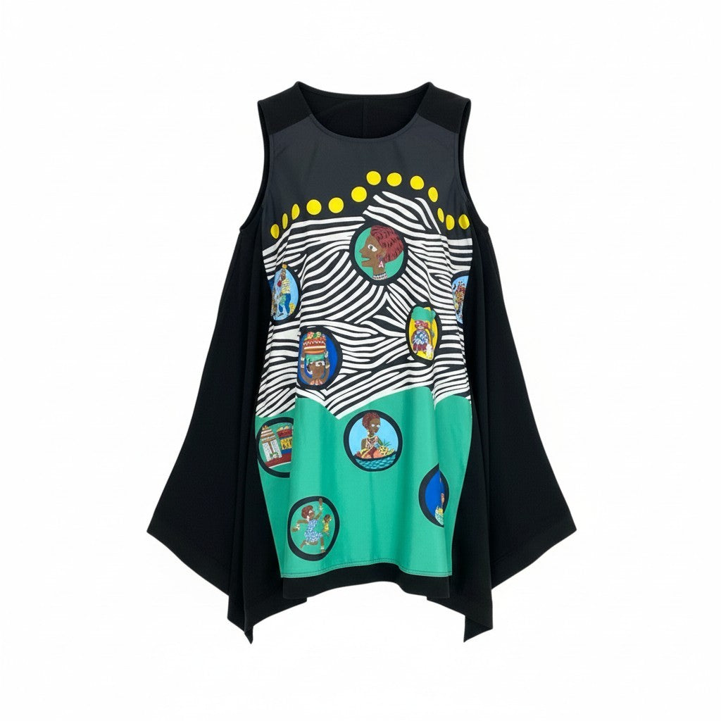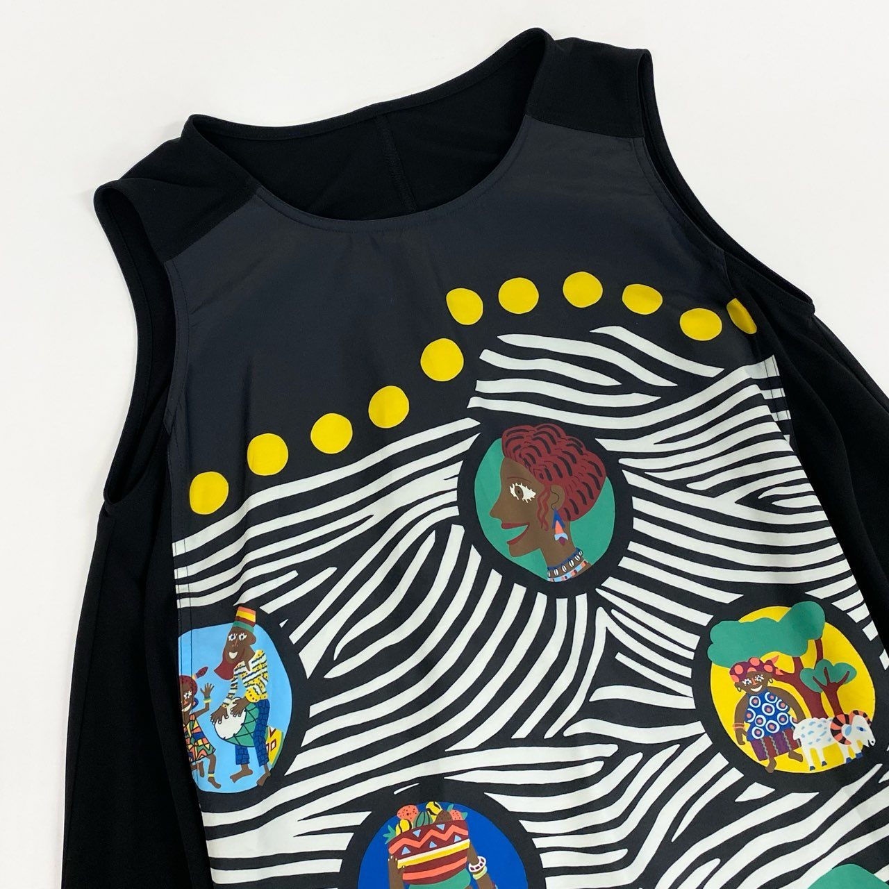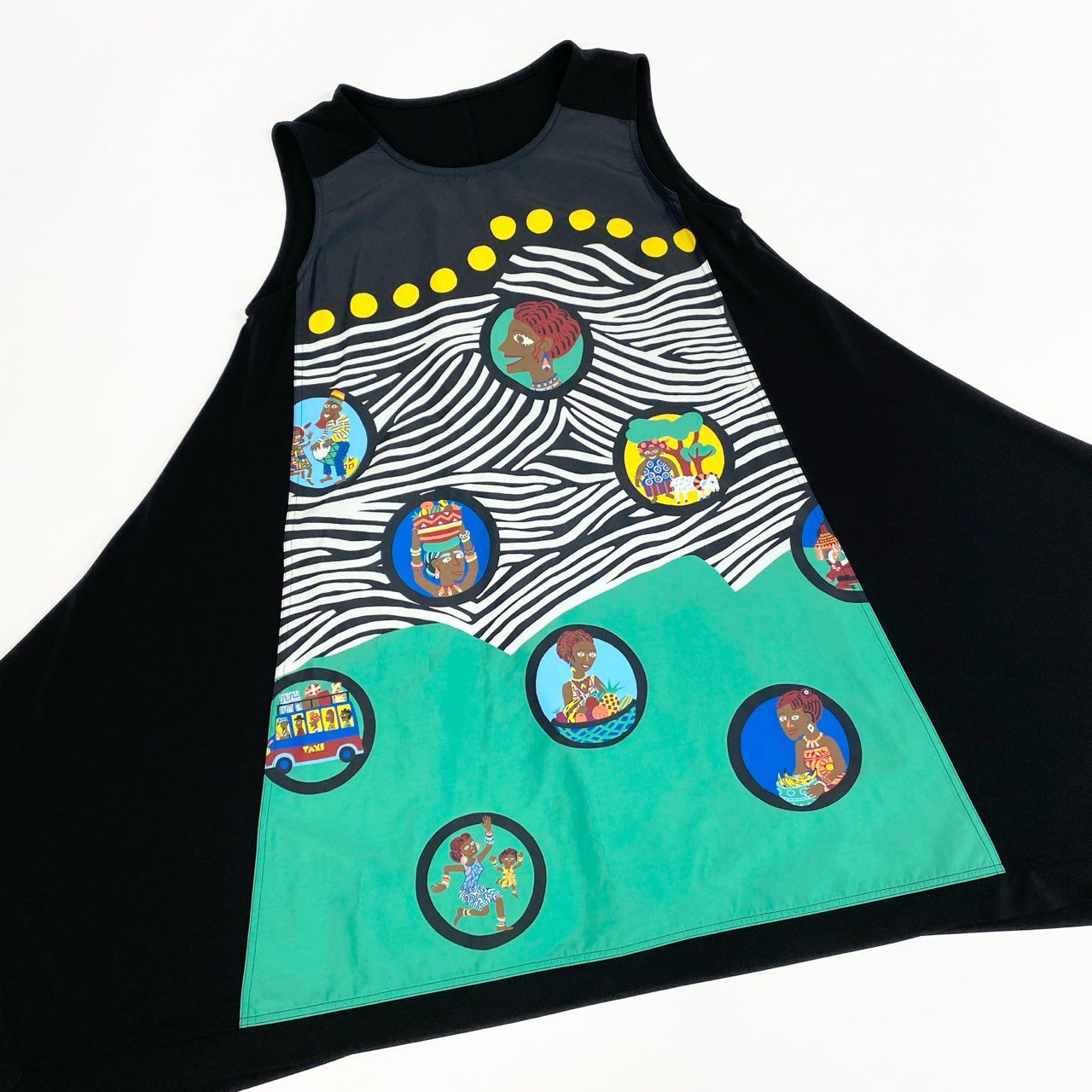 トクコプルミエヴォルらしい独創的なアートプリントが目を引くノースリーブワンピース。ブラックベースに、ターコイズやイエローを用いた鮮やかなプリントが映え、着るだけで主役級の存在感を放ちます。軽やかなAラインシルエットと柔らかな生地感で、動くたびに美しいドレープが生まれるデザイン。夏は一枚で、春秋はカットソーや薄手ニットとのレイヤードにも最適です。日常使いからお出かけまで幅広いシーンで活躍する一着です。
