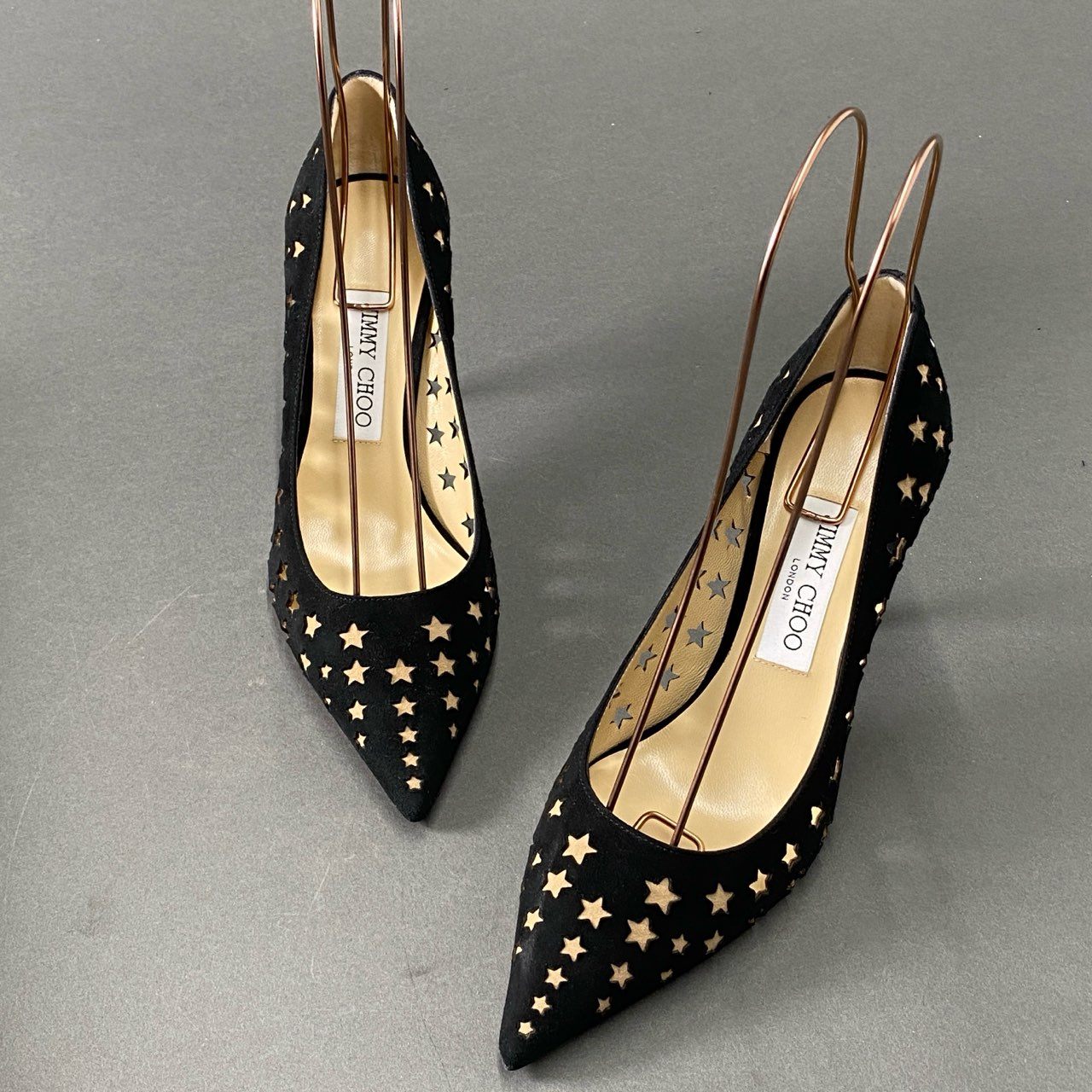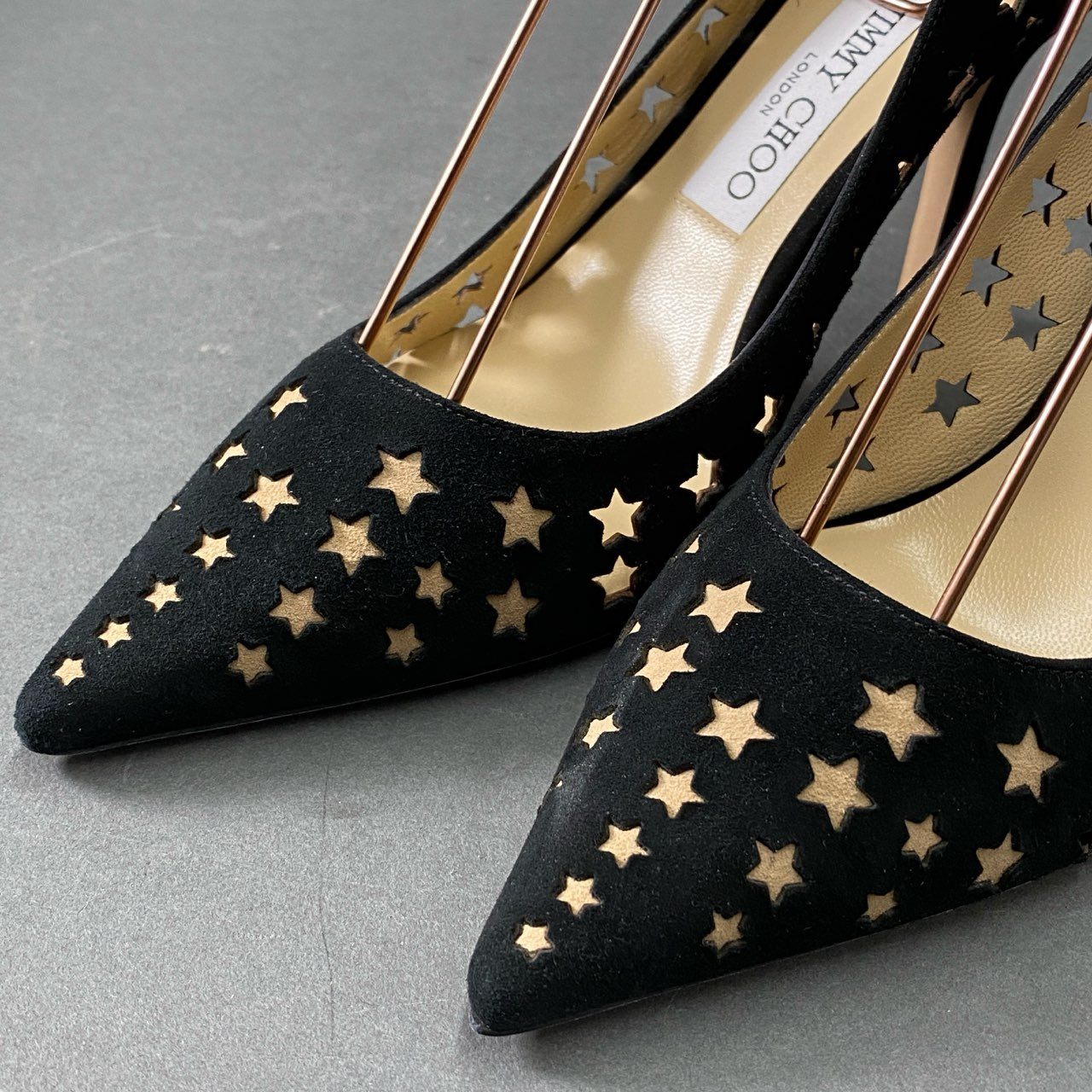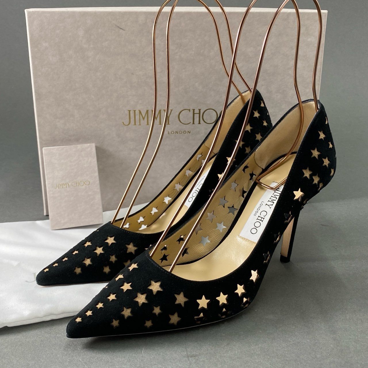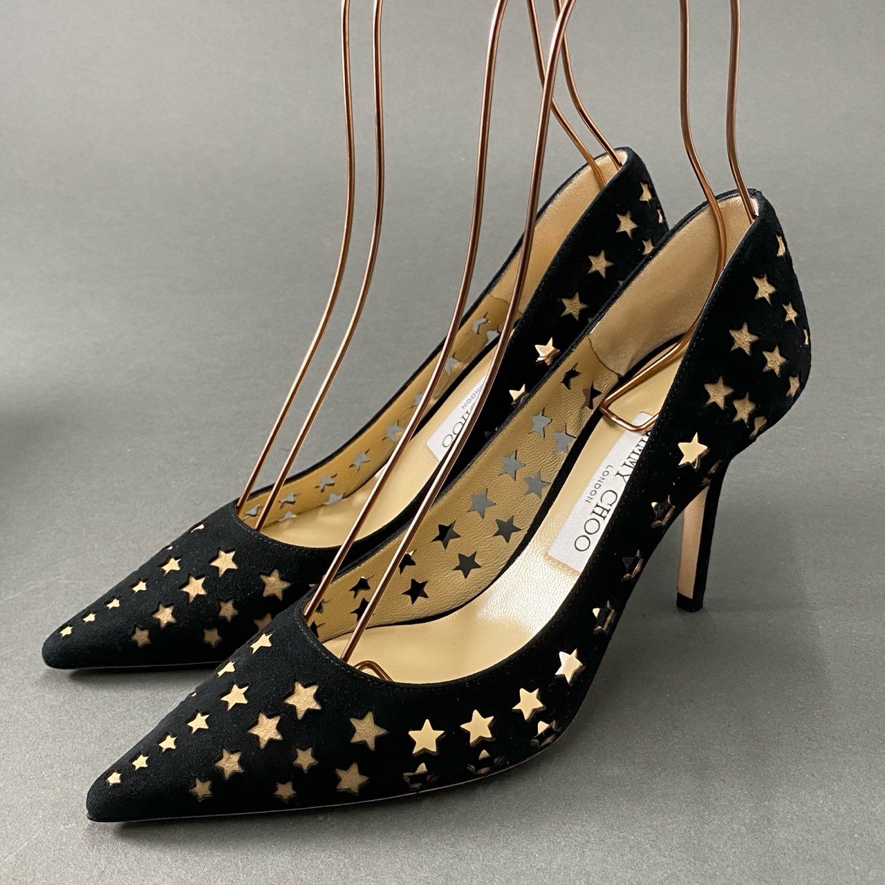3d16 《極美品》 JIMMY CHOO ジミーチュウ スターパンチング パンプス 37 1/2 ブラック スエードレザー シューズ イタリア製 箱有