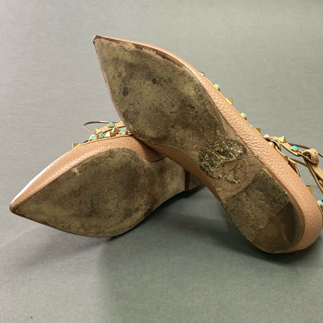 5c21 VALENTINO GARAVANI ヴァレンティノ ガラヴァーニ ゴールドスタッズ × ターコイズ ストラップ フラットシューズ 37 1/2 ピンク レザー シューズ イタリア製