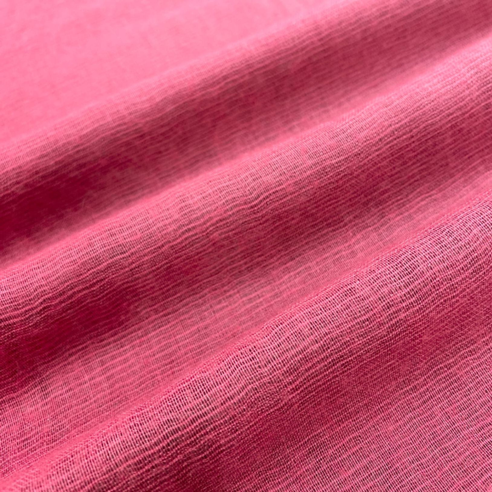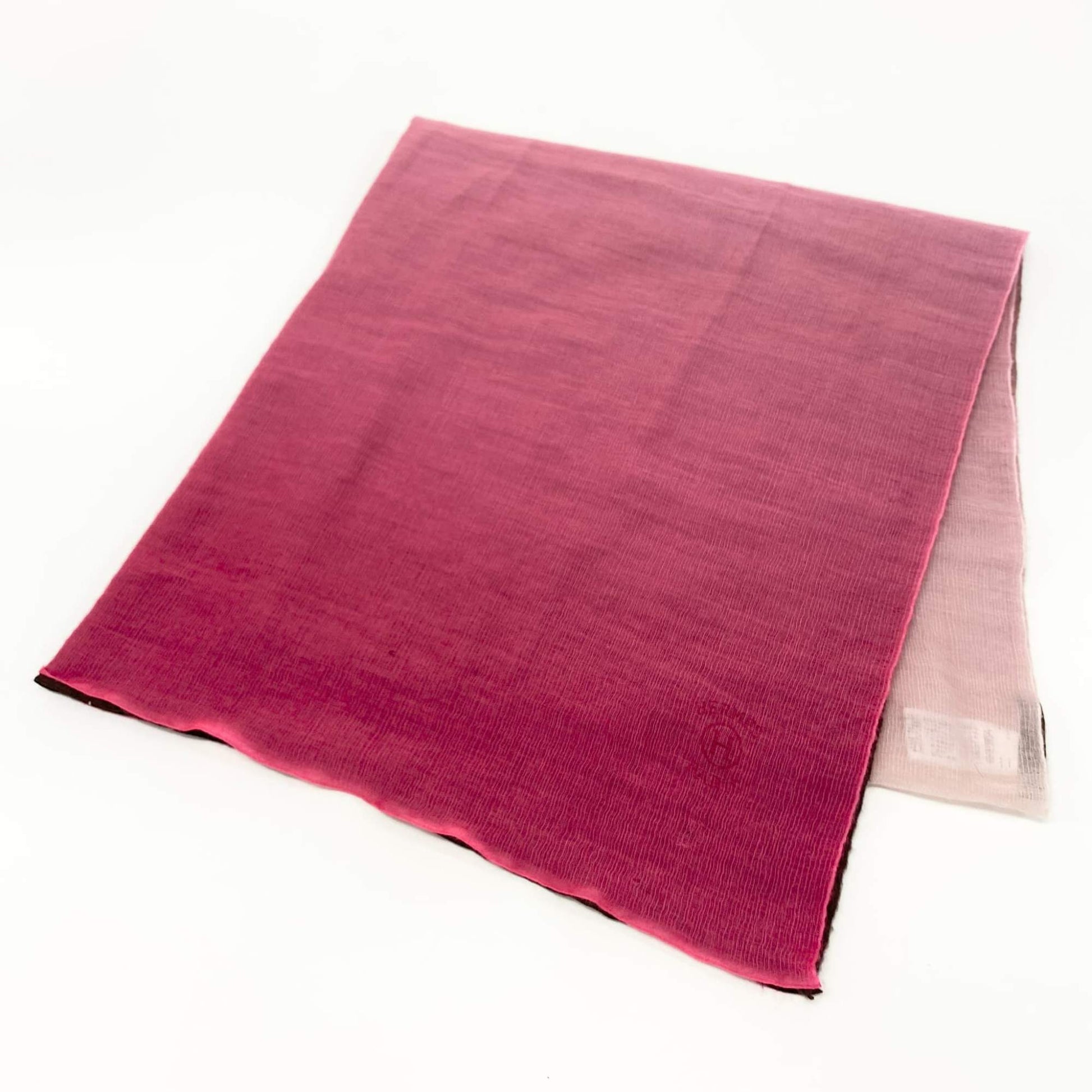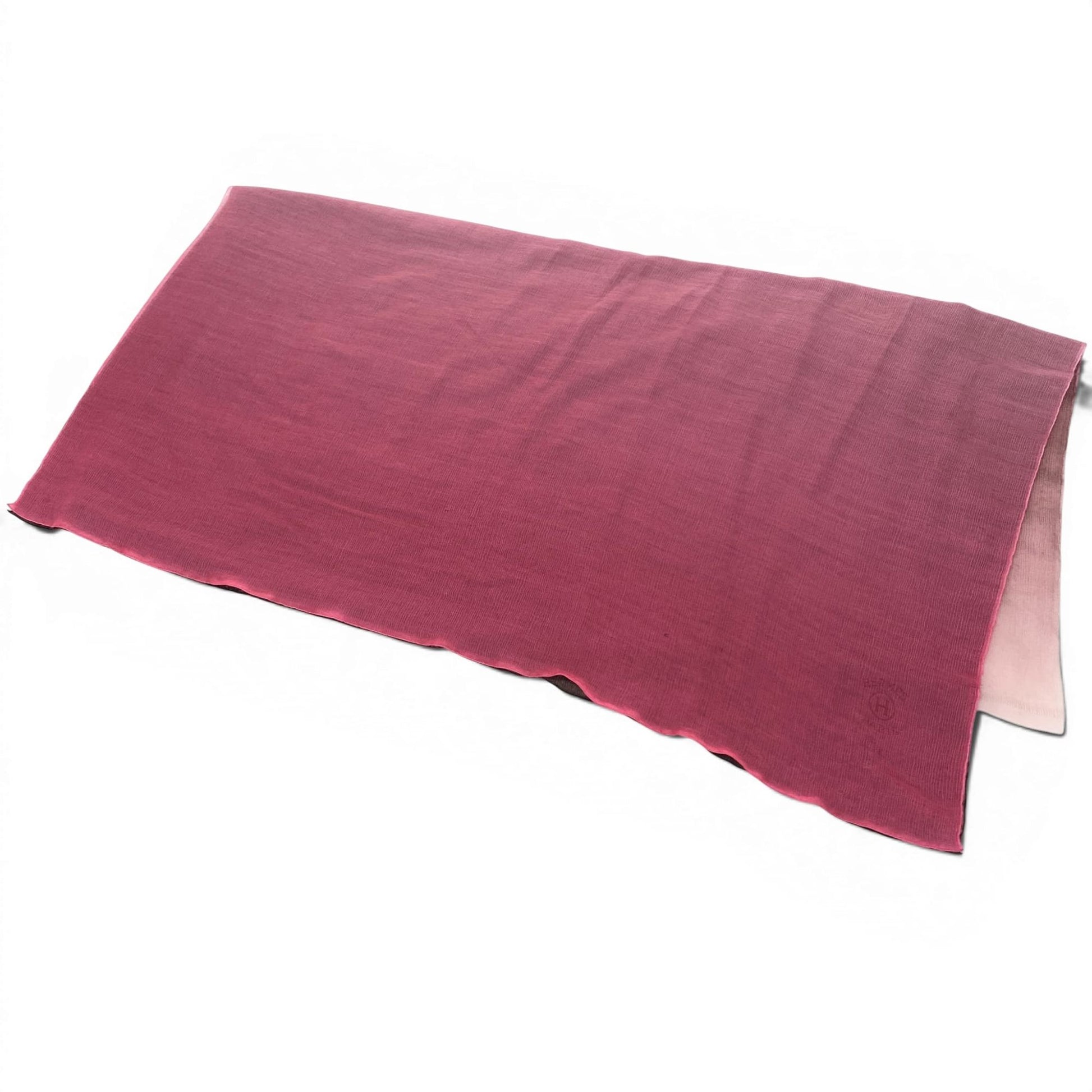 深みのあるボルドー〜ローズ系のグラデーションが美しい、無地の大判ストールです。透け感のあるシルク混風の薄手素材感で、上品な光沢と軽さが魅力。縁はシンプルな仕上げで、色味そのものを引き立てます。首元のアクセントから肩掛けまで幅広く活躍し、装いを格上げする**Hermès**らしい一枚です。