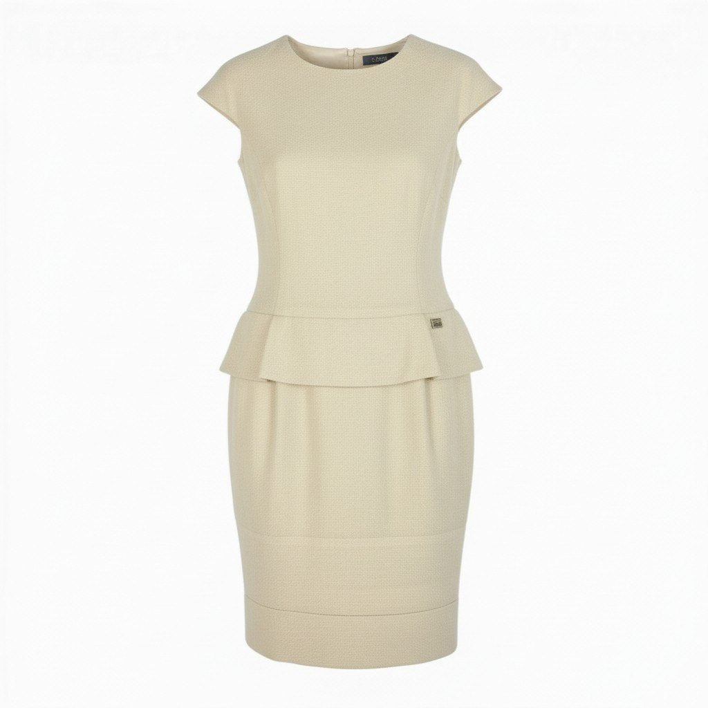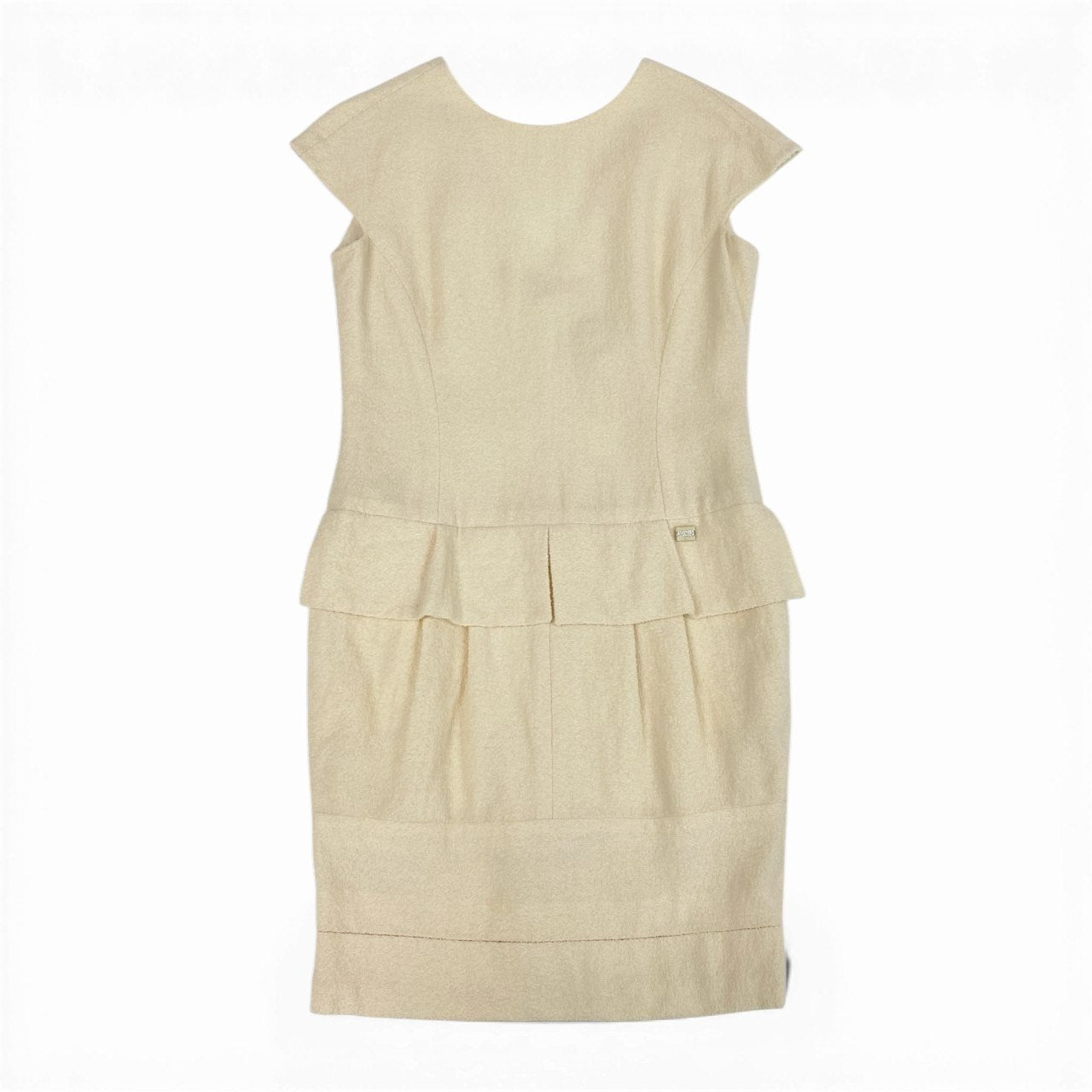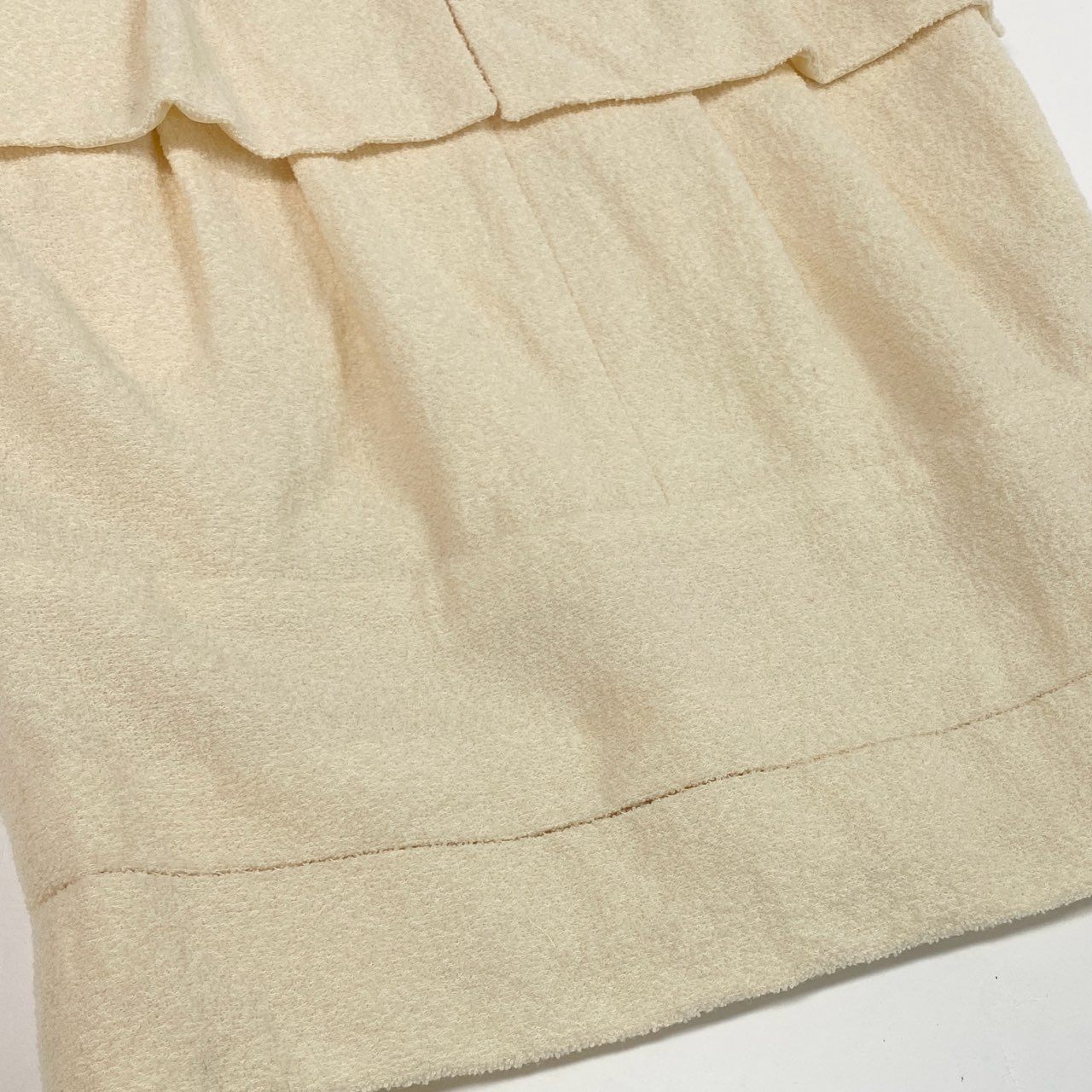上品なアイボリーベージュの無地に、凹凸感のあるツイード織りが高級感を引き立てる一着です。 マットで立体感のあるツイード素材に、ウエストのペプラム切り替えが女性らしいシルエットを演出。 裾の切り替えデザインとさりげないロゴプレートがアクセントになっています。 シャネルらしい気品とクラシカルな佇まいで、入学式・パーティー・セレモニーシーンに映えるエレガントなワンピースです。