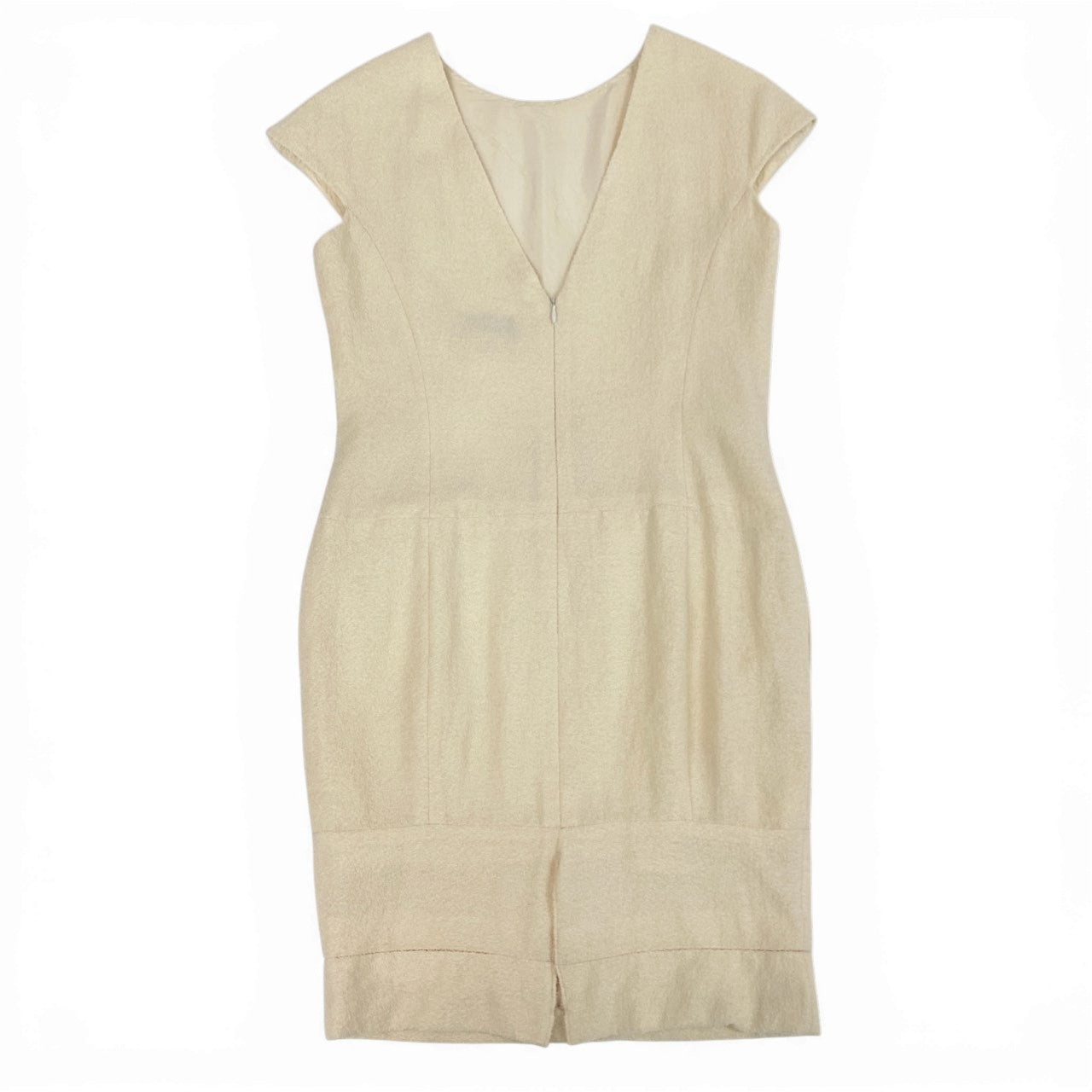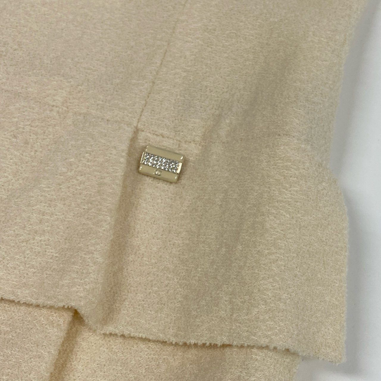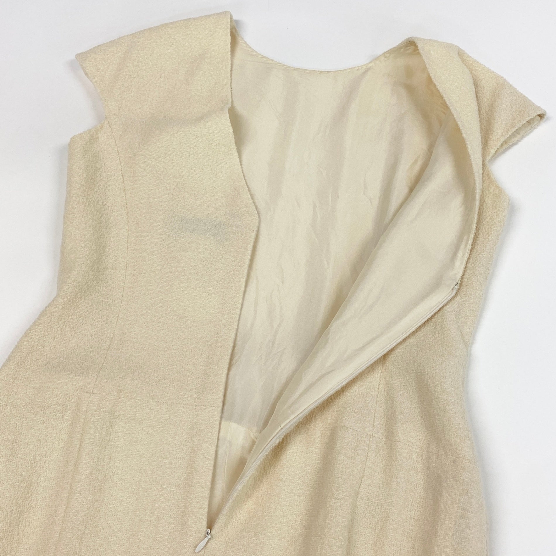 上品なアイボリーベージュの無地に、凹凸感のあるツイード織りが高級感を引き立てる一着です。 マットで立体感のあるツイード素材に、ウエストのペプラム切り替えが女性らしいシルエットを演出。 裾の切り替えデザインとさりげないロゴプレートがアクセントになっています。 シャネルらしい気品とクラシカルな佇まいで、入学式・パーティー・セレモニーシーンに映えるエレガントなワンピースです。