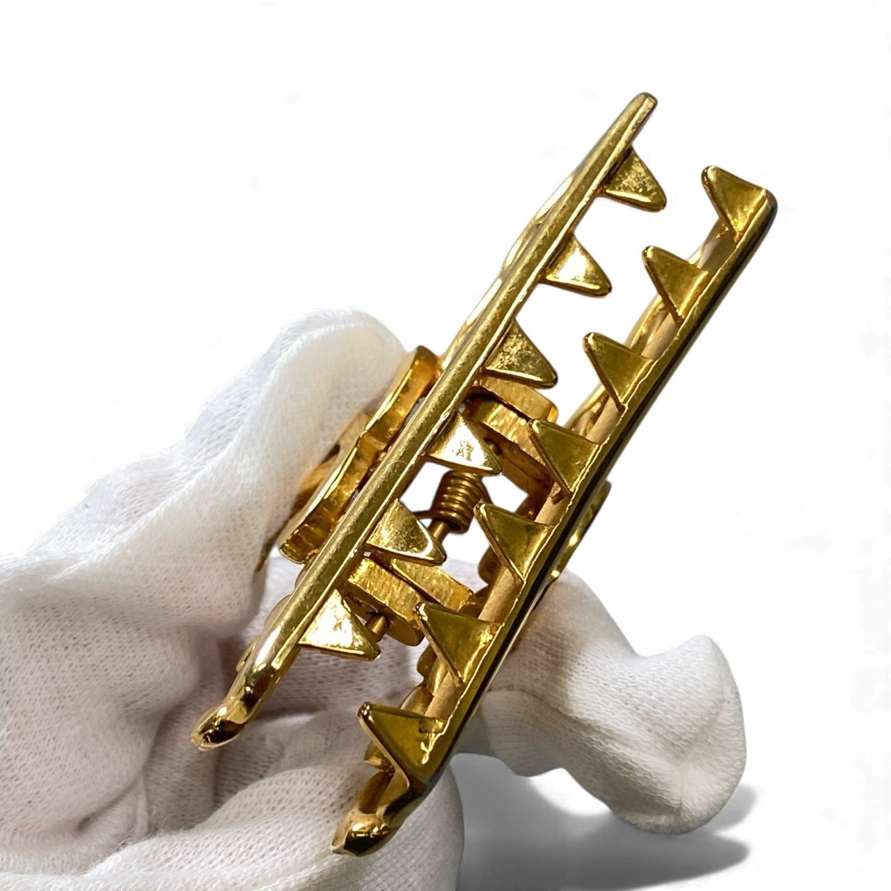 シャネルらしい存在感のあるゴールドカラー(マット寄りのアンティークゴールド調)が印象的なヘアクリップです。 チェーンモチーフを立体的に編み込んだデザインに、大きめのダブルCロゴが装飾され、クラシックで高級感のある仕上がりです。 表面には滑らかなメタル質感があり、シンプルなまとめ髪にアクセントを与える華やかなアイテムです。 フォーマル、パーティー、デイリーコーデのワンポイントなど幅広いシーンで活躍します。 コレクションとしても人気が高く、シャネル小物をお探しの方におすすめです。