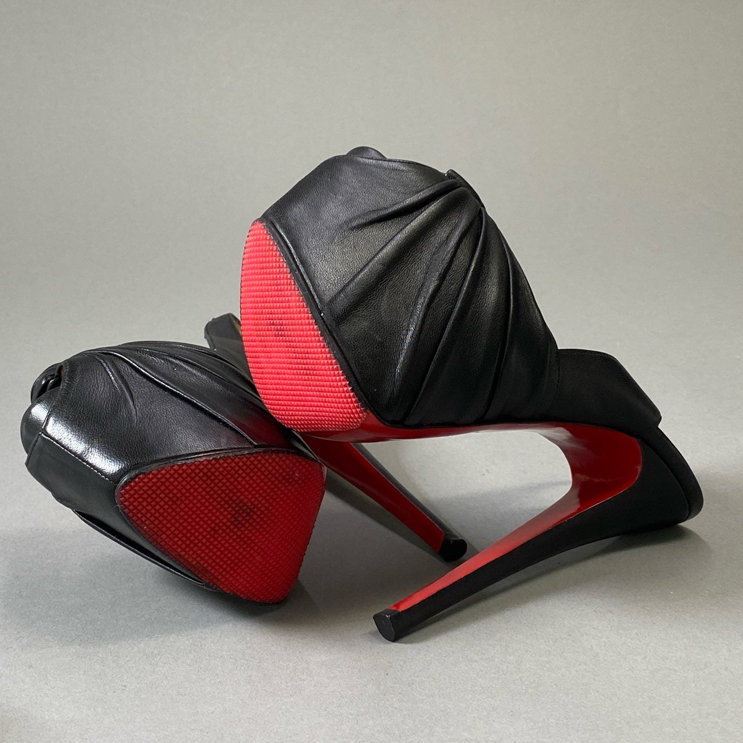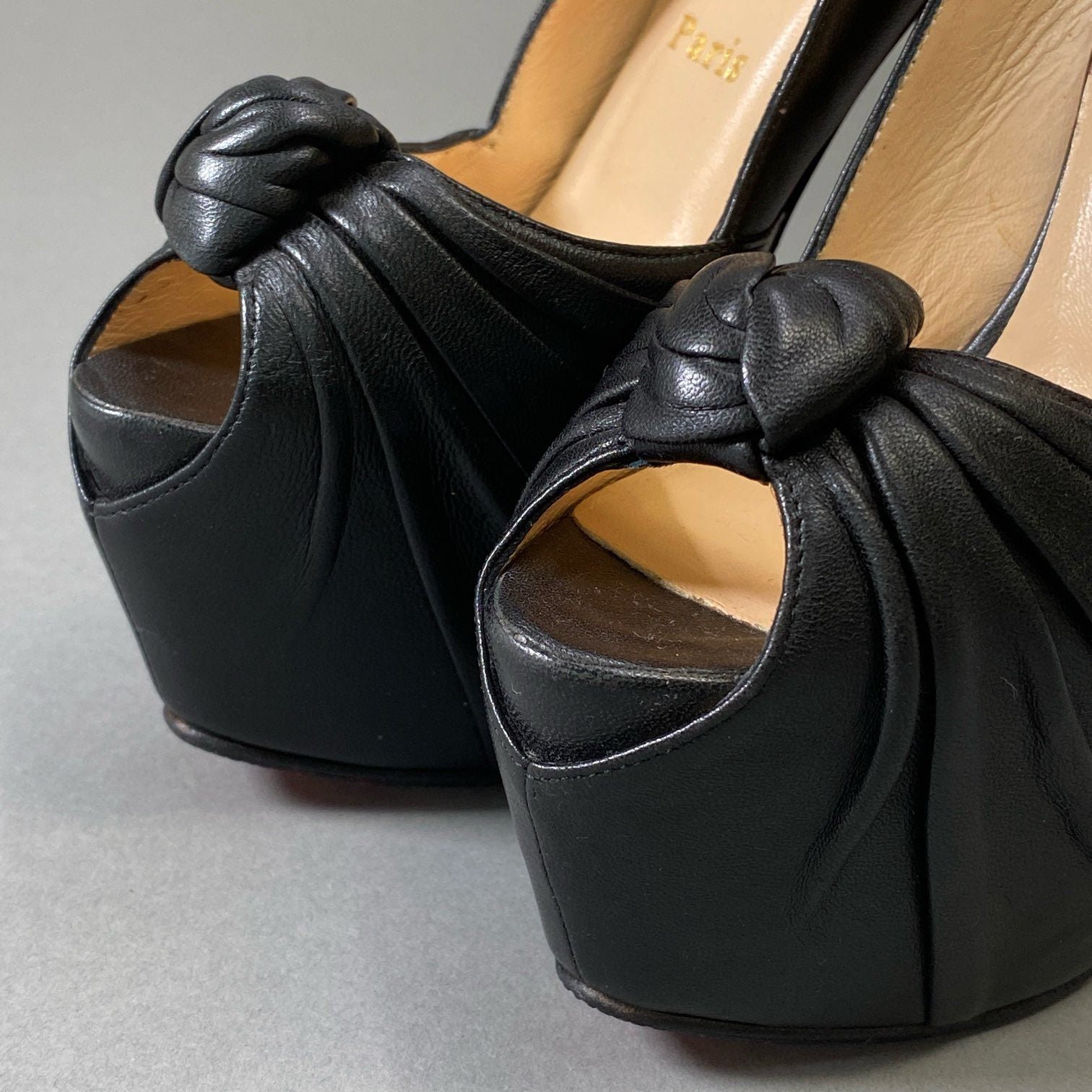 クリスチャンルブタンのプラットフォームパンプス。艶やかなブラックレザーを使用し、フロントに施されたドレープとノットディテールが華やかさを演出します。スリングバックのアンクルストラップが女性らしい足元を際立たせ、ルブタンらしいレッドソールが後ろ姿までエレガントに仕上げます。15cmヒールの迫力あるシルエットは、パーティードレスやイブニングスタイルを一層ドラマティックに引き立てます。特別なシーンで圧倒的な存在感を放つ一足です。
