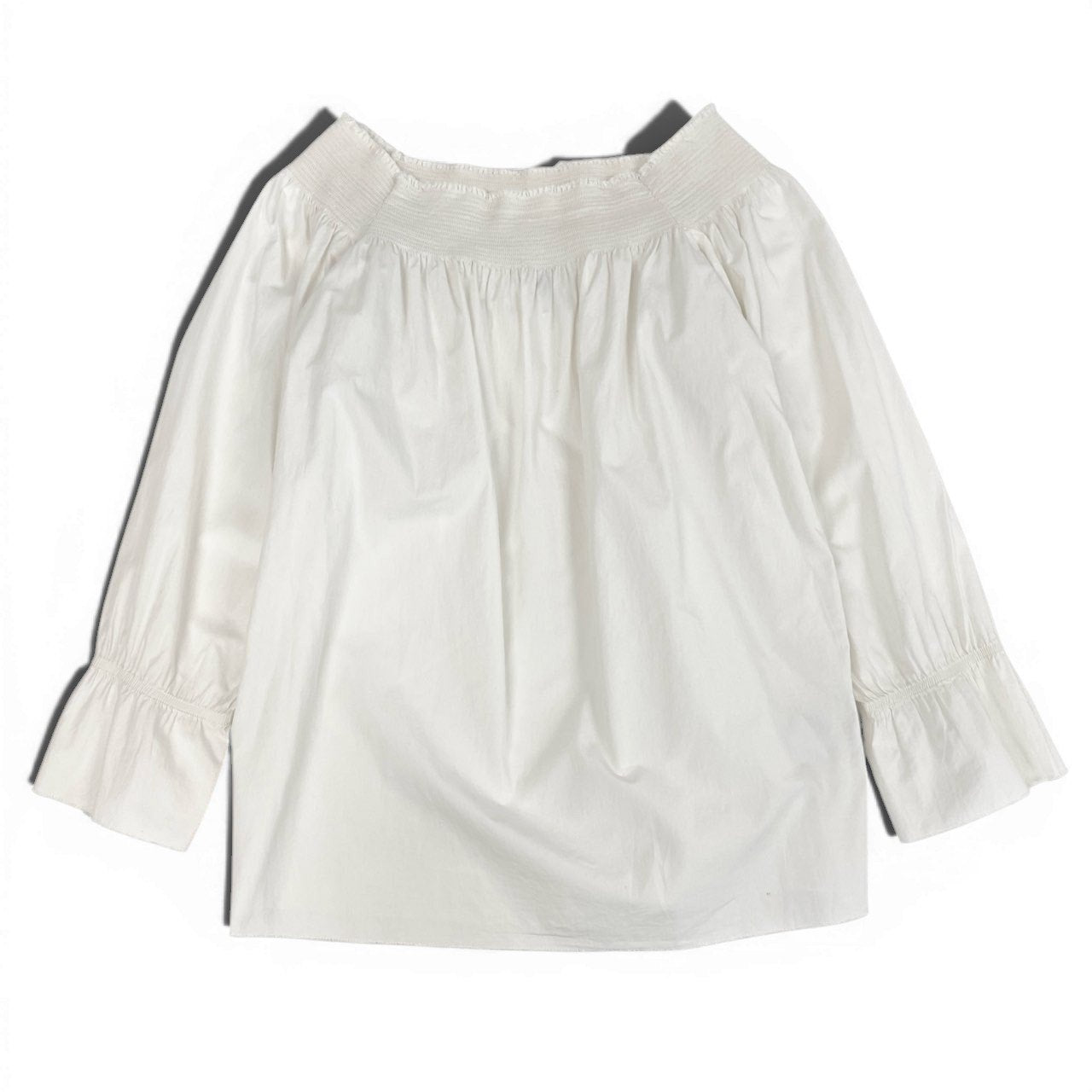 **MM6**らしいミニマルかつモードな雰囲気漂うブラウスです。清潔感のあるオフホワイトカラーに、ギャザーを寄せたオフショルダーデザインが女性らしい抜け感を演出します。コットン100%のマットで軽やかな素材感で、肌当たりも良く快適な着心地です。デニムやワイドパンツと合わせたカジュアルスタイルから、きれいめな外出コーデまで幅広く活躍する一着です。