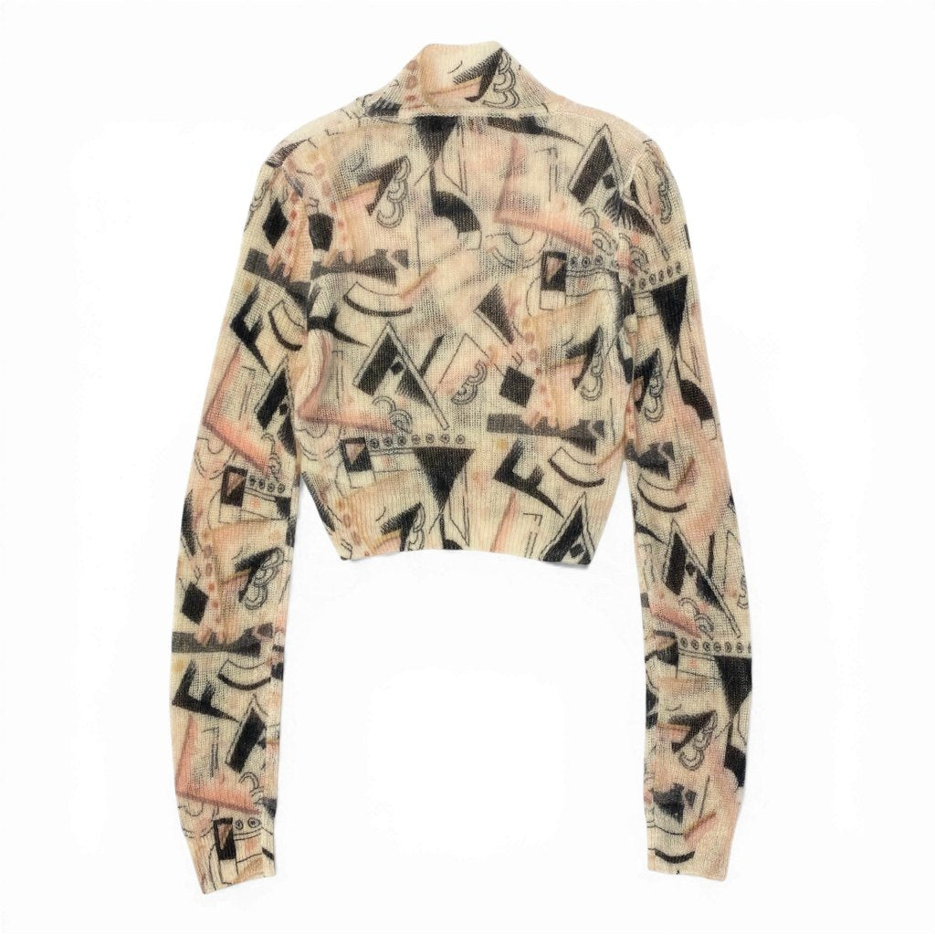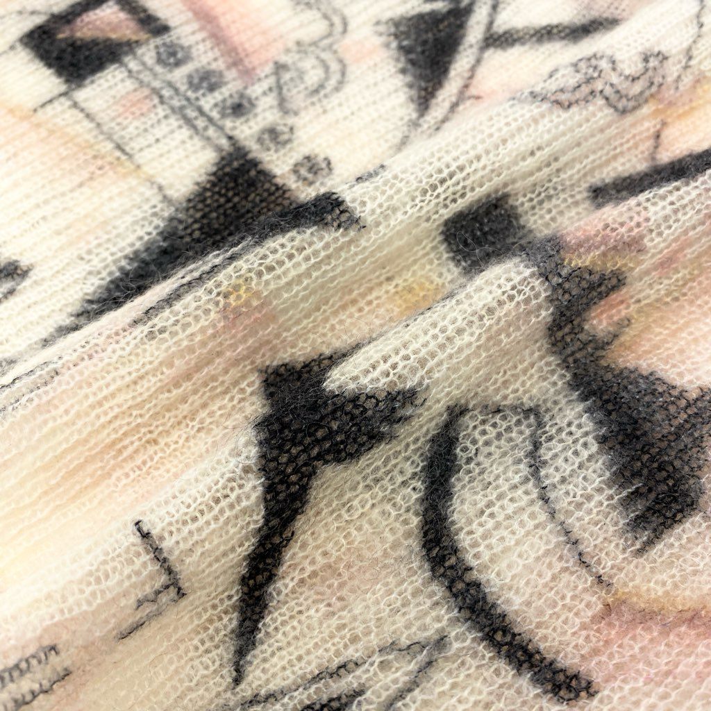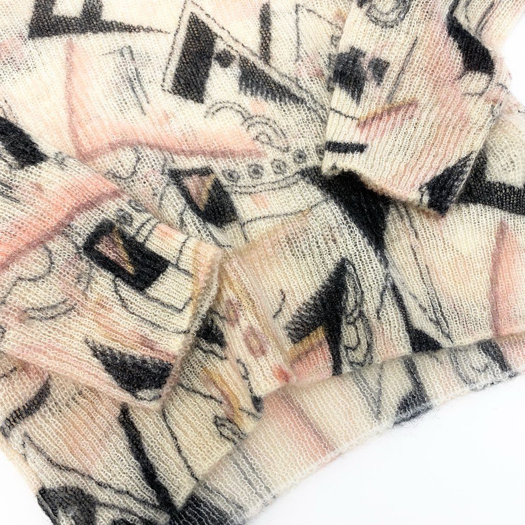 フェンディらしいアーティスティックな世界観が際立つ、2022年モデルのモヘアニットセーター。 ベージュ系をベースに、ブラックやオレンジを効かせた抽象的な総柄パターンが目を引くデザインです。 ローゲージで柔らかなモヘア素材により、軽さと暖かさを兼ね備えています。 ハイネック×ショート丈のバランスが良く、ハイウエストボトムと合わせたモード感のあるスタイリングに最適な一着です。