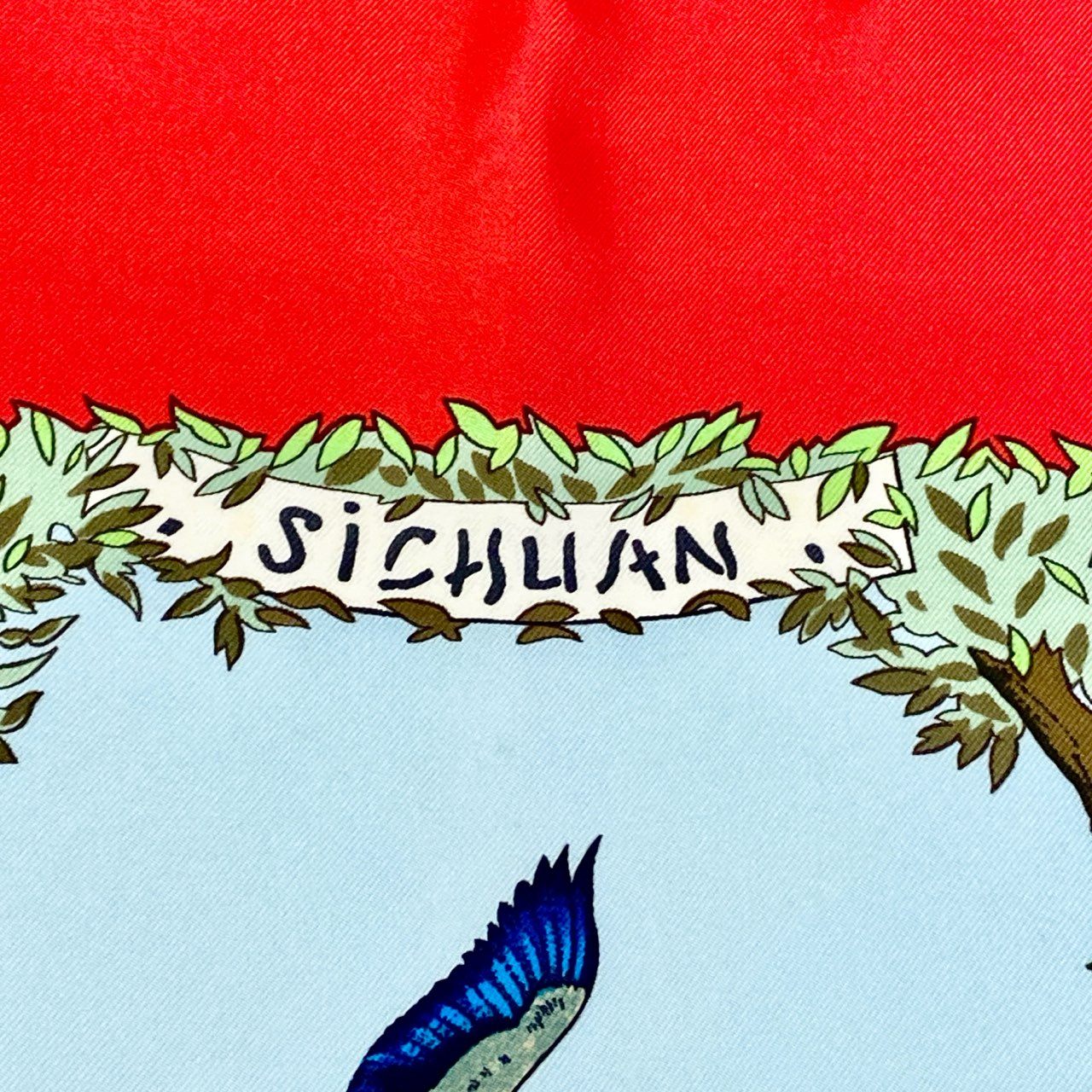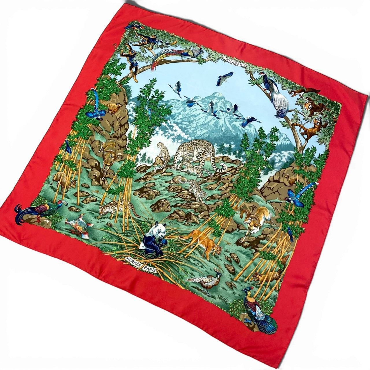 鮮やかなチャイニーズレッドの縁取りに、四川省の自然と動物たちを描いたアニマルプリントが広がる印象的な一枚です。 パンダや豹、山羊、色鮮やかな鳥たちが、スカイブルーの山岳風景とグリーンの竹林の中に生き生きと表現されています。 繊細なタッチと美しい発色、なめらかな光沢のシルク素材がエルメスならではの芸術性を感じさせます。 首元に巻くだけでコーディネートの主役となり、シンプルな装いを華やかに格上げするラグジュアリーなカレ90です。