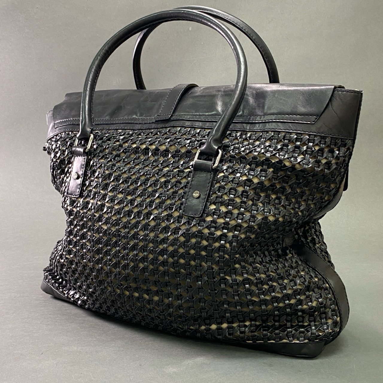Eb10 LEONELLO BORGHI レオネロボルギ イントレチャート ショルダーバッグ ブラック レザー 編み込み 大容量◎ 鞄 Y2K