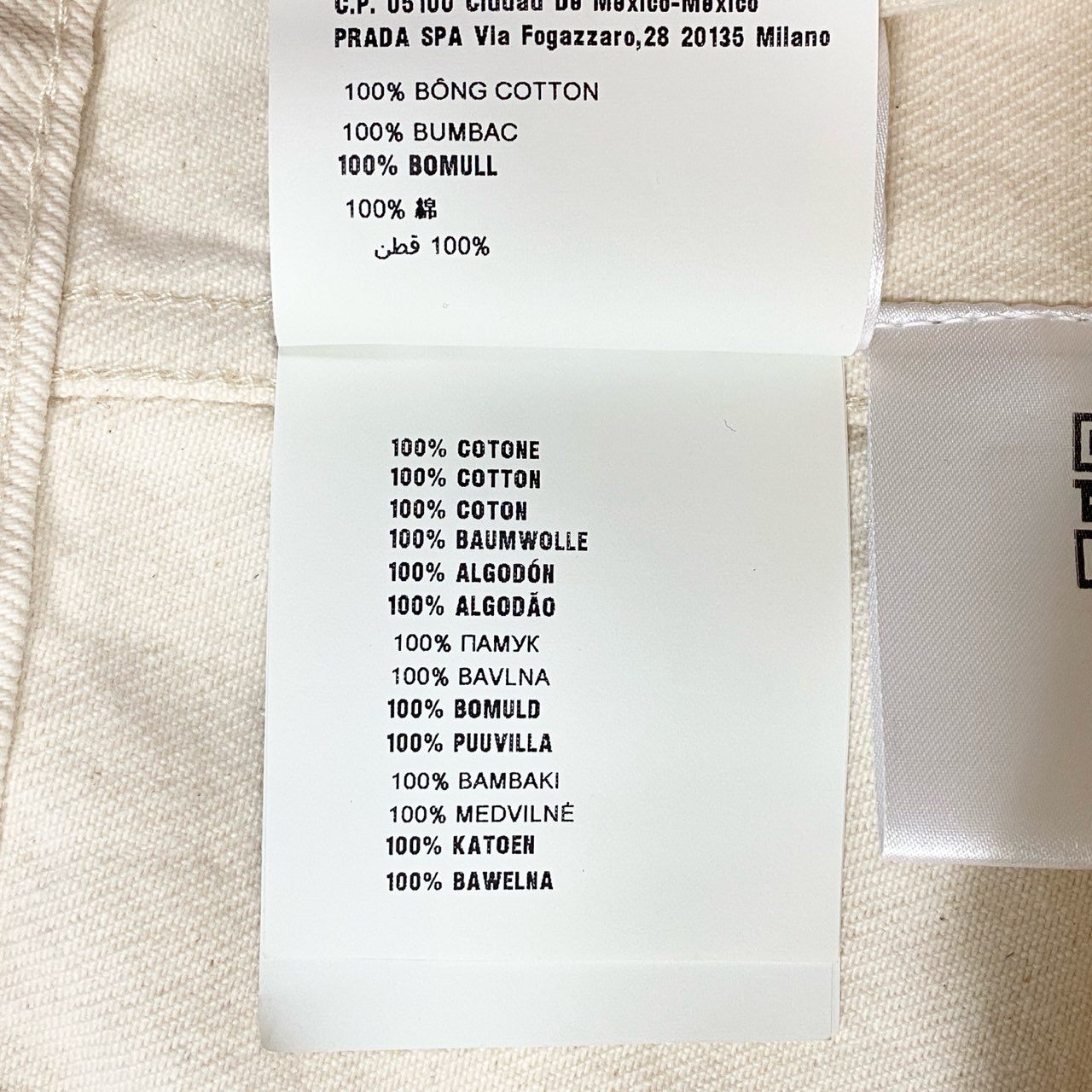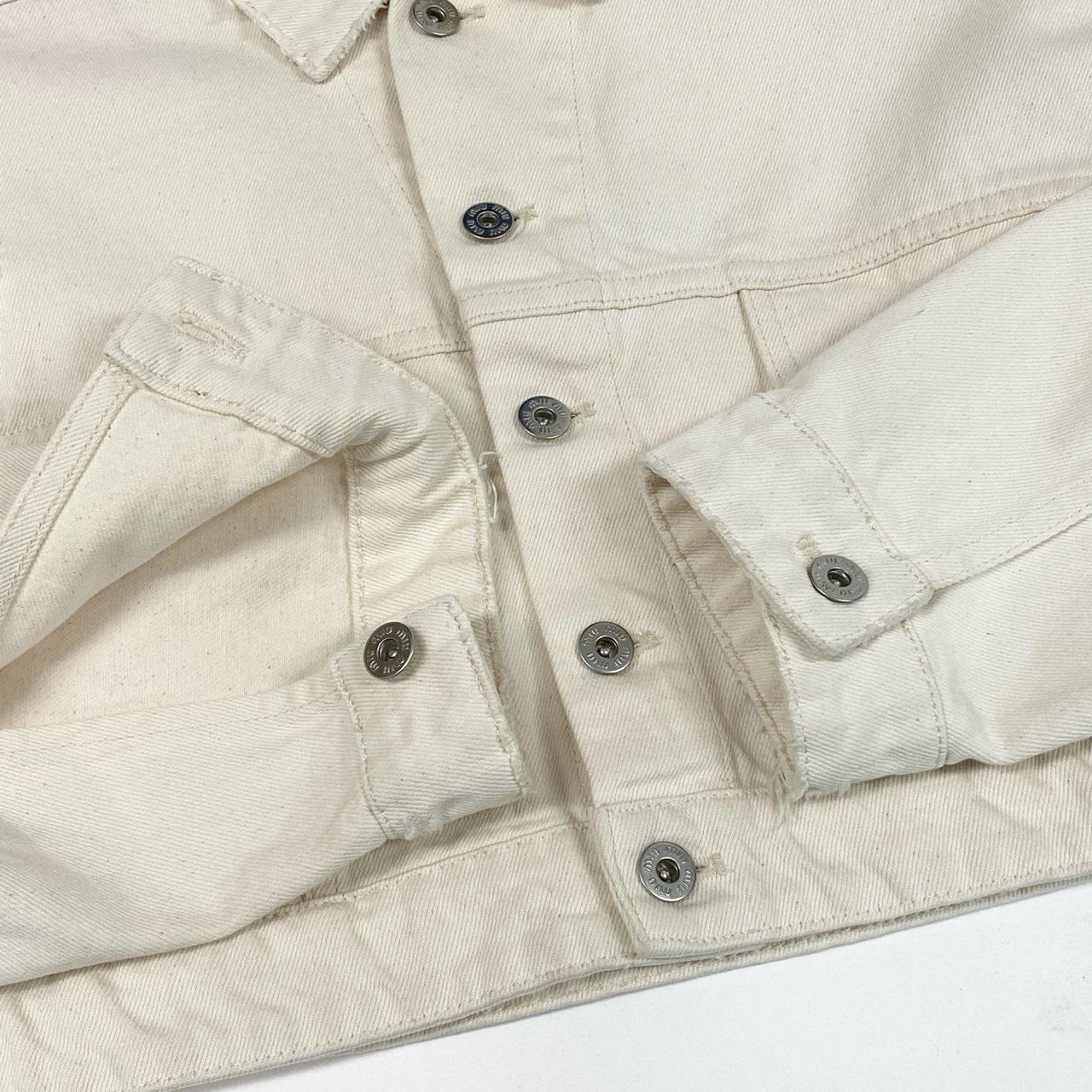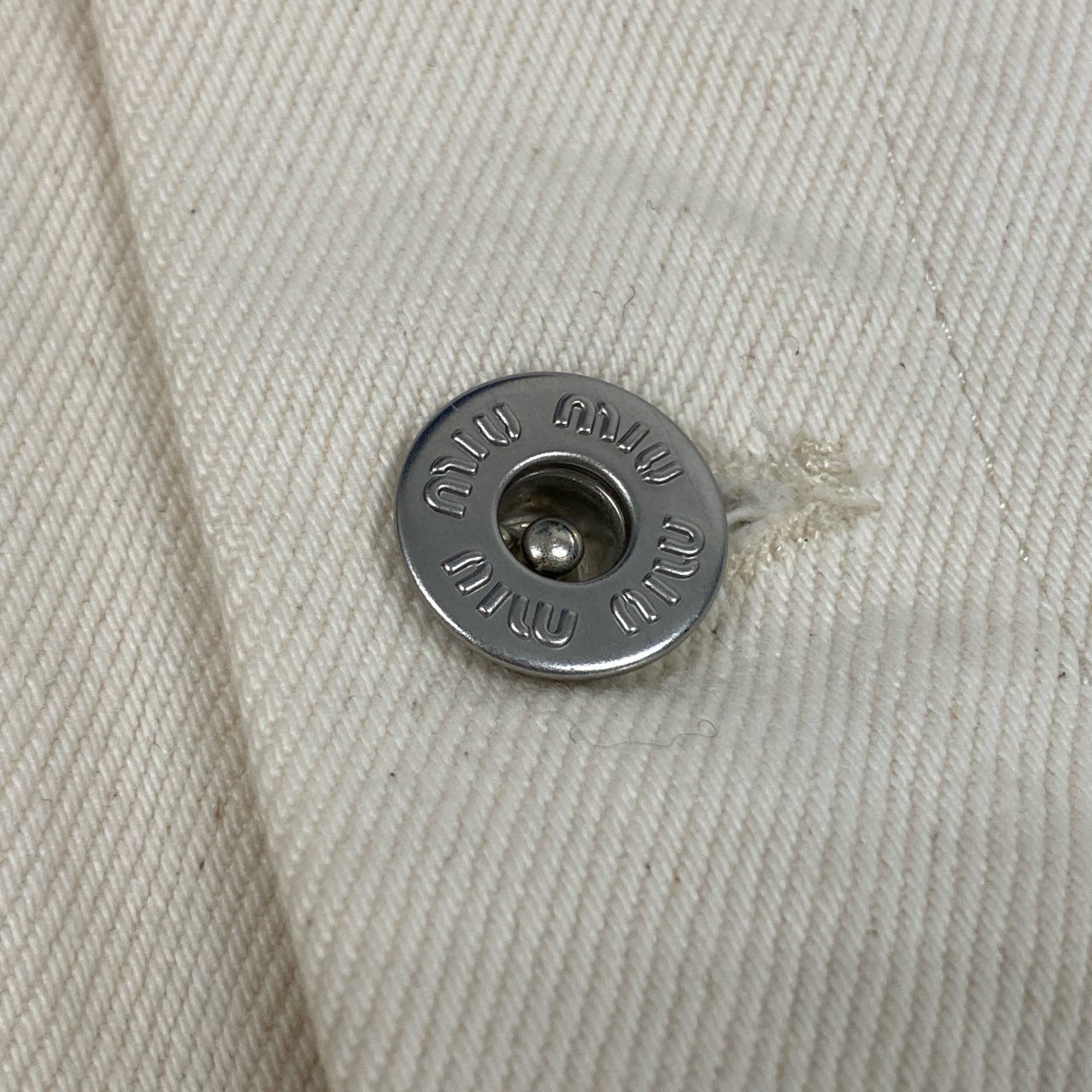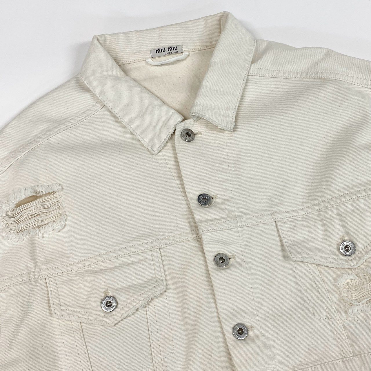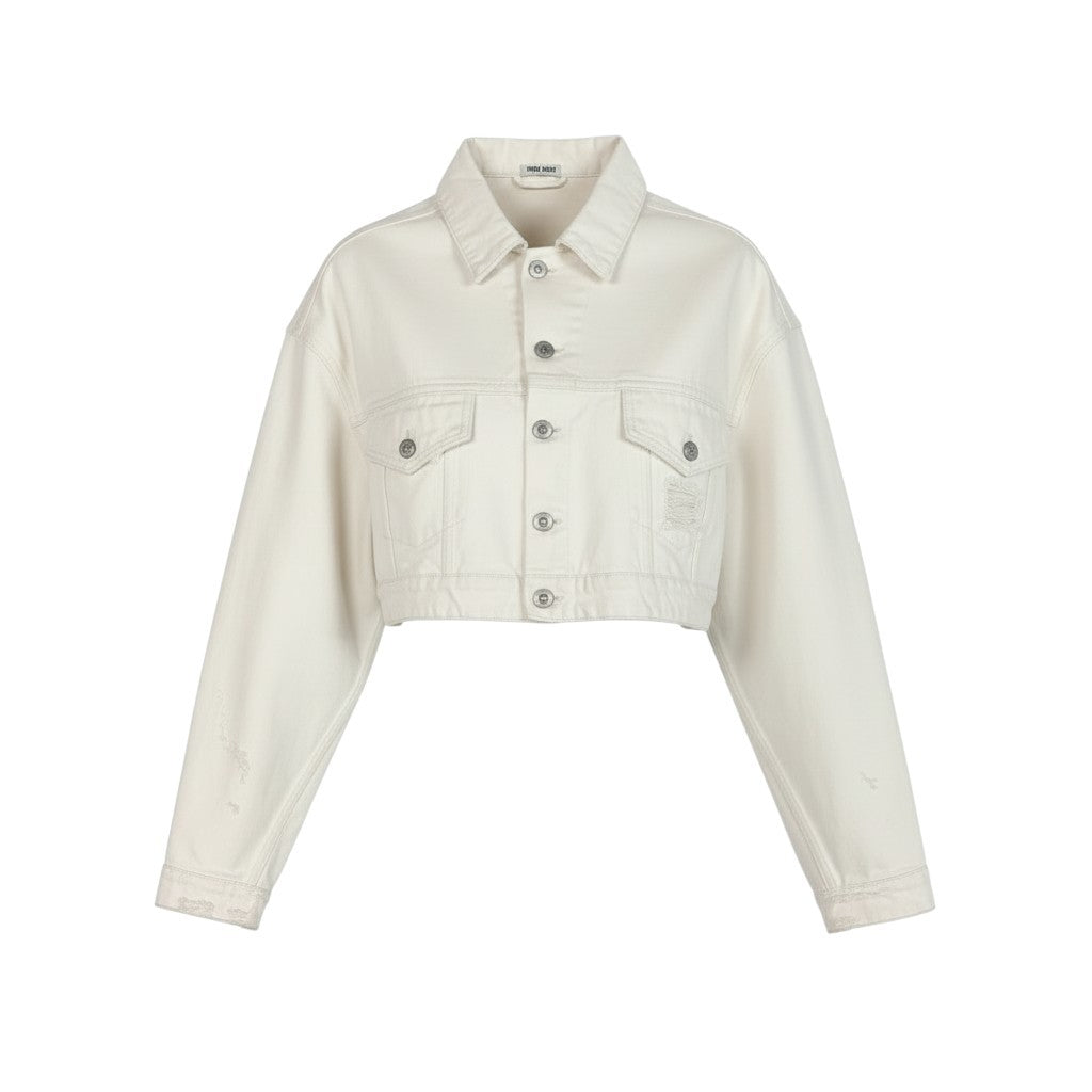 miu miuのレディース クロップドデニムジャケットです。アイボリーホワイト系カラーのデニムに、ダメージ加工とバックのロゴプリントが映えるデザイン。コットンデニムならではのマットでしっかりした素材感ながら、クロップド丈で軽快な印象に仕上がっています。ハイウエストボトムやワンピースと相性が良く、デイリーからモードなカジュアルスタイルまで幅広く活躍する一着です。