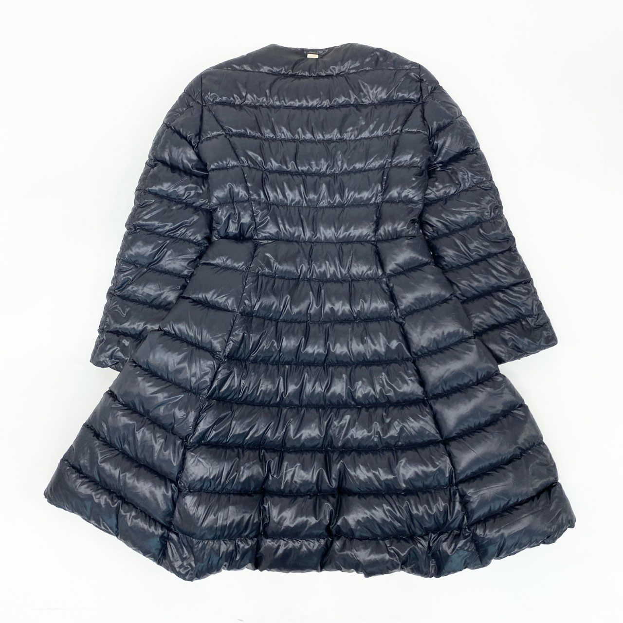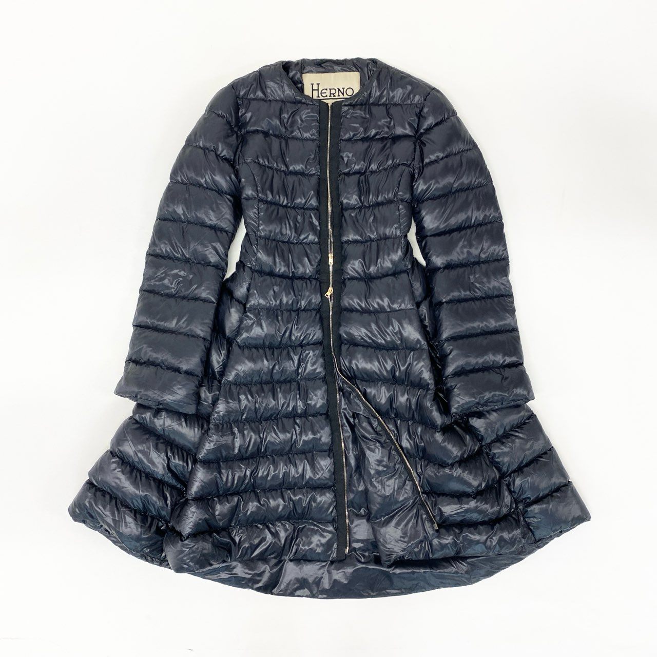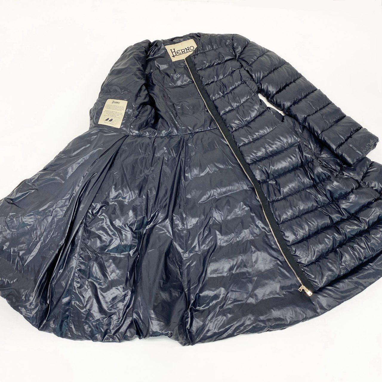 HERNO(ヘルノ)のダウンコート〈PI337D-12017-9300〉。上品なミッドナイトネイビーの光沢ナイロン素材を使用し、軽やかで高級感のある印象に仕上げられています。ノーカラーのすっきりとした首元とウエストから広がるフレアシルエットが女性らしいシルエットを演出。ゴールドジップのディテールが上品なアクセントになり、デイリーからフォーマルまで幅広く活躍する一着です。