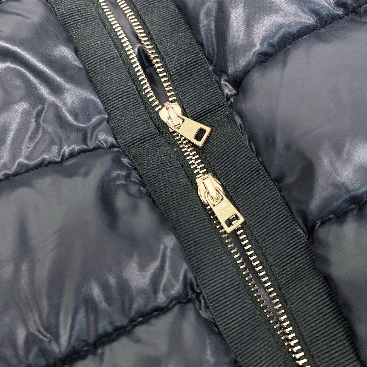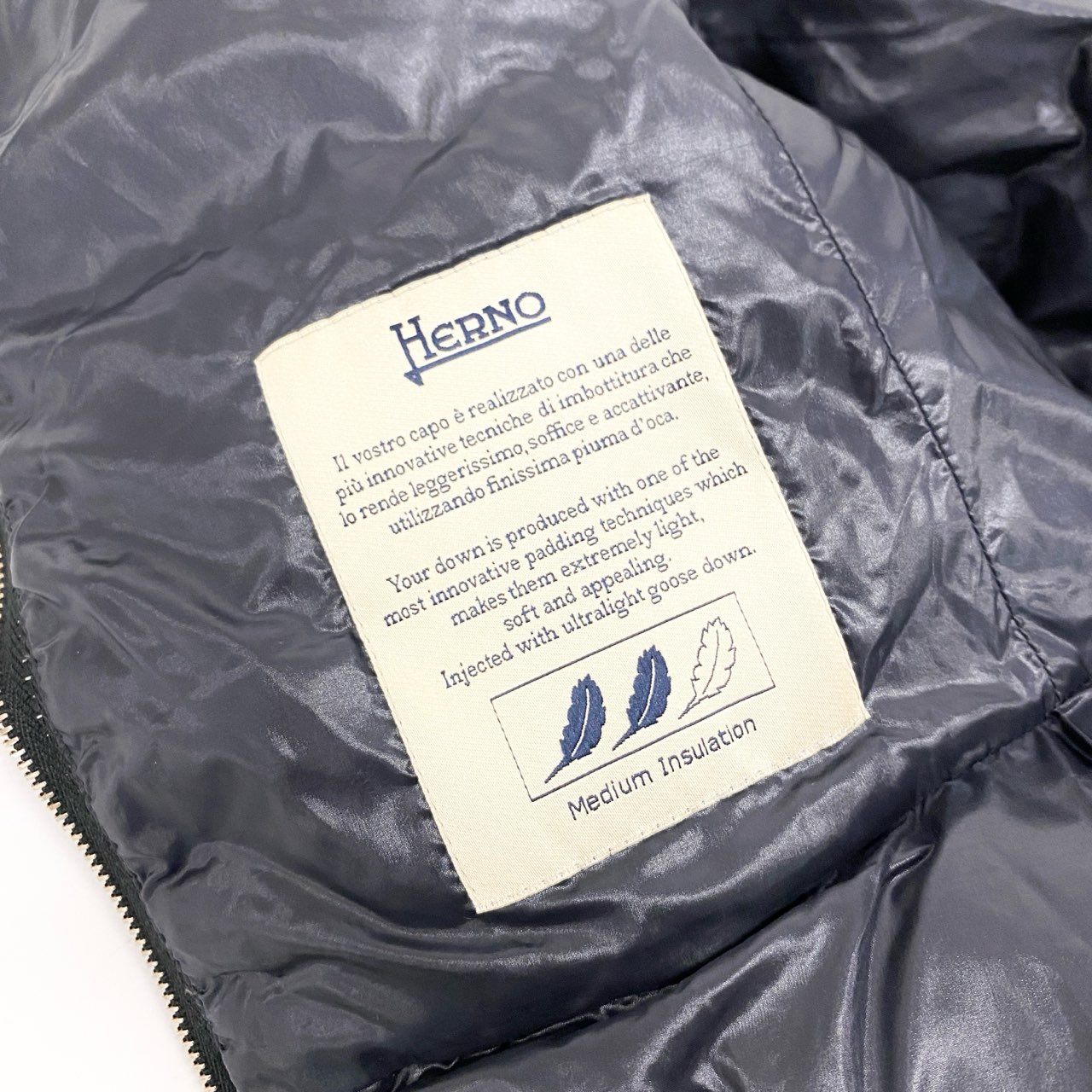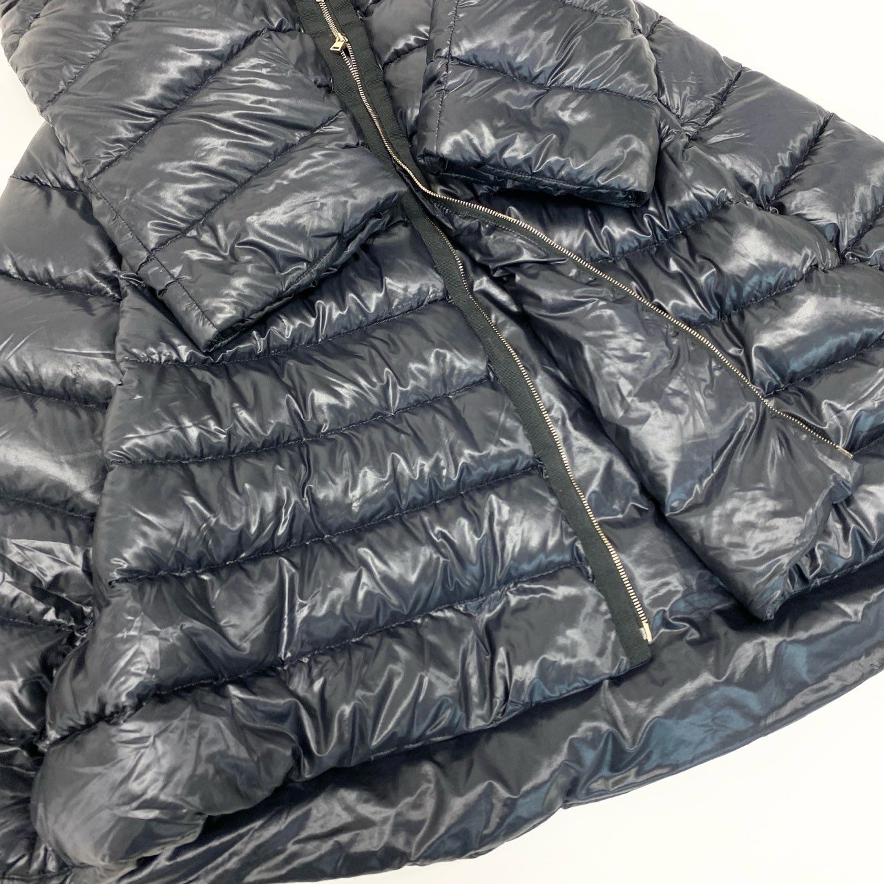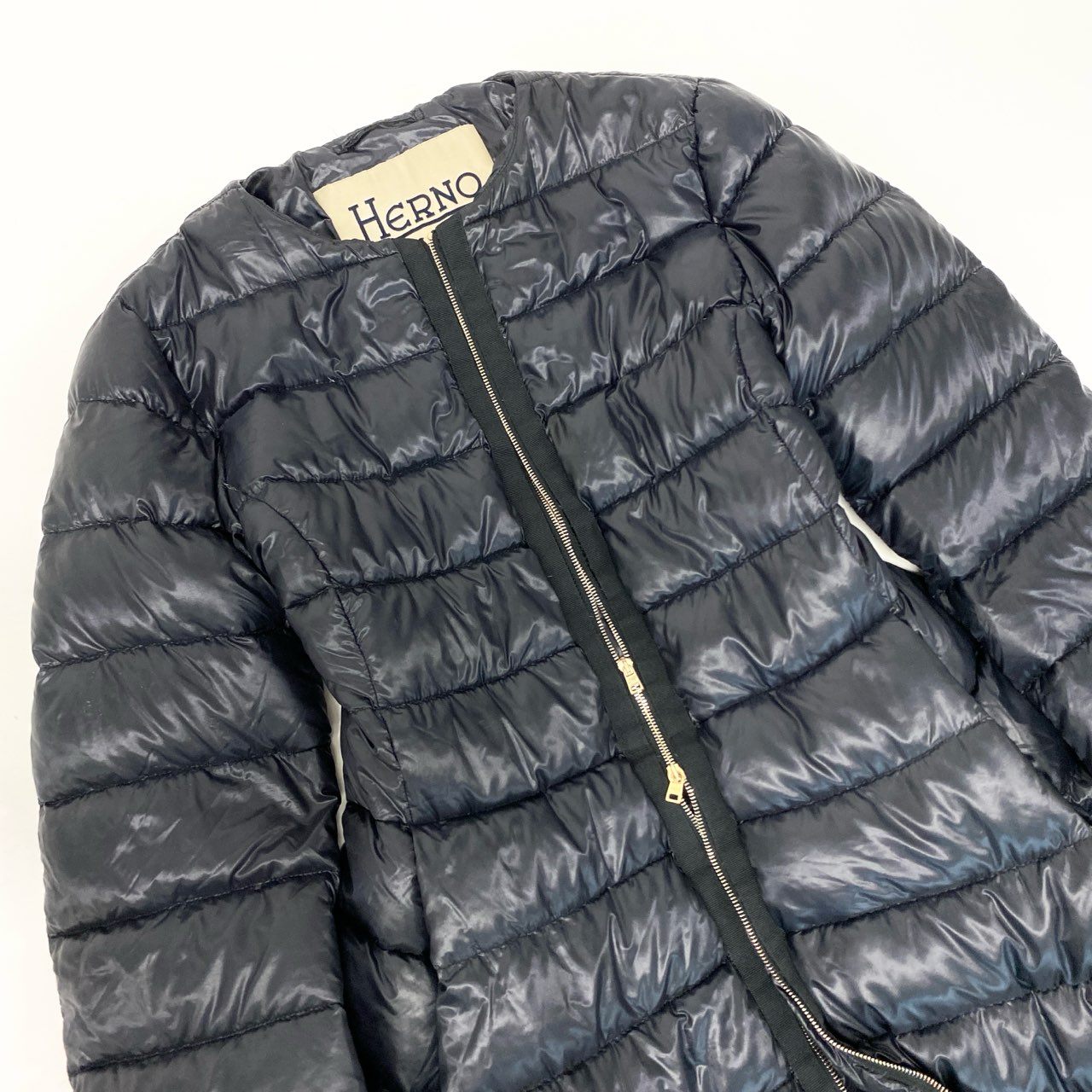 HERNO(ヘルノ)のダウンコート〈PI337D-12017-9300〉。上品なミッドナイトネイビーの光沢ナイロン素材を使用し、軽やかで高級感のある印象に仕上げられています。ノーカラーのすっきりとした首元とウエストから広がるフレアシルエットが女性らしいシルエットを演出。ゴールドジップのディテールが上品なアクセントになり、デイリーからフォーマルまで幅広く活躍する一着です。