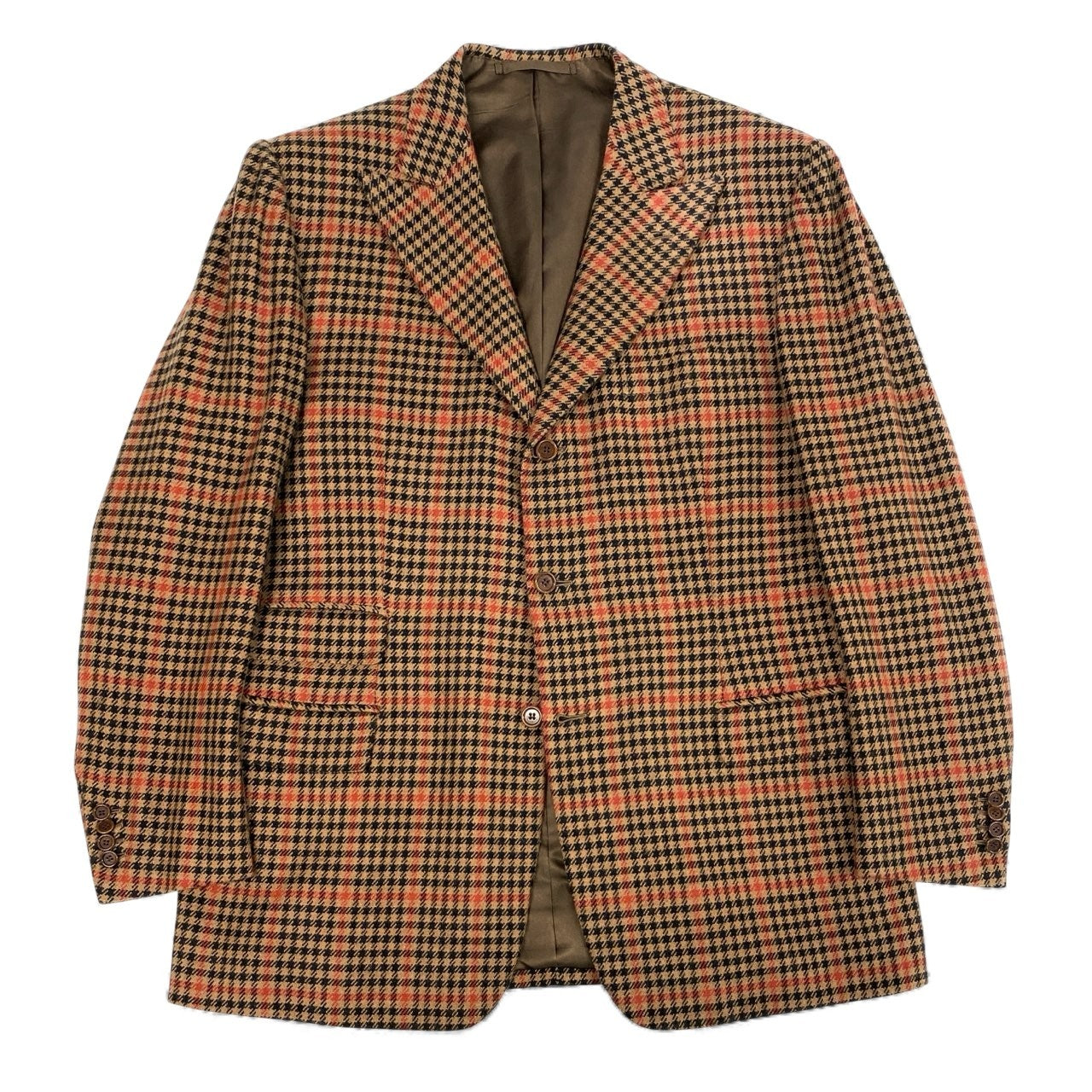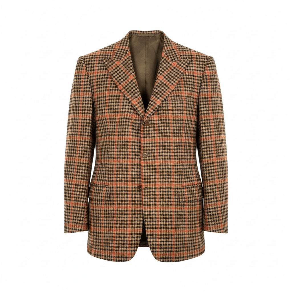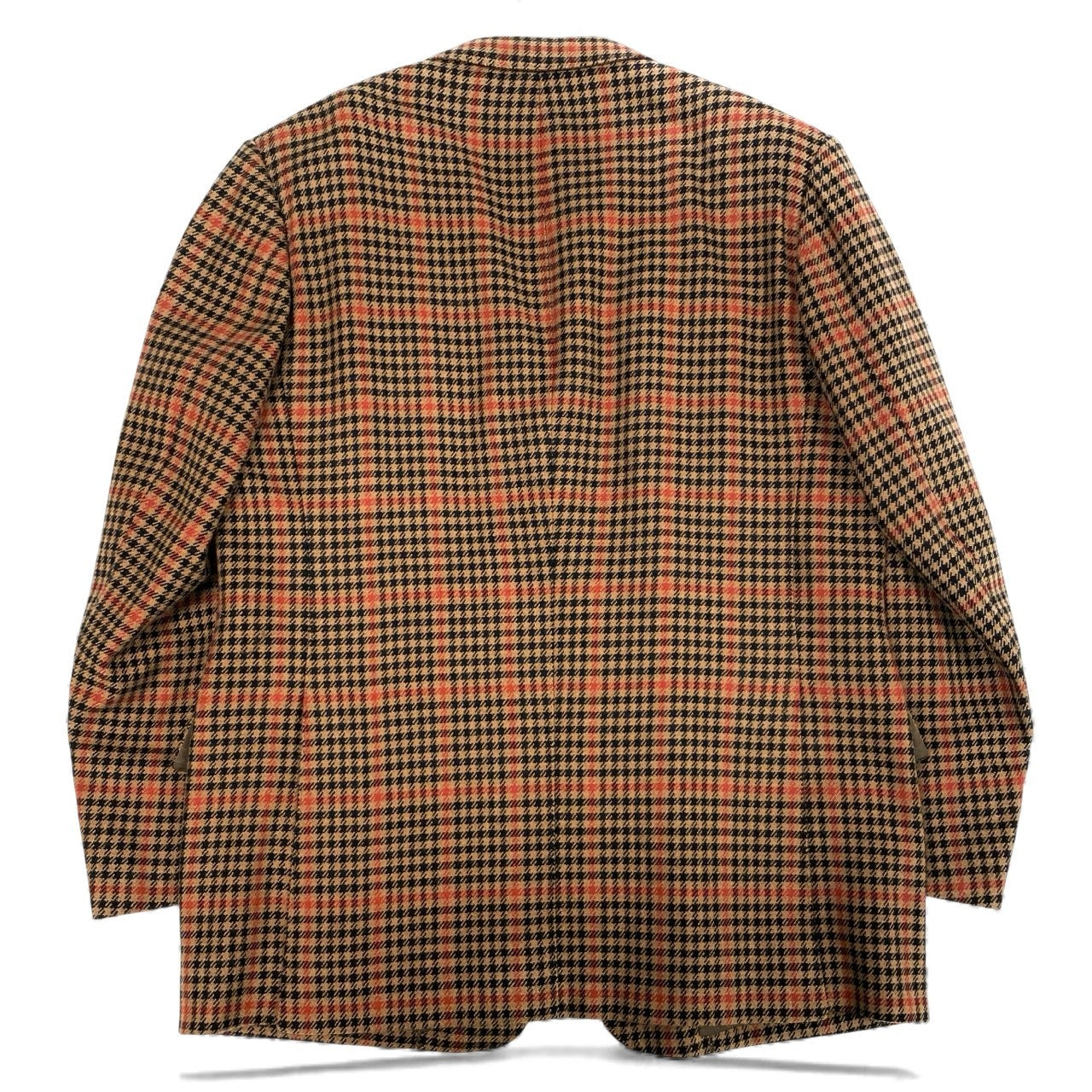 落ち着いたブラウン×オレンジ系の英国チェック柄が印象的な、Tindaro de Ruca「サルトリア ミラネーゼ」テーラードジャケットです。ウールらしいマットで上質な質感に、2005年ビスポークらしい重厚な構築美が映える一着。ロング丈のしっかりしたシルエットで、クラシックな英国調コーデや大人のカントリージャケットとして活躍します。XXLのゆったりサイズで、肩周りや胸囲に余裕が欲しい方にも安心。ビジネス、ジャケパン、トラッドスタイルなど幅広いシーンで着用いただけます。