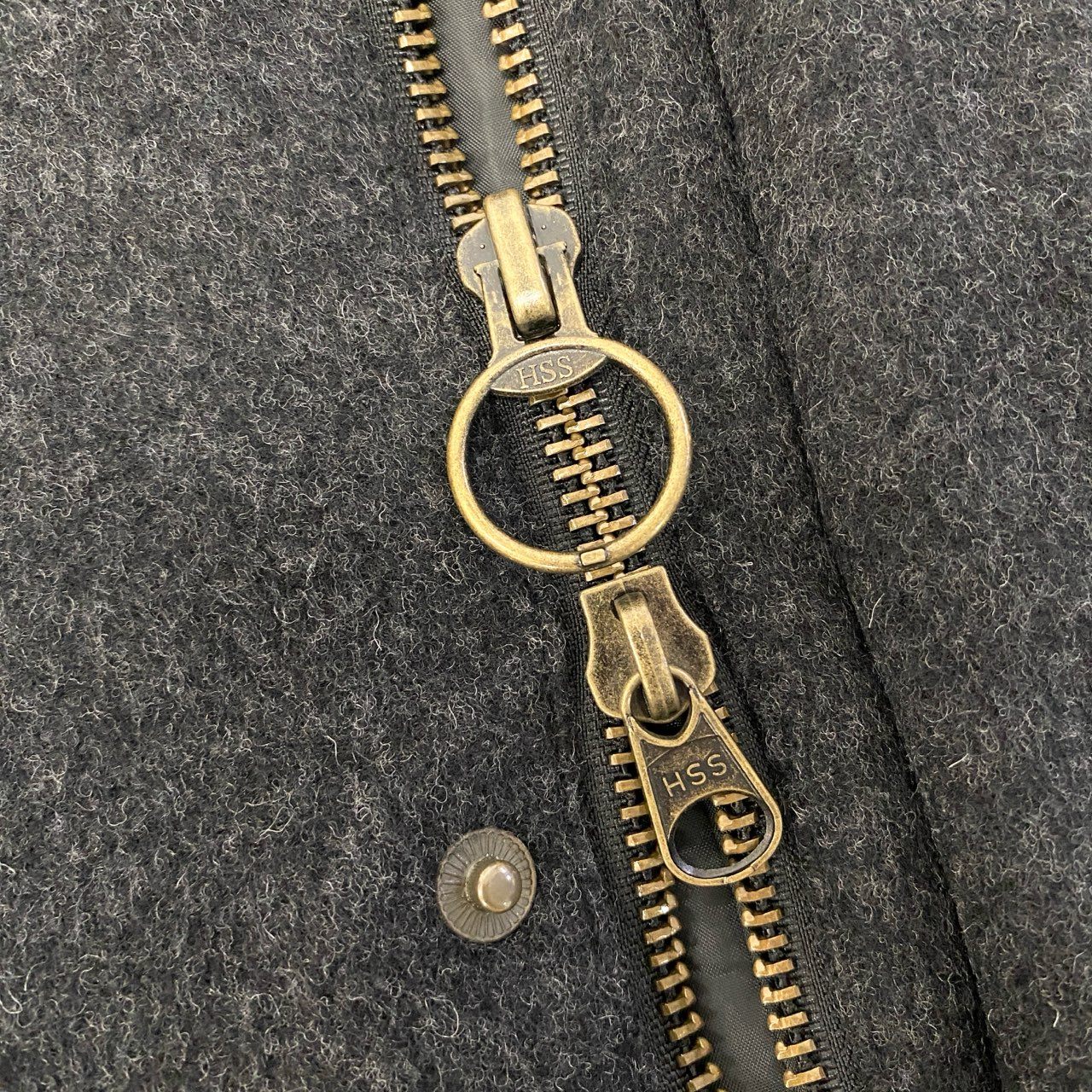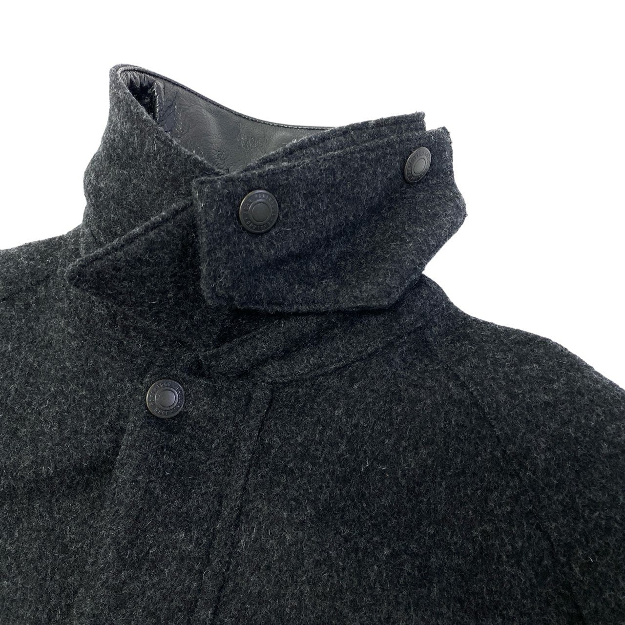 John Partridgesのクラシックな雰囲気を感じさせるクロップドウールジャケットです。チャコールグレー系のマットなウール生地に、襟部分のブラックレザー切替が上品なアクセントになっています。フロントはメタルスナップボタン仕様で、大きめのフラップポケットが実用性とデザイン性を兼ね備えたディテールです。ショート丈のボックスシルエットで、デニムやスラックスなど幅広いスタイルに合わせやすい秋冬向けアウターです。