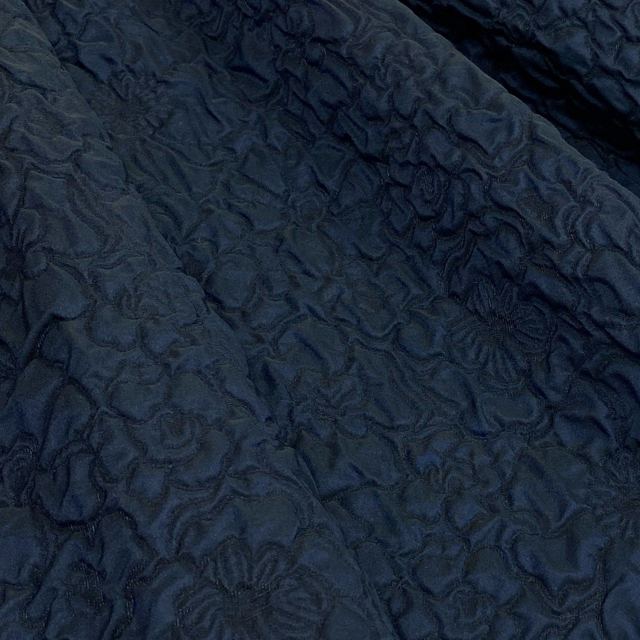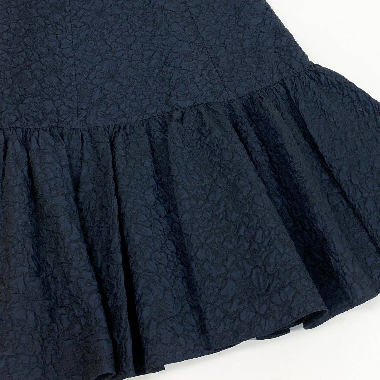 深みのあるミッドナイトネイビーのフローラルジャカード織りが上品な印象のティアードスカートです。 マットな立体感のある生地で、総柄ながら落ち着いた高級感を演出します。 裾の切替フリル(ティアード)デザインが動きのあるエレガントなシルエットを形成します。 オフィススタイルからパーティー、フォーマルシーンまで幅広く活躍する一着です。