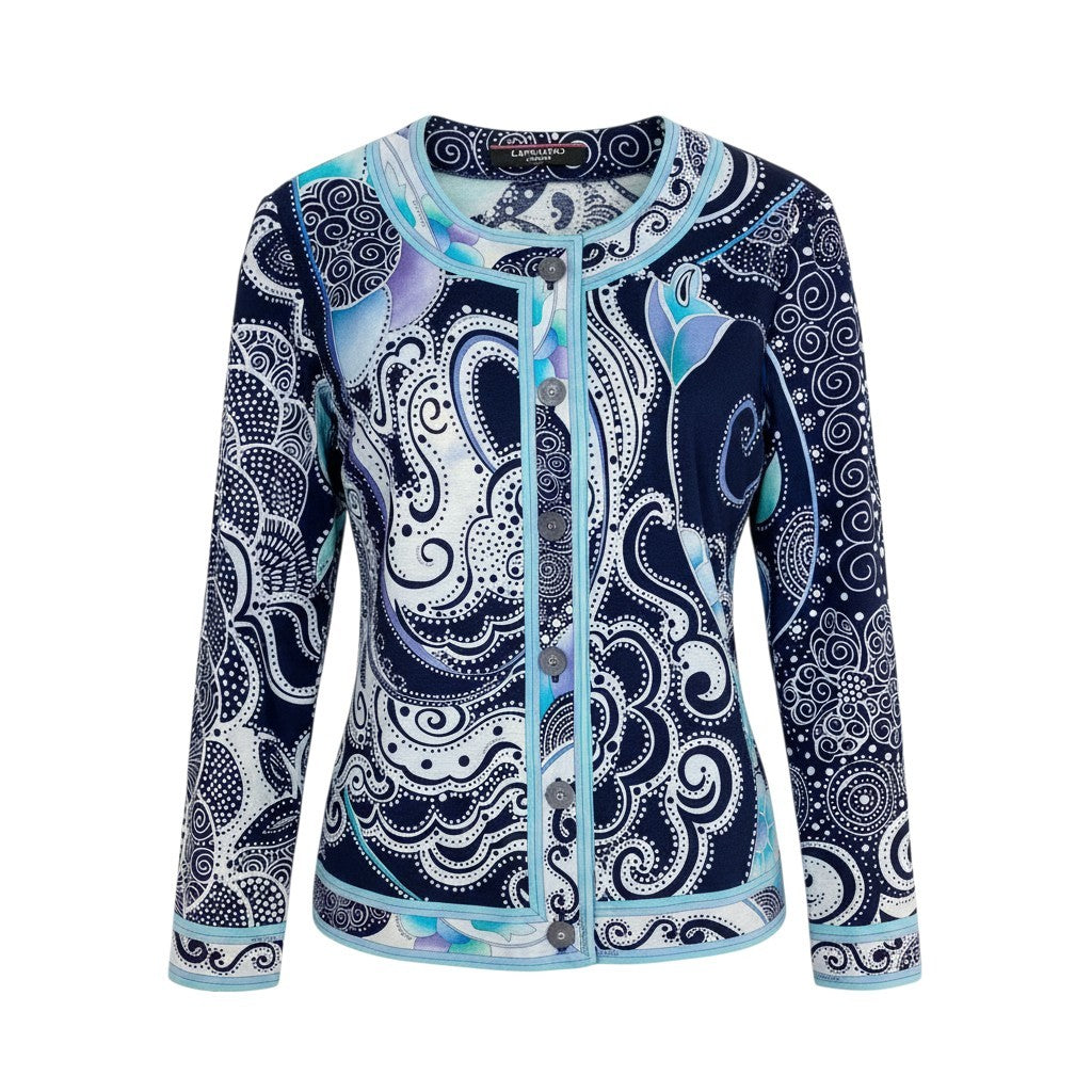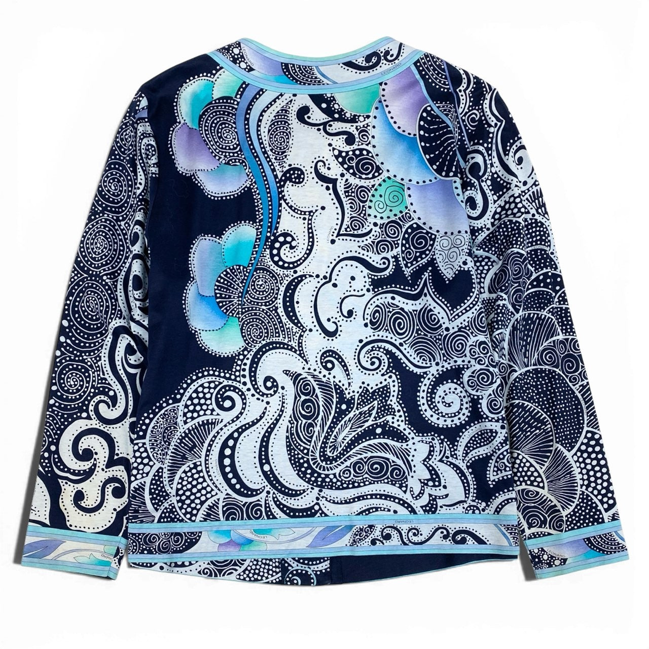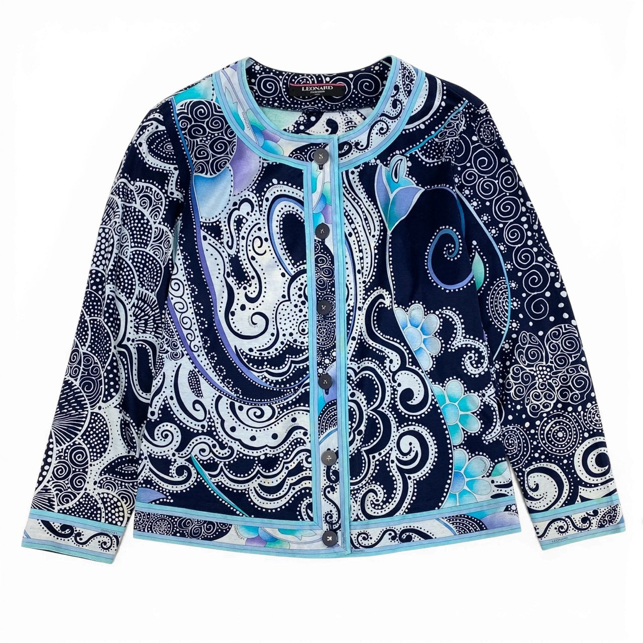 ミッドナイトネイビーをベースに、ホワイトとターコイズブルーが映えるレオナールらしい総柄カーディガンです。曲線的なペイズリー調モチーフとフラワー要素が組み合わさり、華やかで上品な印象を与えます。マットな質感のコットン100%素材で、肌当たりが良くデイリーにも取り入れやすい一枚です。シンプルなボトムスと合わせるだけで、コーディネートの主役になるアイテムです。