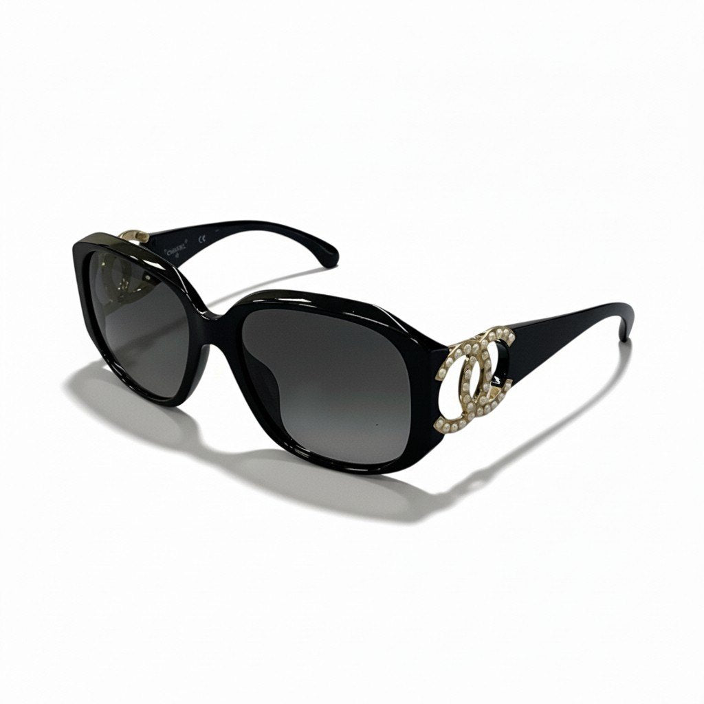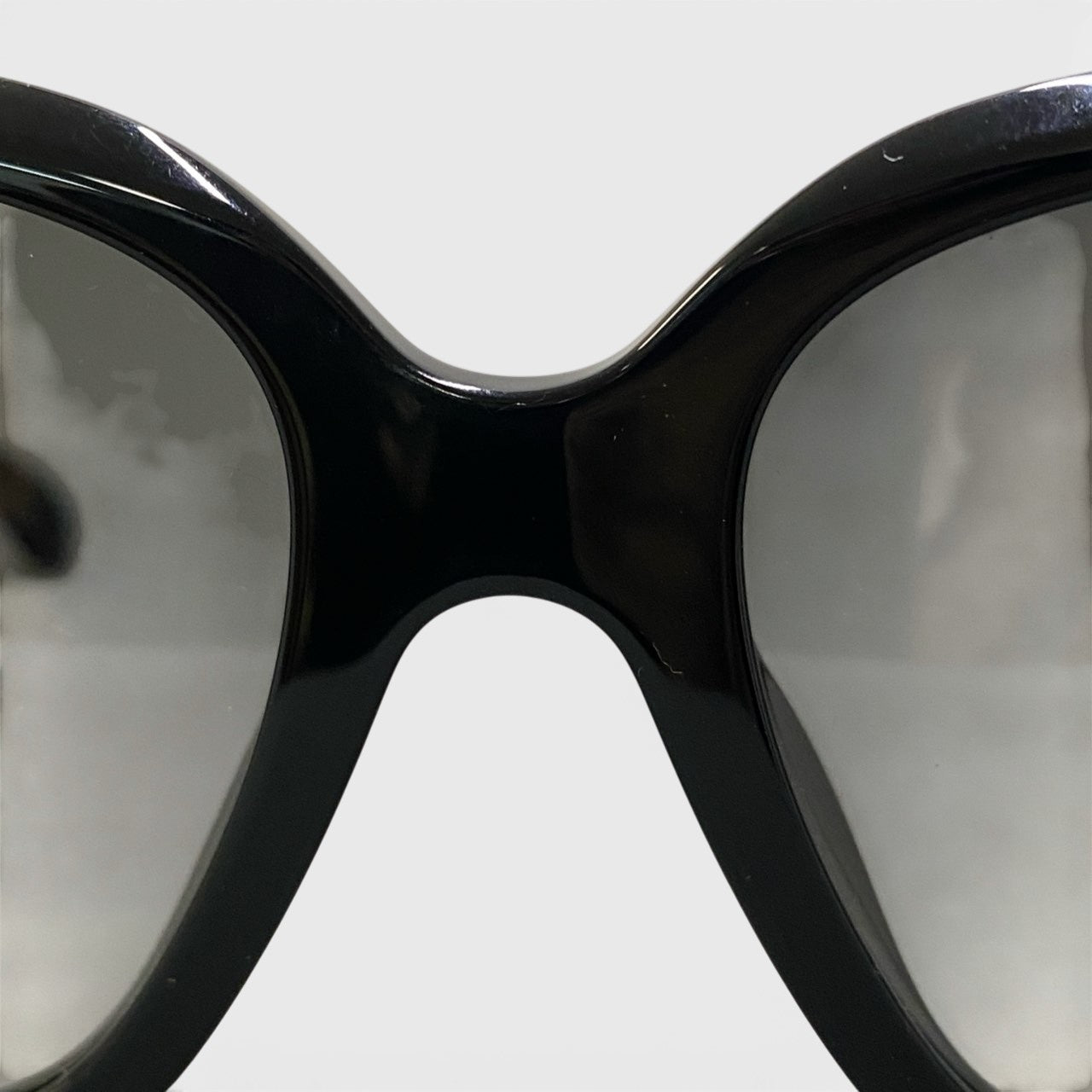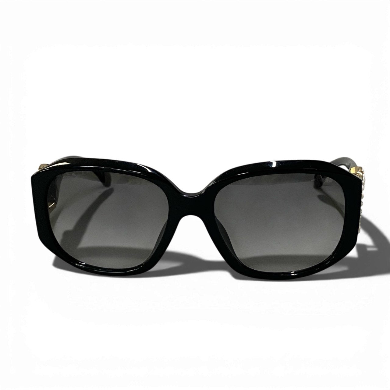 艶感のあるジェットブラックのアセテートフレームに、グレーからクリアへと変化するスモークグラデーションレンズを組み合わせたシャネルのサングラスです。サイドには立体的なゴールドココマークにパール装飾を施し、エレガントで華やかな印象を演出。丸みを帯びたスクエアシルエットがフェイスラインを柔らかく見せ、上品かつモードな雰囲気に仕上がっています。タウンユースはもちろん、リゾートスタイルやフォーマルな装いのアクセントにも映える一本です。