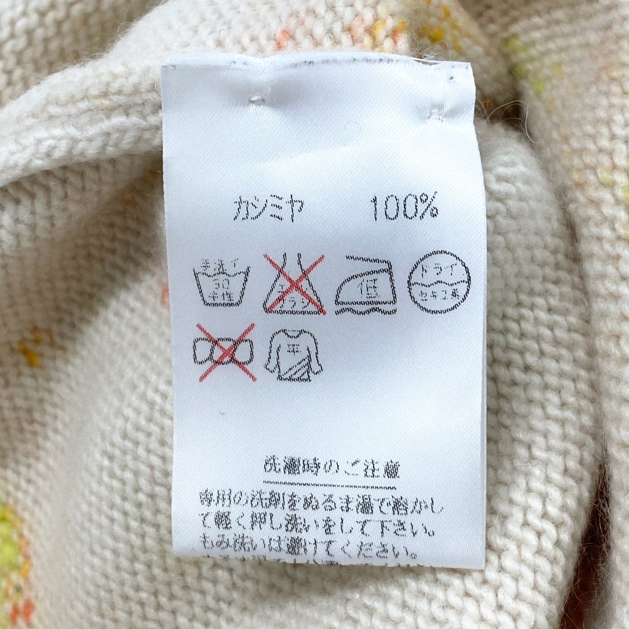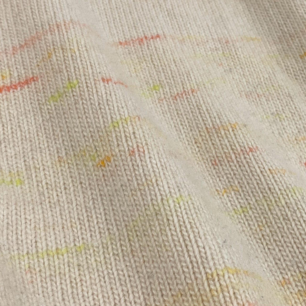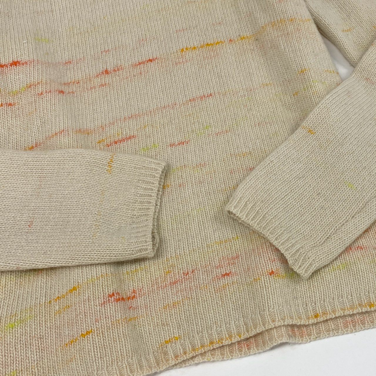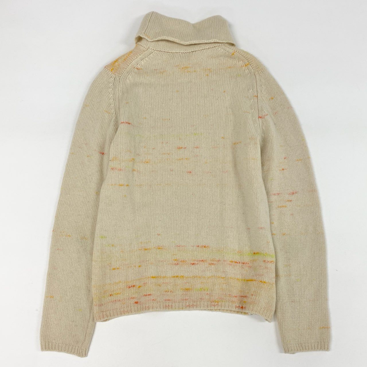 やさしい印象を与えるアイボリーベージュに、控えめなオレンジ・イエローのミックスカラーがアクセントになった一枚。素材は**極上カシミヤ100%(英国製)**で、軽やかなのに暖かく、チクチクしない着心地が魅力です。長めのタートルネックが首元をしっかり包み、防寒性も抜群。シンプルながらニュアンスのあるデザインで、秋冬のスタイリングにぬくもりと個性を添えてくれます。