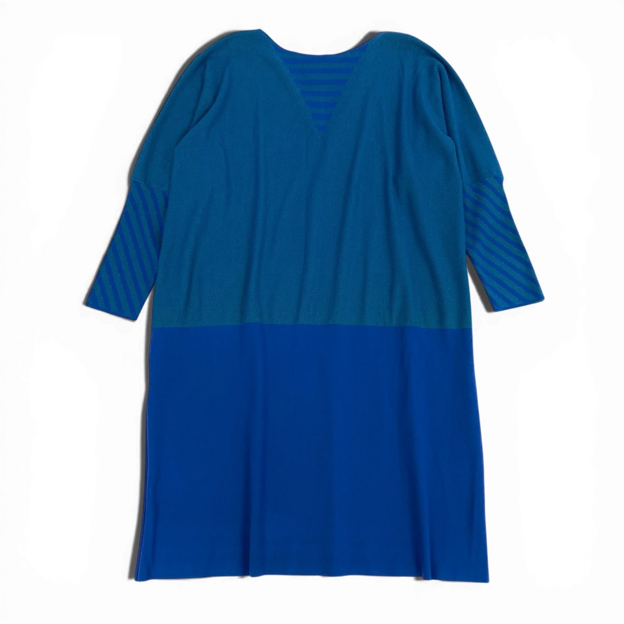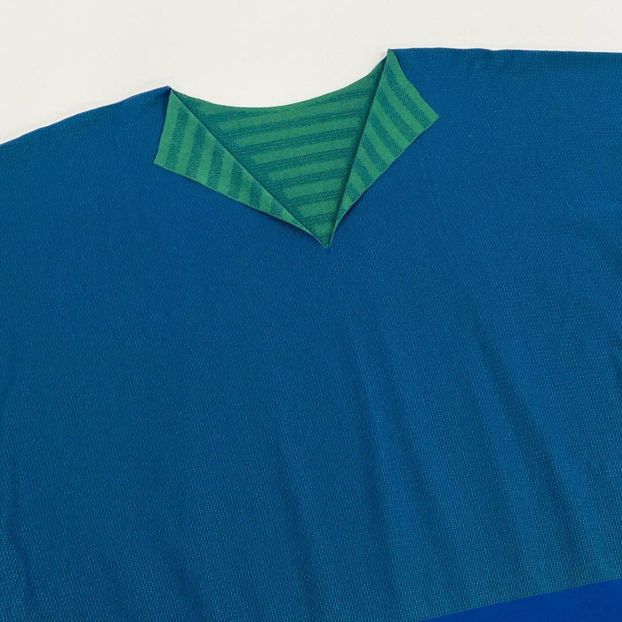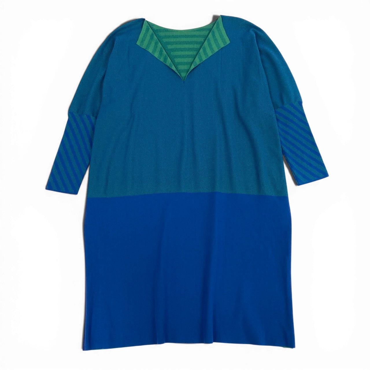 深みのあるブルーとグリーンのバイカラーデザインが印象的なPLEATS PLEASE A.POCのチュニックカットソーです。首元と袖部分にはストライプ柄が配され、立体感のあるデザインアクセントになっています。PLEATS PLEASE特有の軽く伸縮性のあるプリーツ素材で、快適な着心地と美しいドレープを楽しめます。ゆったりとしたオーバーサイズシルエットで、パンツやレギンスと合わせたリラックス感のあるモードスタイルにおすすめの一着です。