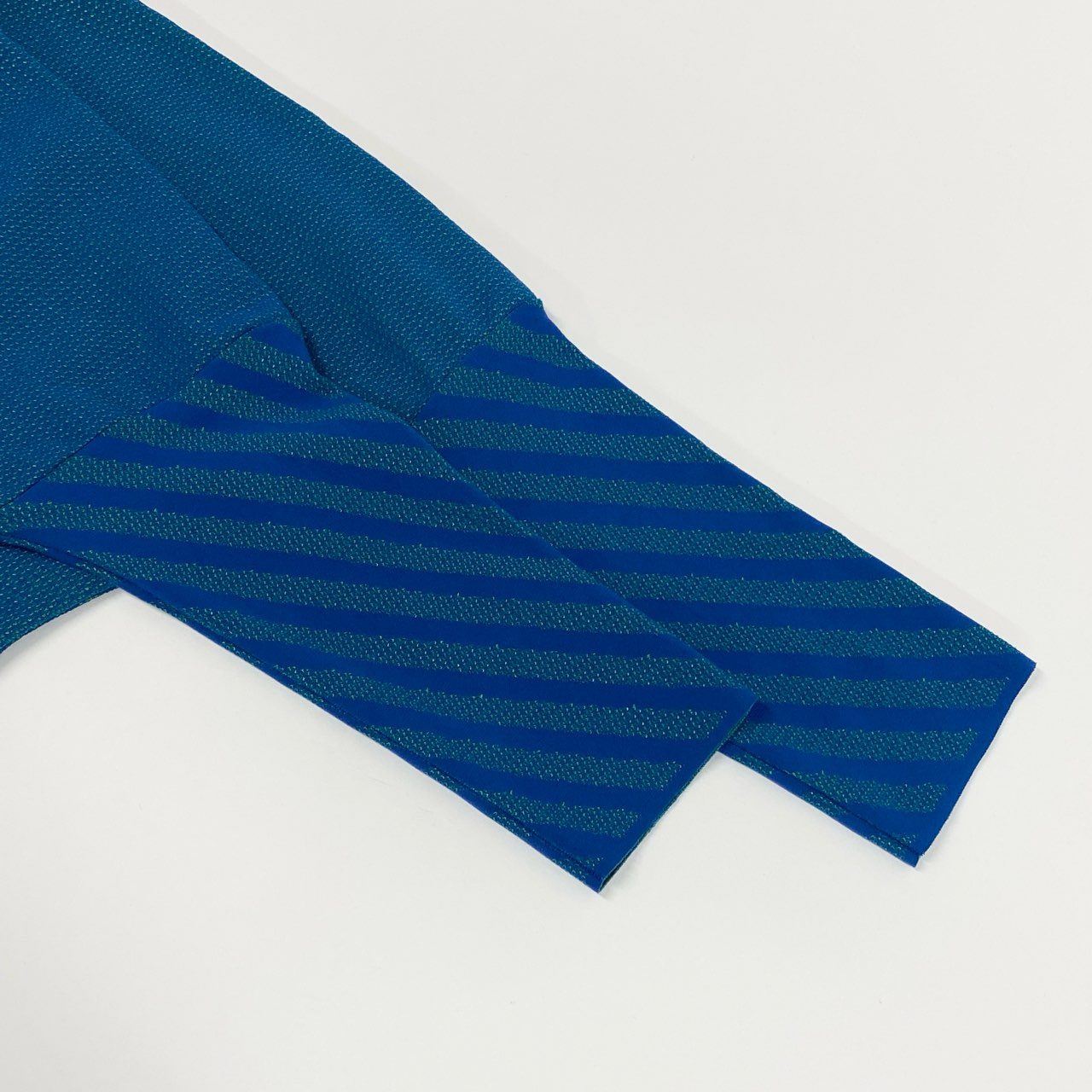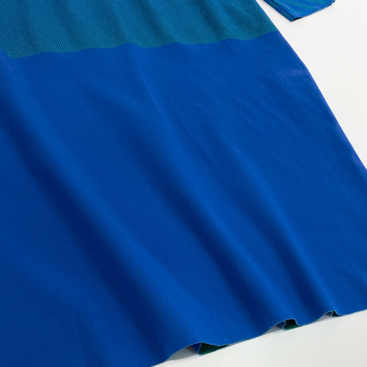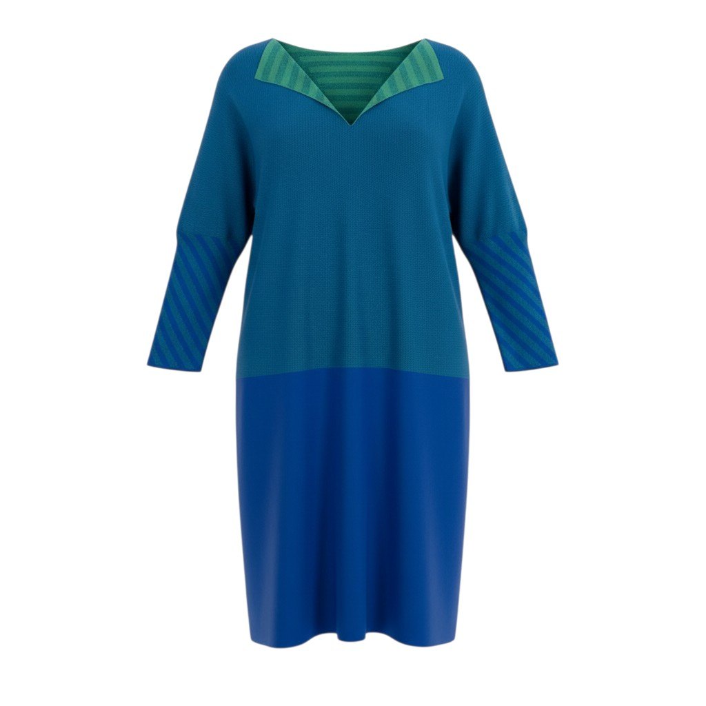 深みのあるブルーとグリーンのバイカラーデザインが印象的なPLEATS PLEASE A.POCのチュニックカットソーです。首元と袖部分にはストライプ柄が配され、立体感のあるデザインアクセントになっています。PLEATS PLEASE特有の軽く伸縮性のあるプリーツ素材で、快適な着心地と美しいドレープを楽しめます。ゆったりとしたオーバーサイズシルエットで、パンツやレギンスと合わせたリラックス感のあるモードスタイルにおすすめの一着です。