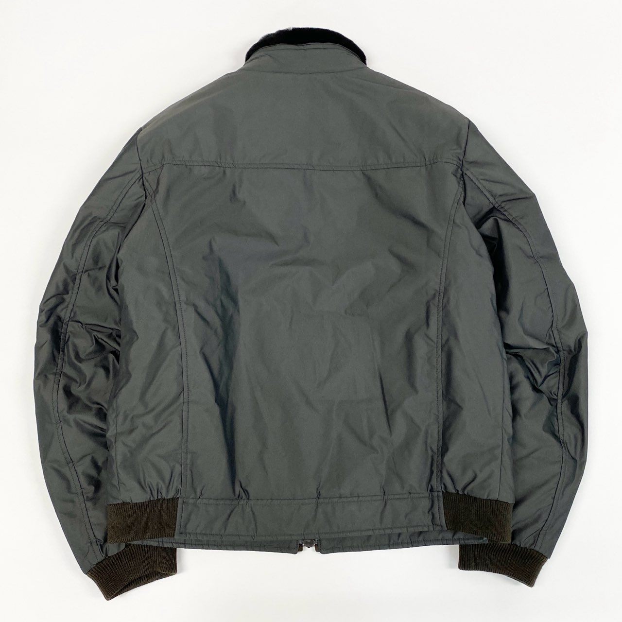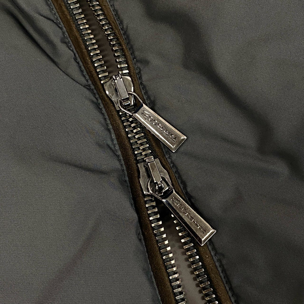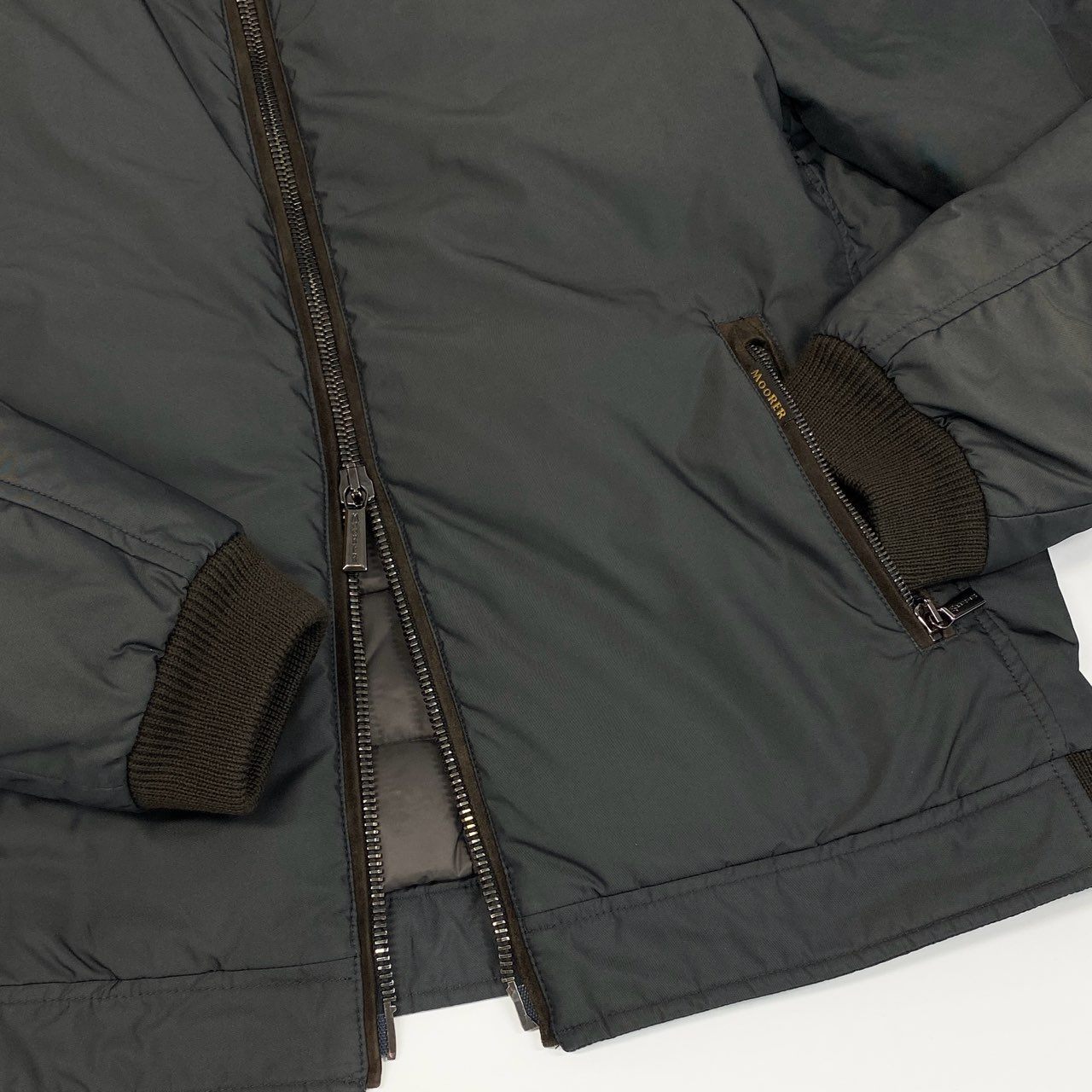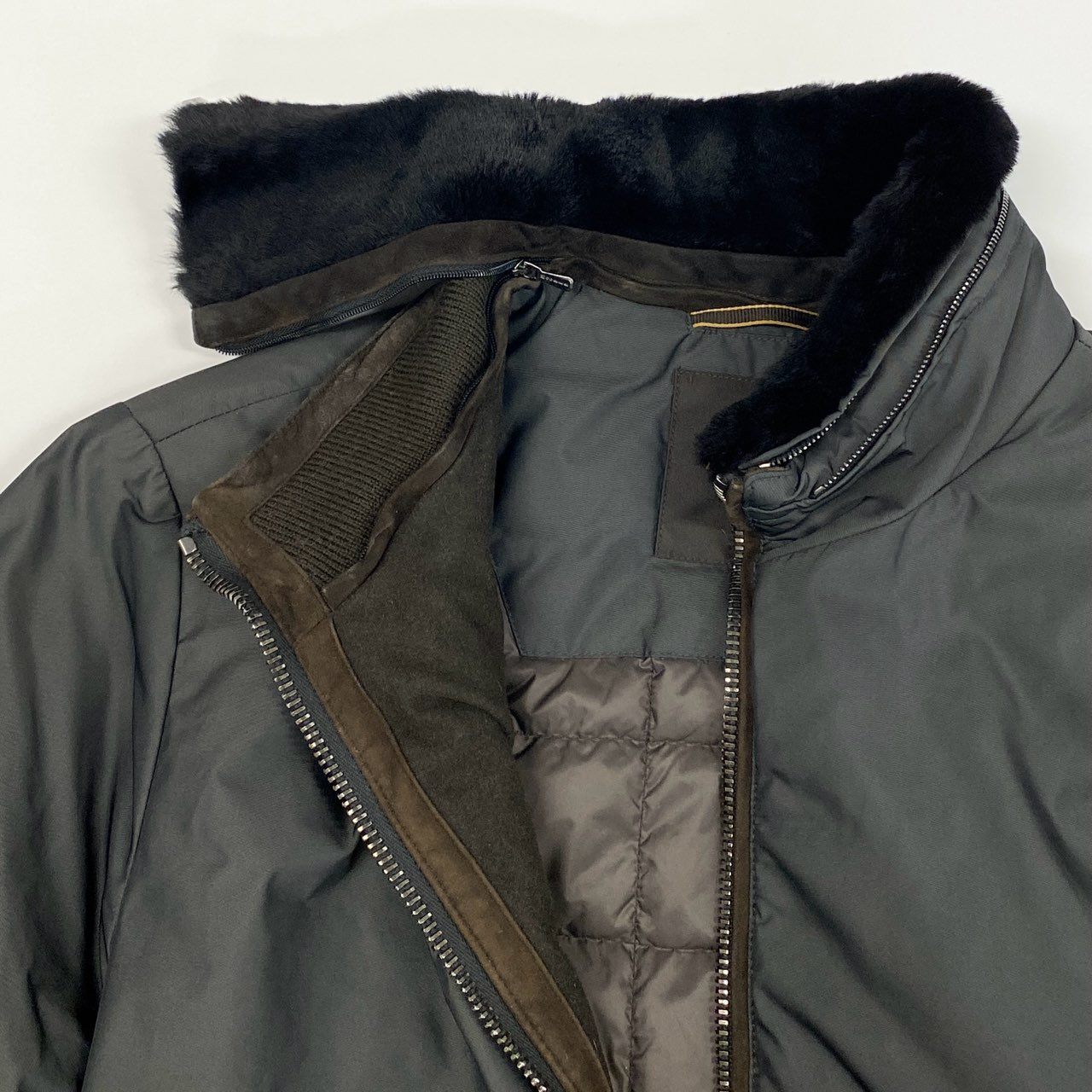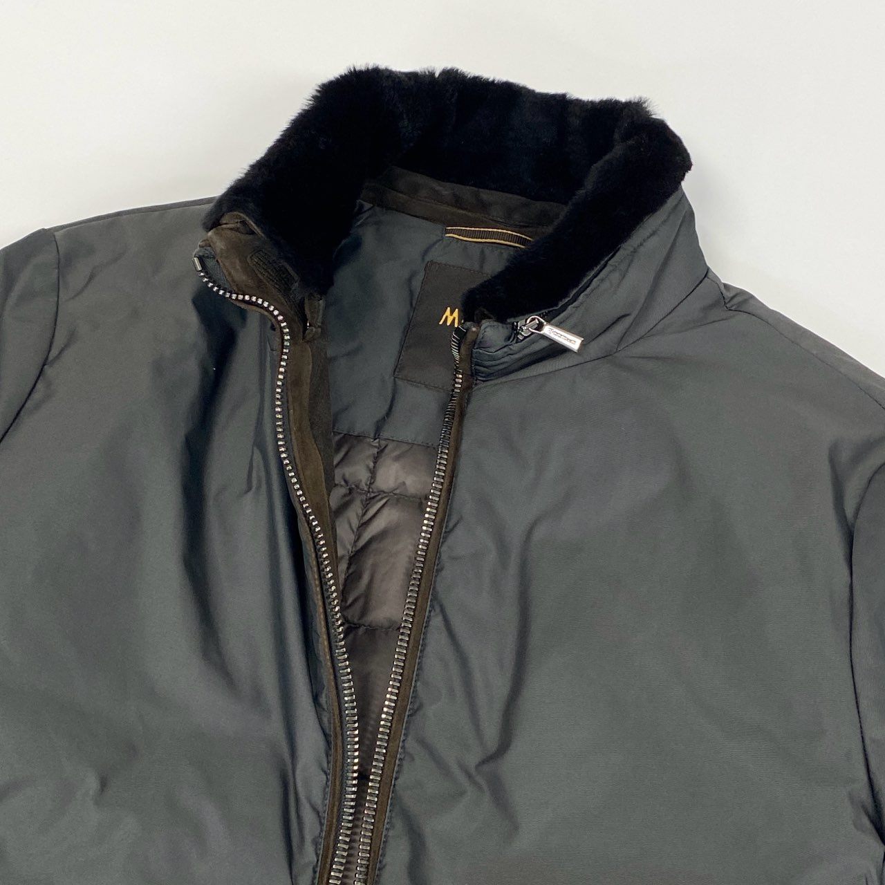 ムーレーの「CELOTTI」モデル、グレーのボンバージャケットです。光沢を抑えたナイロン素材に、襟部分のフェイクファーが高級感を演出。フロントはダブルジップ仕様で、両サイドにジップポケットを配置した実用性の高いデザインです。腰丈のシルエットでスタイリッシュに着こなせ、防寒性と洗練された雰囲気を兼ね備えた一着です。