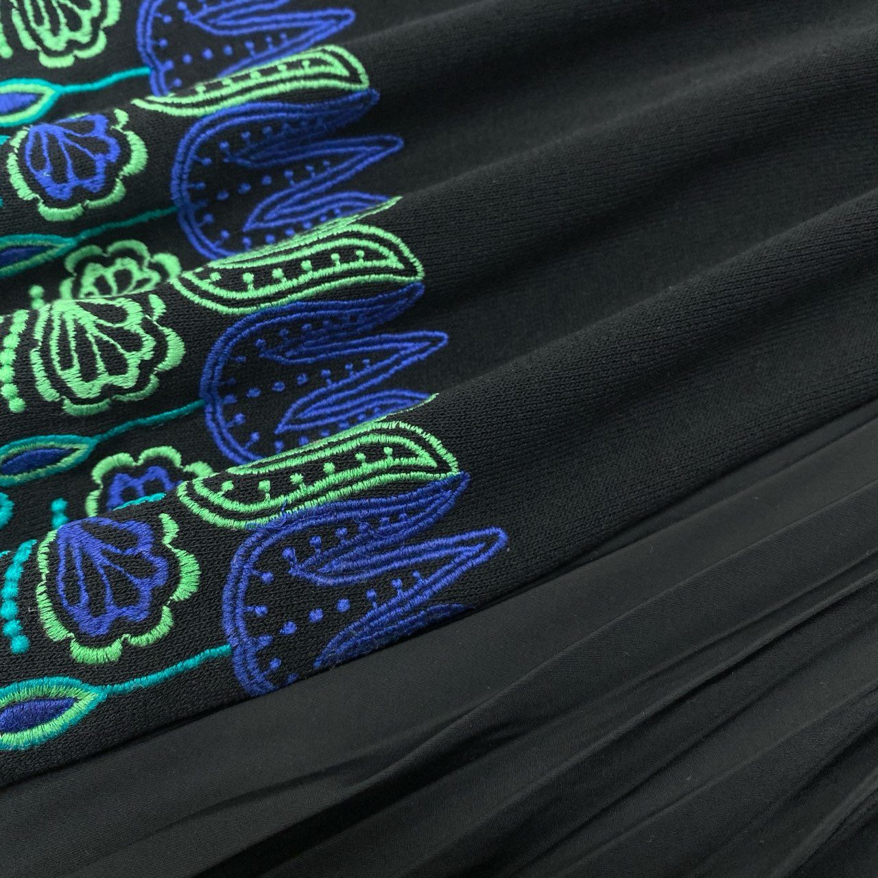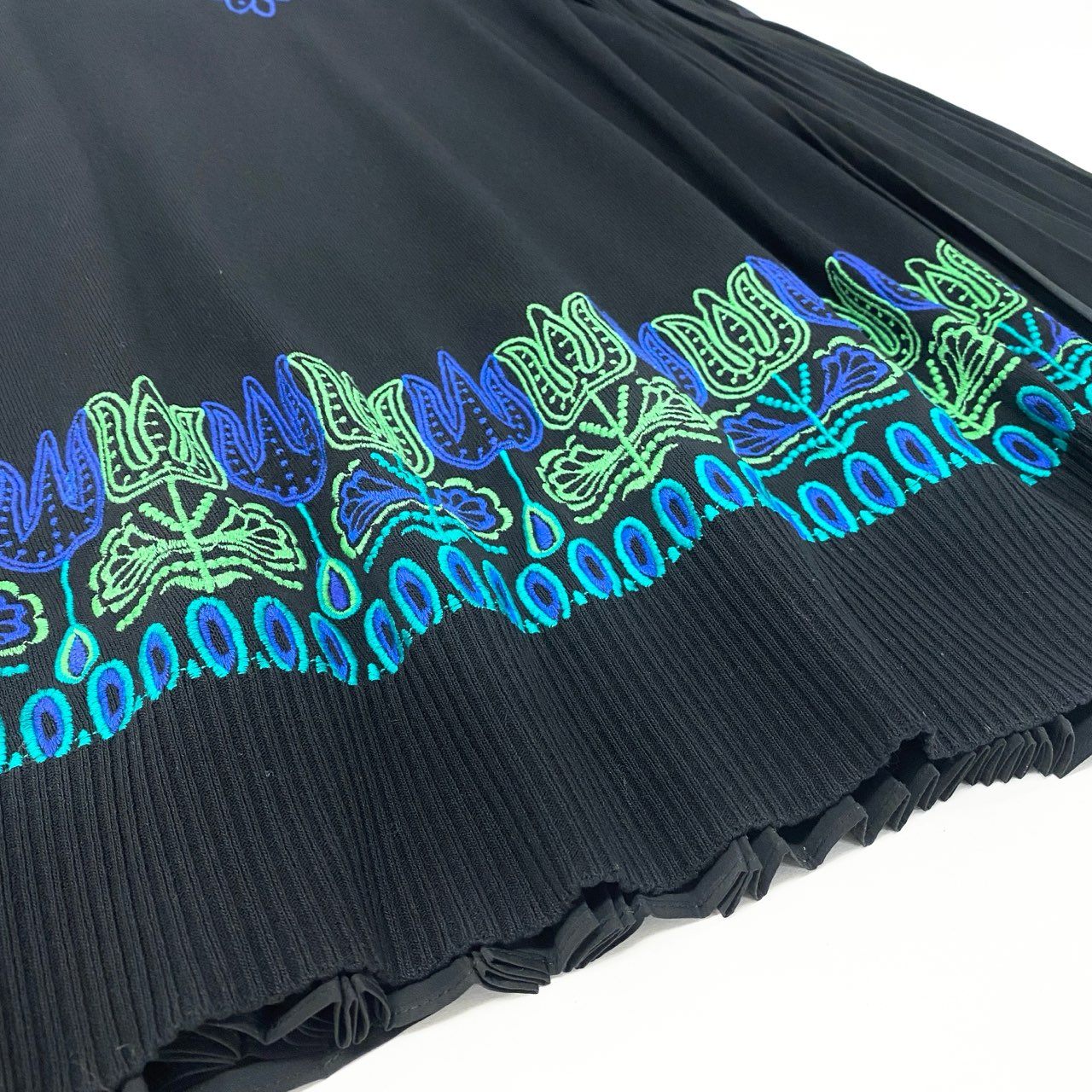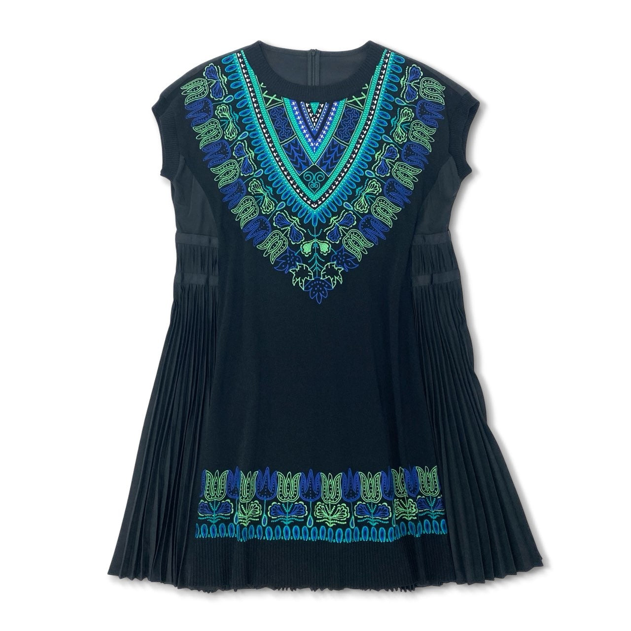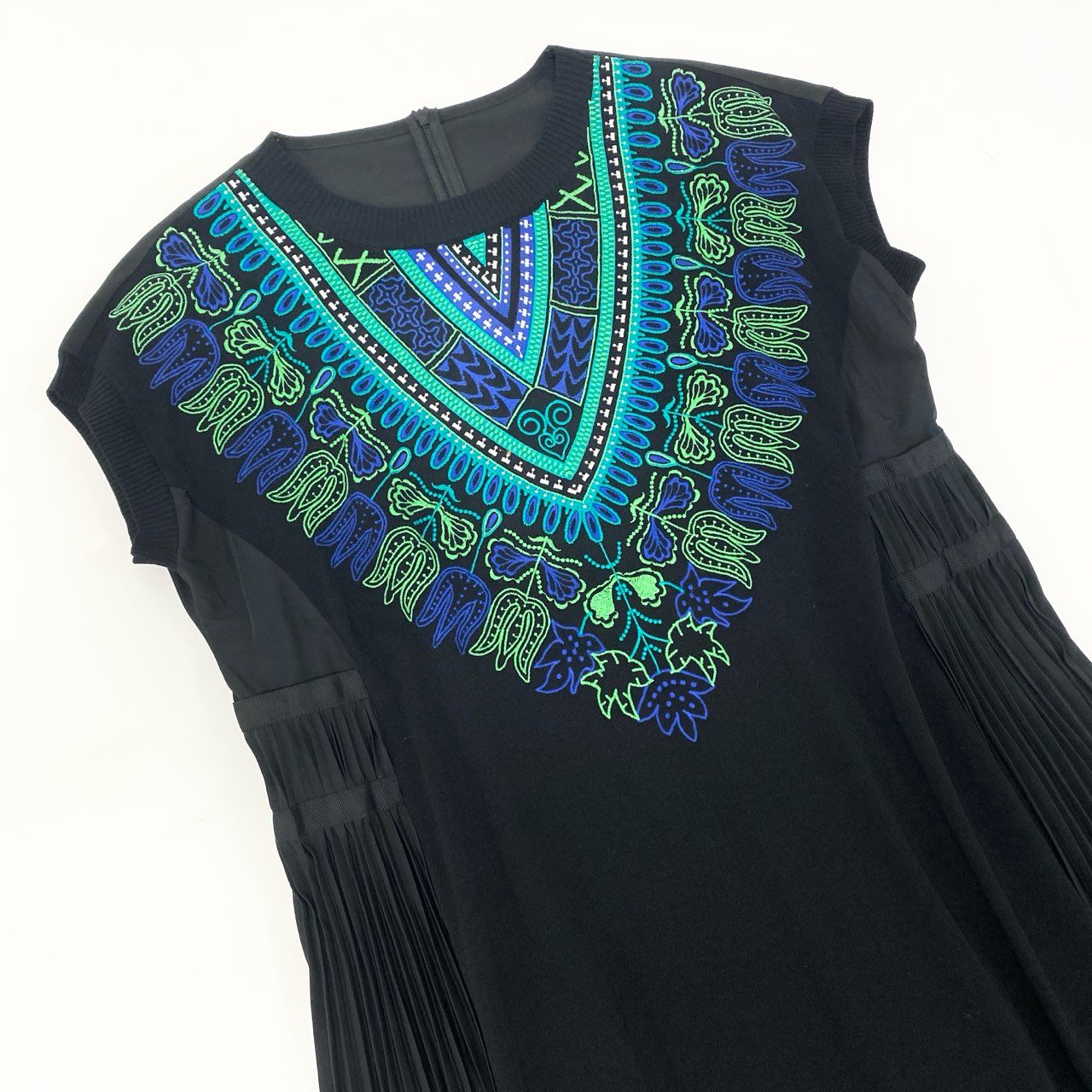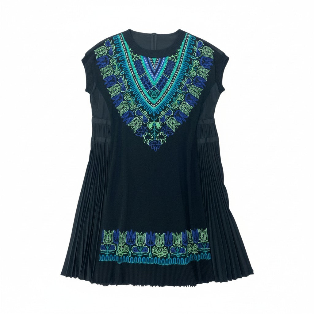 深みのあるブラックをベースに、ブルー×グリーンの刺繍パターンが美しく映えるTOKUKO 1er VOLのニットワンピースです。胸元と裾に施された民族調のカラフルな刺繍がアクセントとなり、1枚で華やかな印象に仕上がります。サイドには細かなプリーツ加工が入り、動くたびに広がる立体的なシルエットが魅力です。柔らかく落ち感のあるニット素材で着心地も軽く、デイリーからお出かけ、ステージ衣装にもおすすめの一着です。