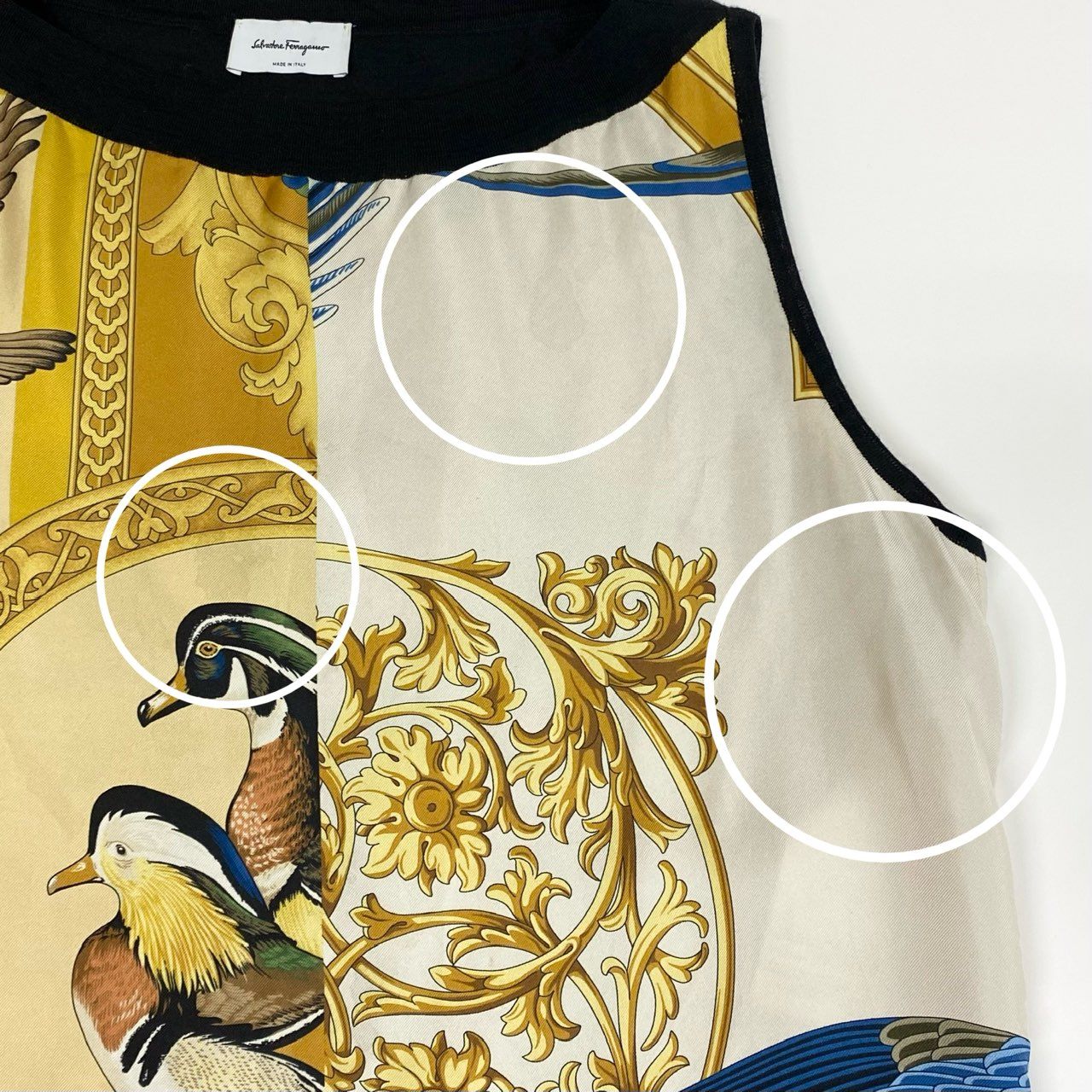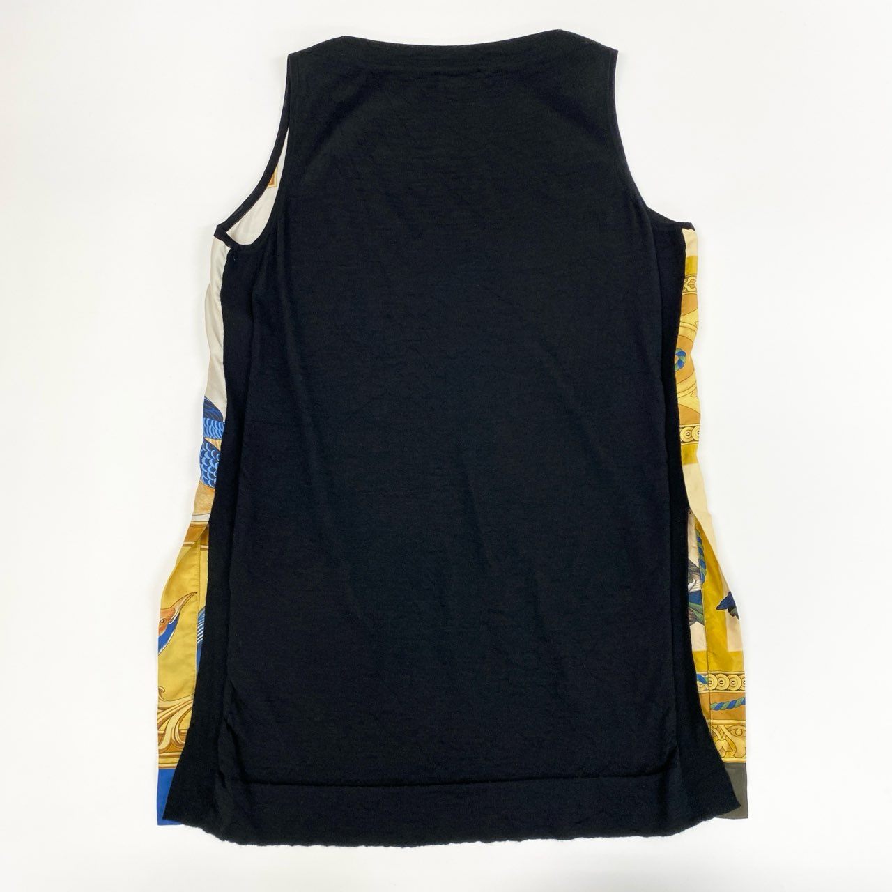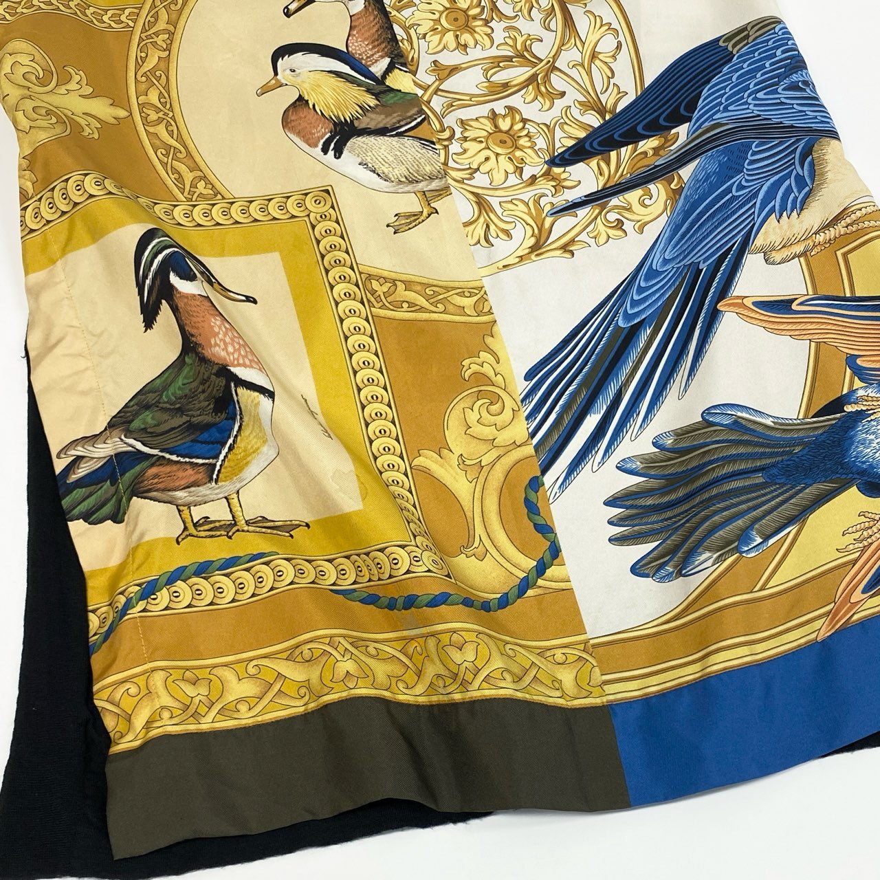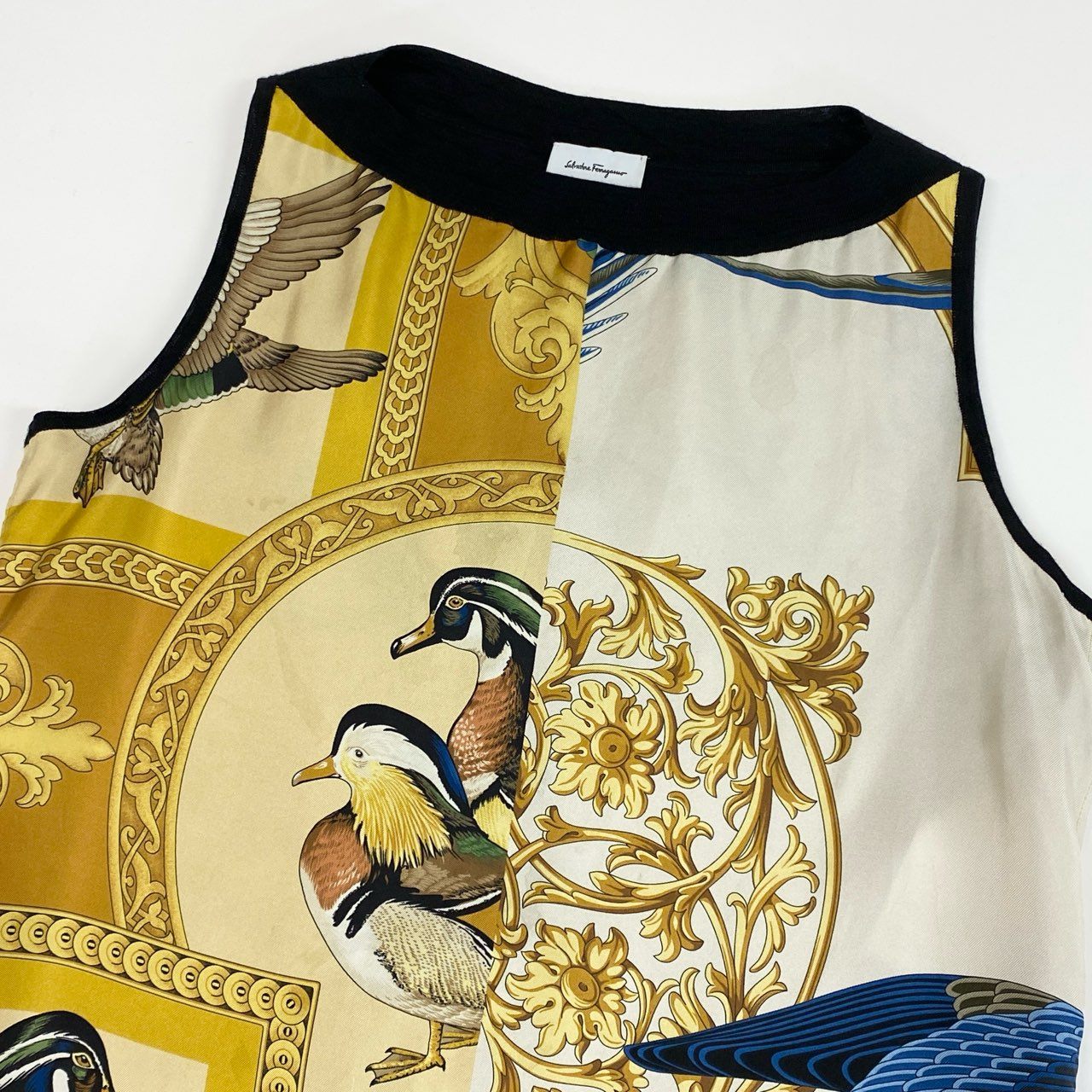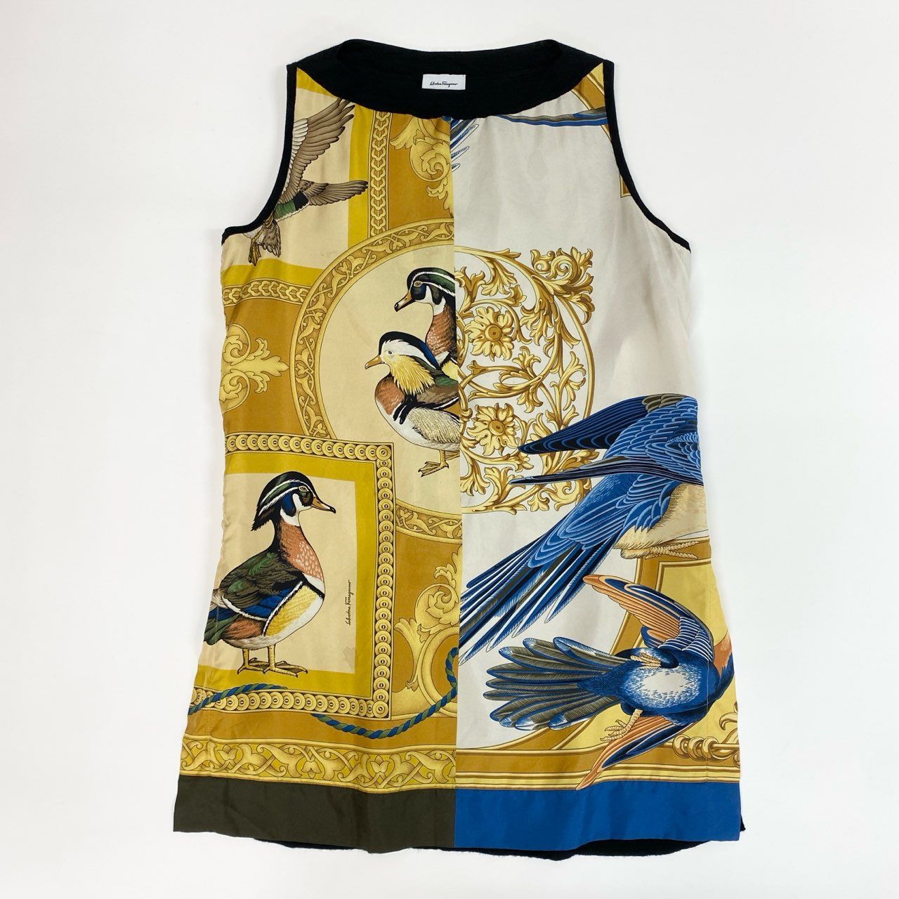 77j8 Salvatore Ferragamo サルヴァトーレフェラガモ イタリア製 ノースリーブワンピース チュニックワンピース ボートネック 異素材切替 鳥柄 レディース 女性用 M ブラック カシミヤシルクu02t